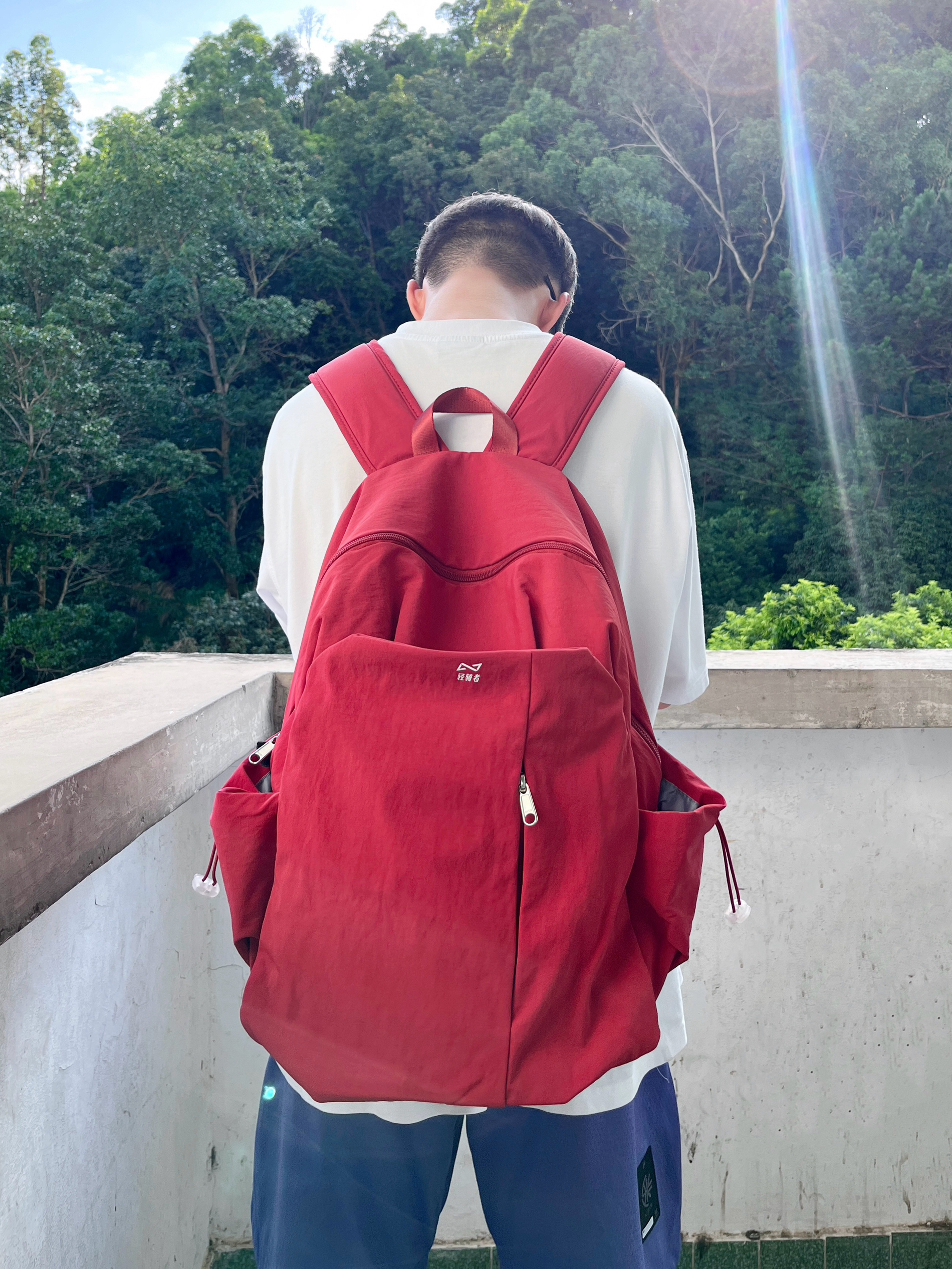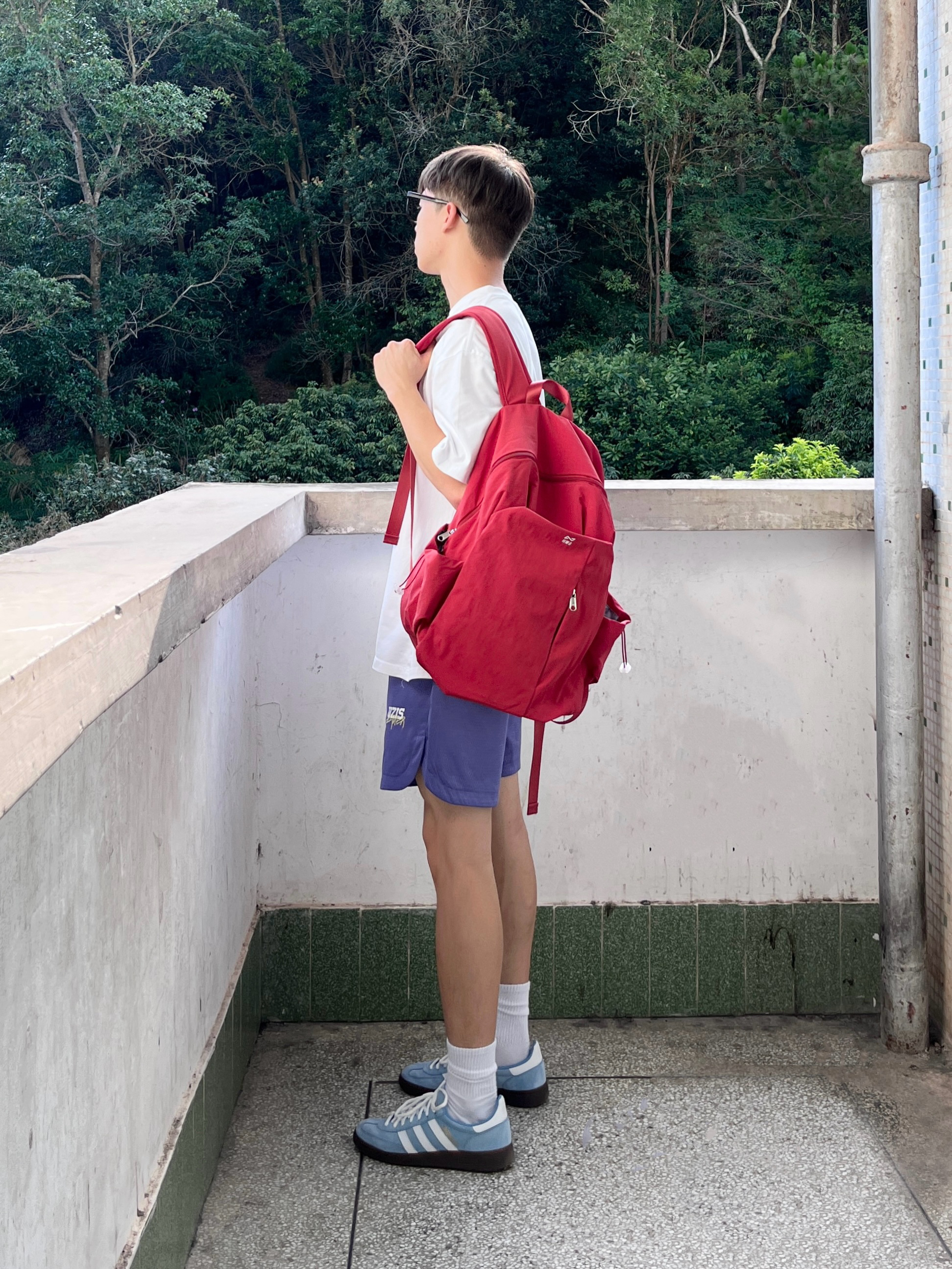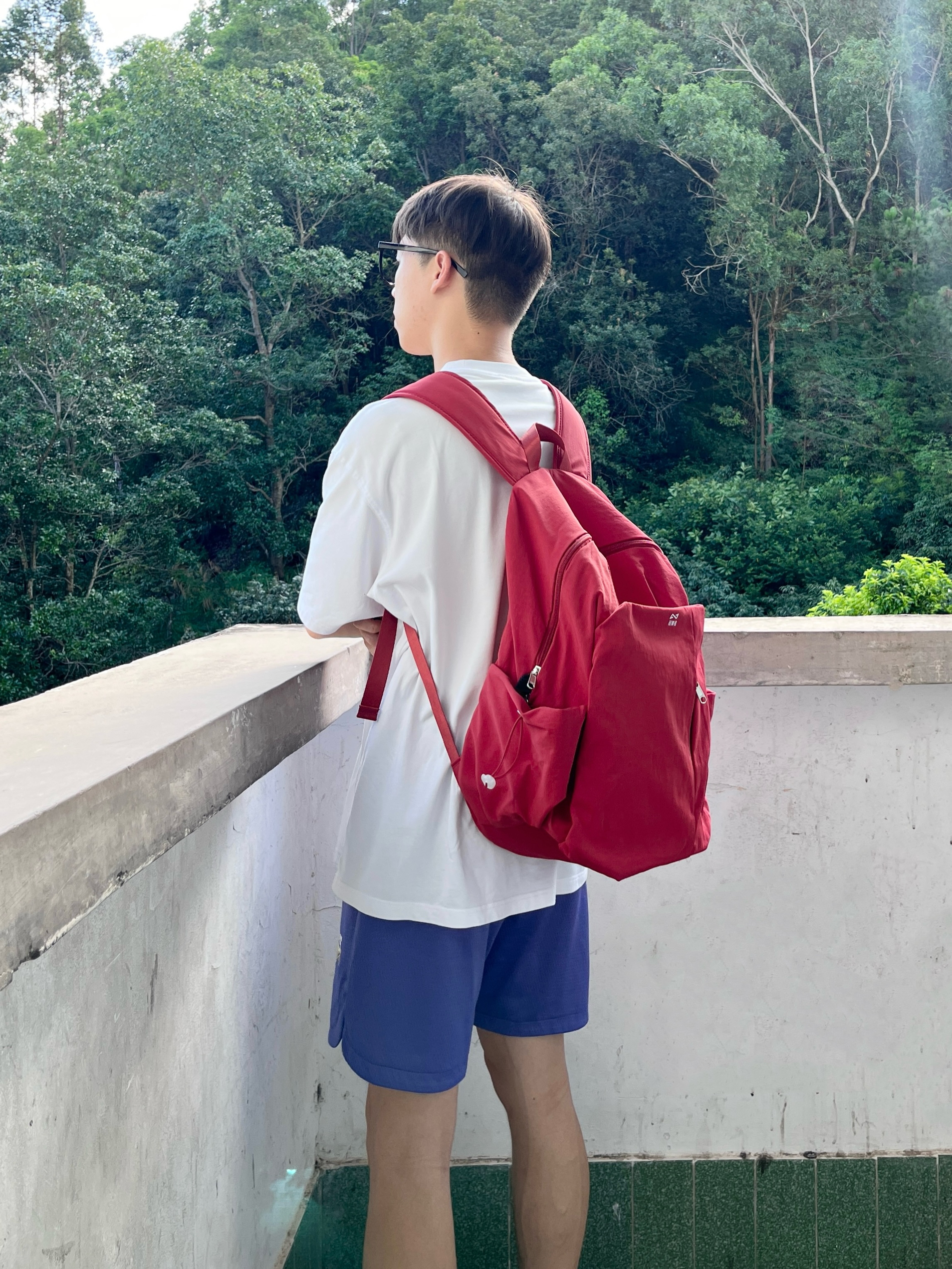 今日份穿搭分享look👀 衣服是白色的简约复古风T恤 搭配一条紫色休闲工装短裤 背的是 轻骑者 家的红色潮流双肩包🎒 颜值简约时尚 内部容量也很大 无论是日常通勤还是运动休闲都很合适 背上去真的少年感满满🥰 最后休闲德训鞋上脚点缀 一套搭配下来 百搭又好看