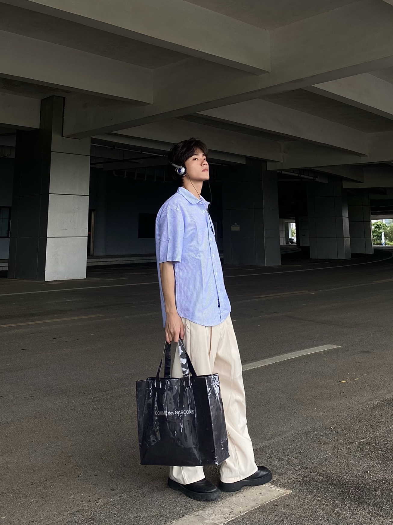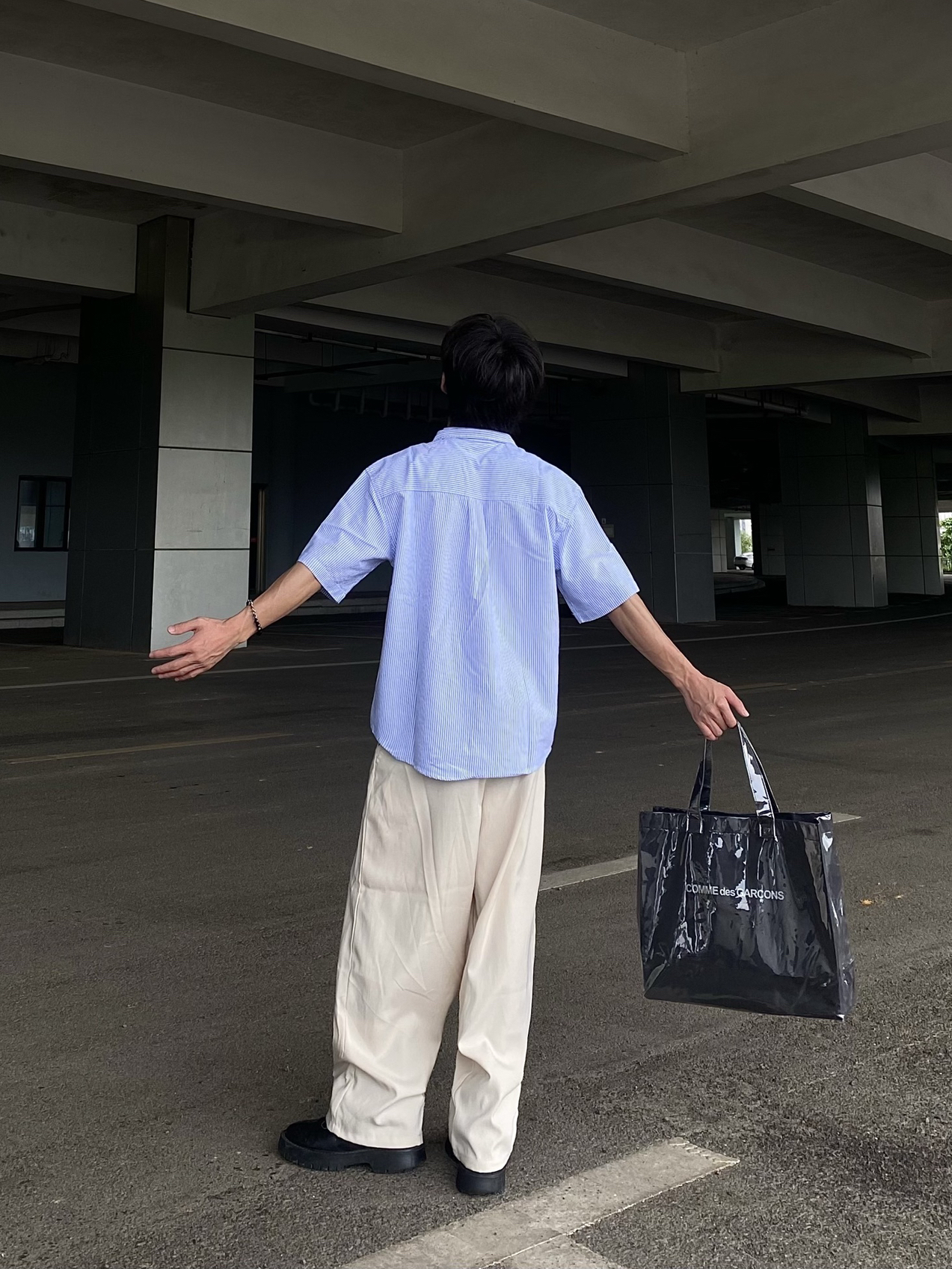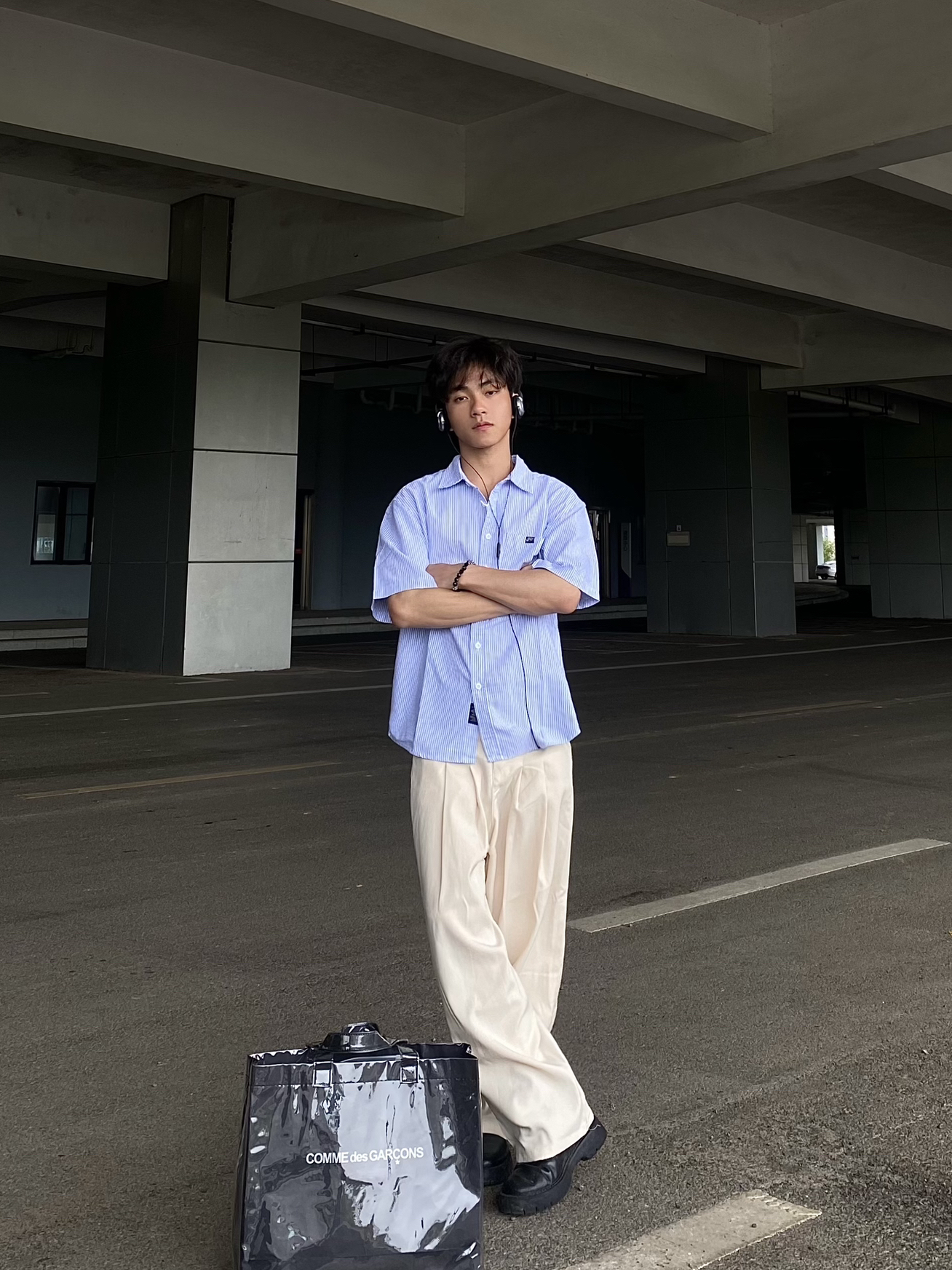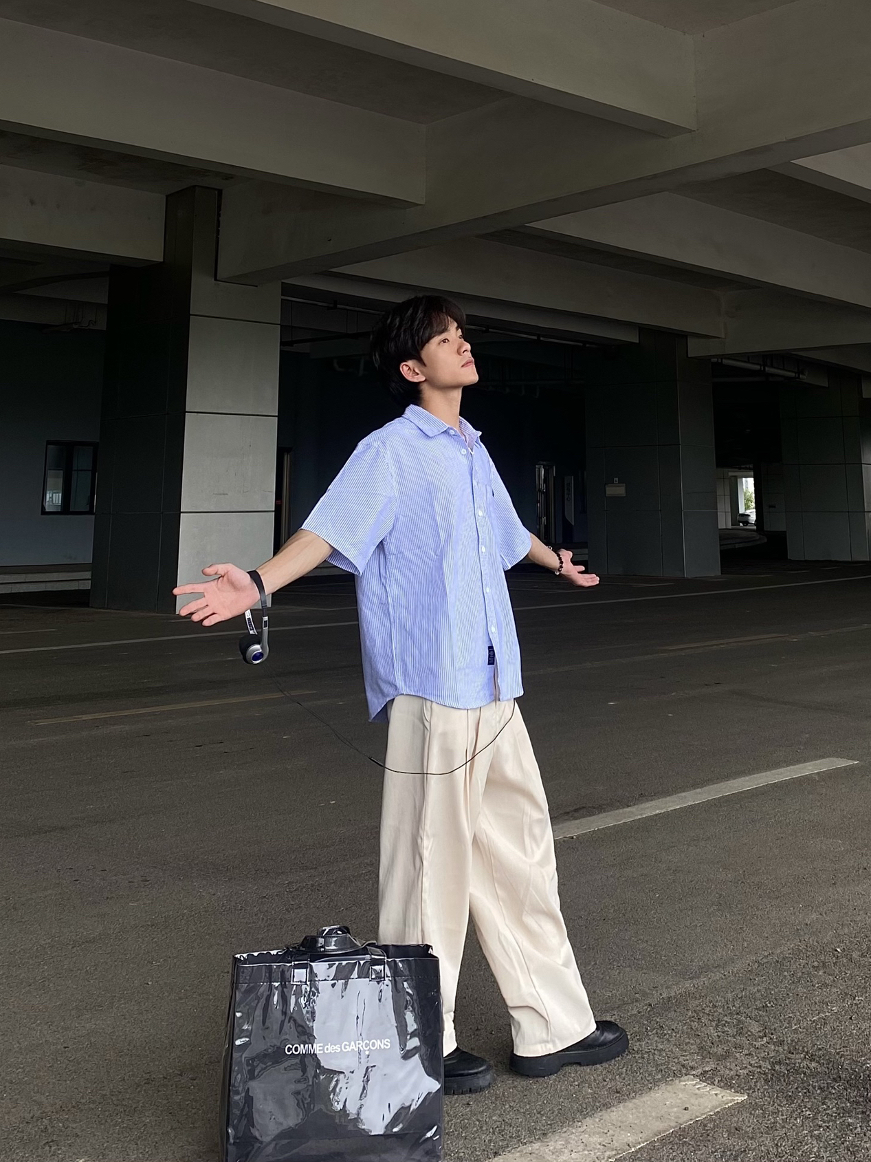 今日穿搭分享: 1⃣️上衣我们选择的是一款蓝色的半条纹短袖衬衫,衬衫颜值很高,上身效果宽松舒适,妥妥的韩系男主感! 2⃣️裤子我们选择的是一款卡其色的休闲宽松西裤,这款西裤版型宽松,可以遮住鞋子,非常显瘦显高,百搭类型,喜欢的铁子们快来抄作业❗️