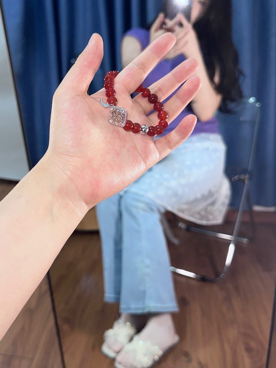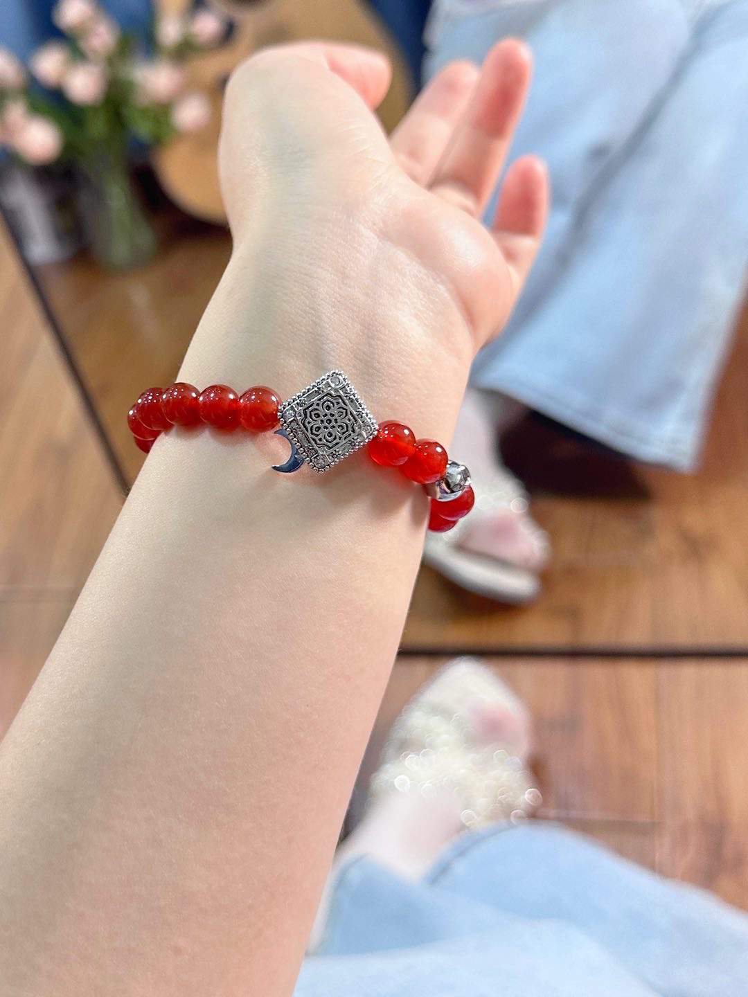今年hin喜欢一些红色的东西 显得皮肤白白的 还hin有中国🇨🇳气息^_^ 今天戴这个 Aurozia 的红色玛瑙手链,手链中间是一个太阳莲花,旁边还有月亮🌙,象征美好的寓意 戴在手上精致又漂亮