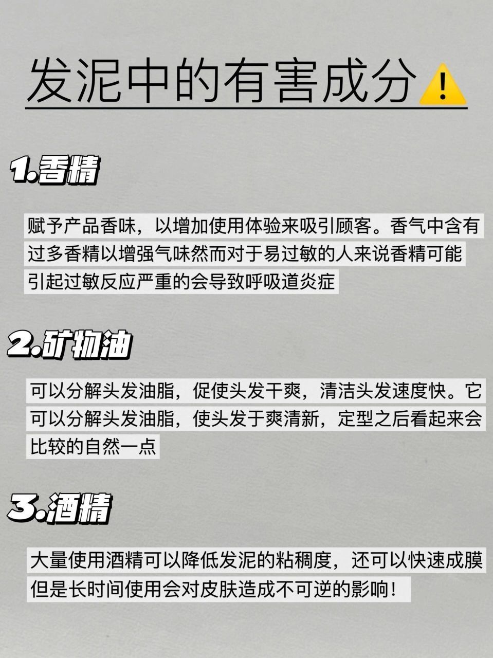 我真的劝告一句:市面上那些的“发泥推荐、发泥推荐好用、发泥测评、新品发泥”别再跟风乱买了!买发泥之前千万要看好成分! 发泥中的有害成分! 1香精 赋予产品香味,以增加使用体验来吸引顾客。香气中含有过多香精以增强气味然而对于易过敏的人来说香精可能引起过敏反应严重的会导致呼吸道炎症 2.矿抗油 可以分解头发油脂,促使头发干爽,清洁头发速度快。它可以分解头发油脂,使头发于爽清新,定型之后看起来会比较的自...