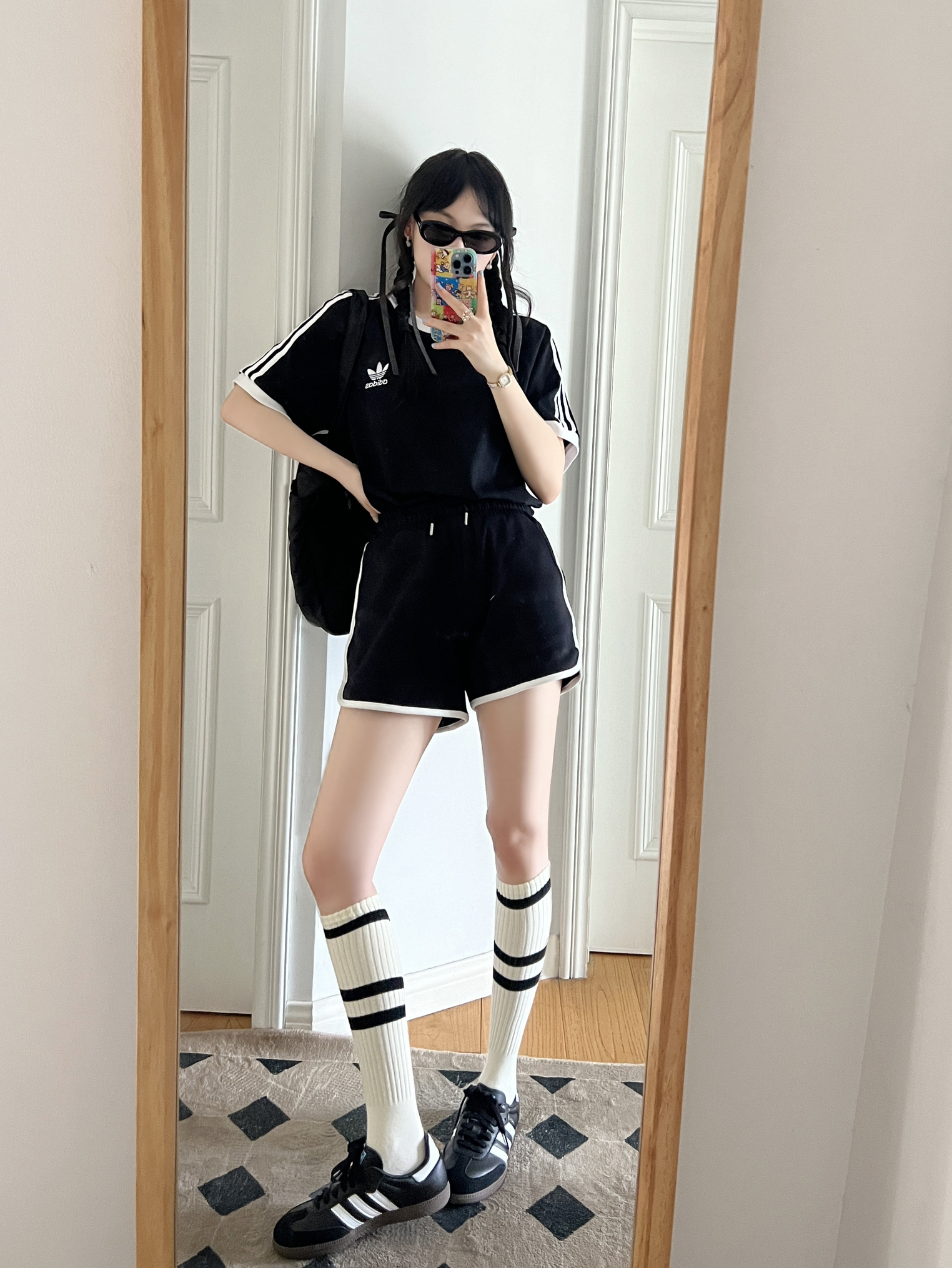 美式复古黑色T恤⚫️➕黑色休闲裤🖤 搭配黑色samba好酷哦🆒 再加上黑色猫眼墨镜🕶️尊滴很帅 all black就是简单又不会出错👀
