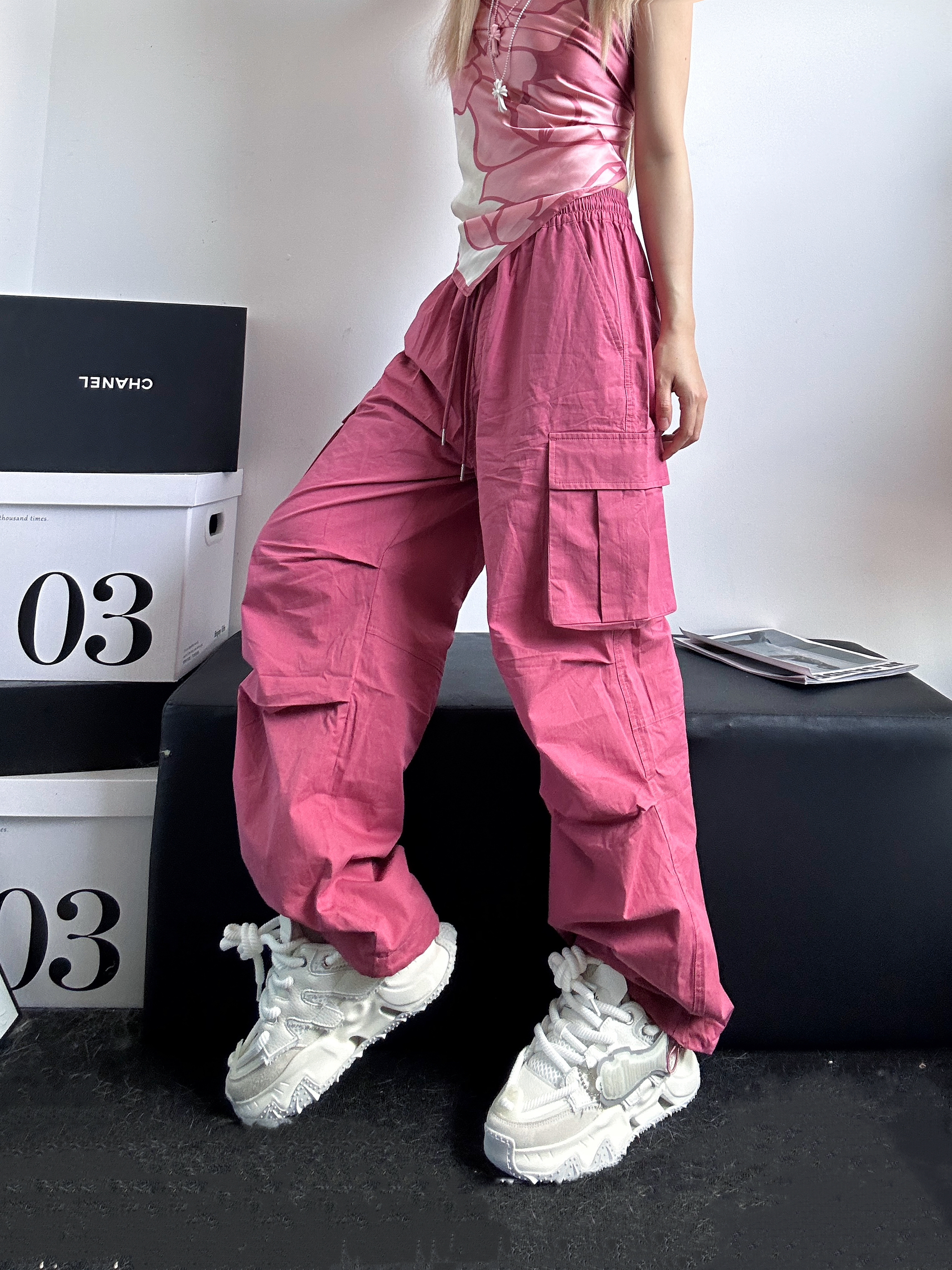 今天是一套玫红色系look 上身丝巾当抹胸 特别适合辣妹夏天哦 搭配同色系工装裤 多口袋设计 帅气十足 这个颜色也很显白 不管男女穿都很帅! 最后搭配一双白色系老爹鞋 厚底增高 矮子星人真的超爱 侧面还有一个飞鱼硅胶 立体设计 超酷的这套!