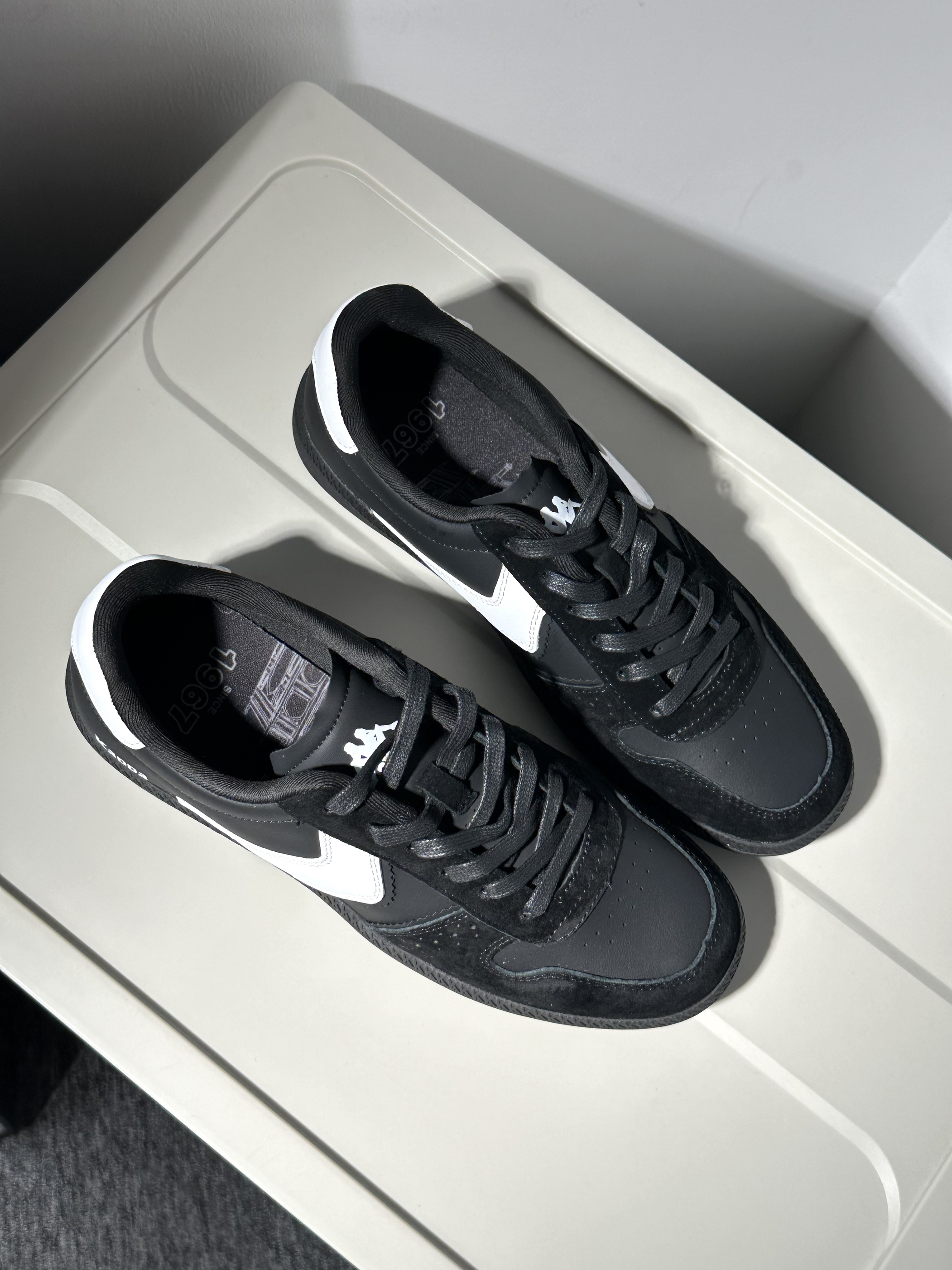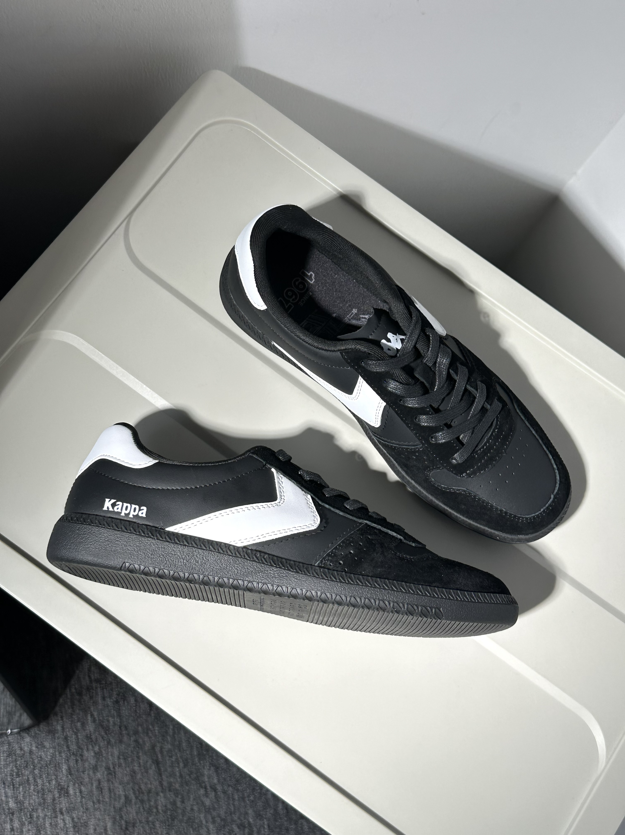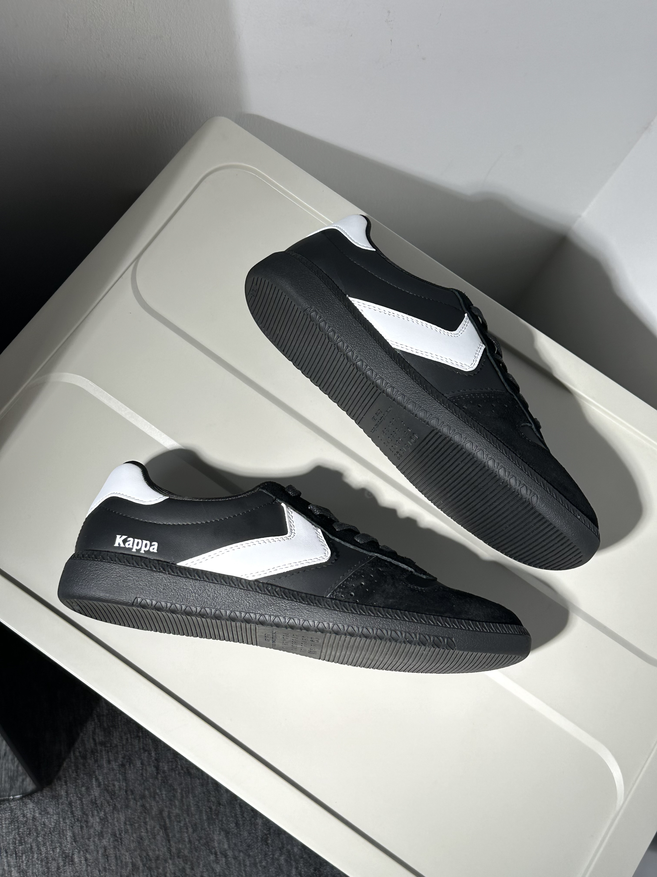 🍒配色:最近种草了这双kappa的黑白色小板鞋~简约耐看又很精致百搭!虽然是黑白色,但是鞋型设计很棒,上脚秀气还修饰脚型~ 🍒材质:鞋面也是用到麂皮拼接光面皮,质感很也很棒,很精致的感觉,可以搭出高级感✨ 🍒脚感:软软糯糯的小板鞋脚感~通勤出街都很舒服,做的也挺轻的,不累脚🏖️ 🍒尺码:正码选择就行~🧀