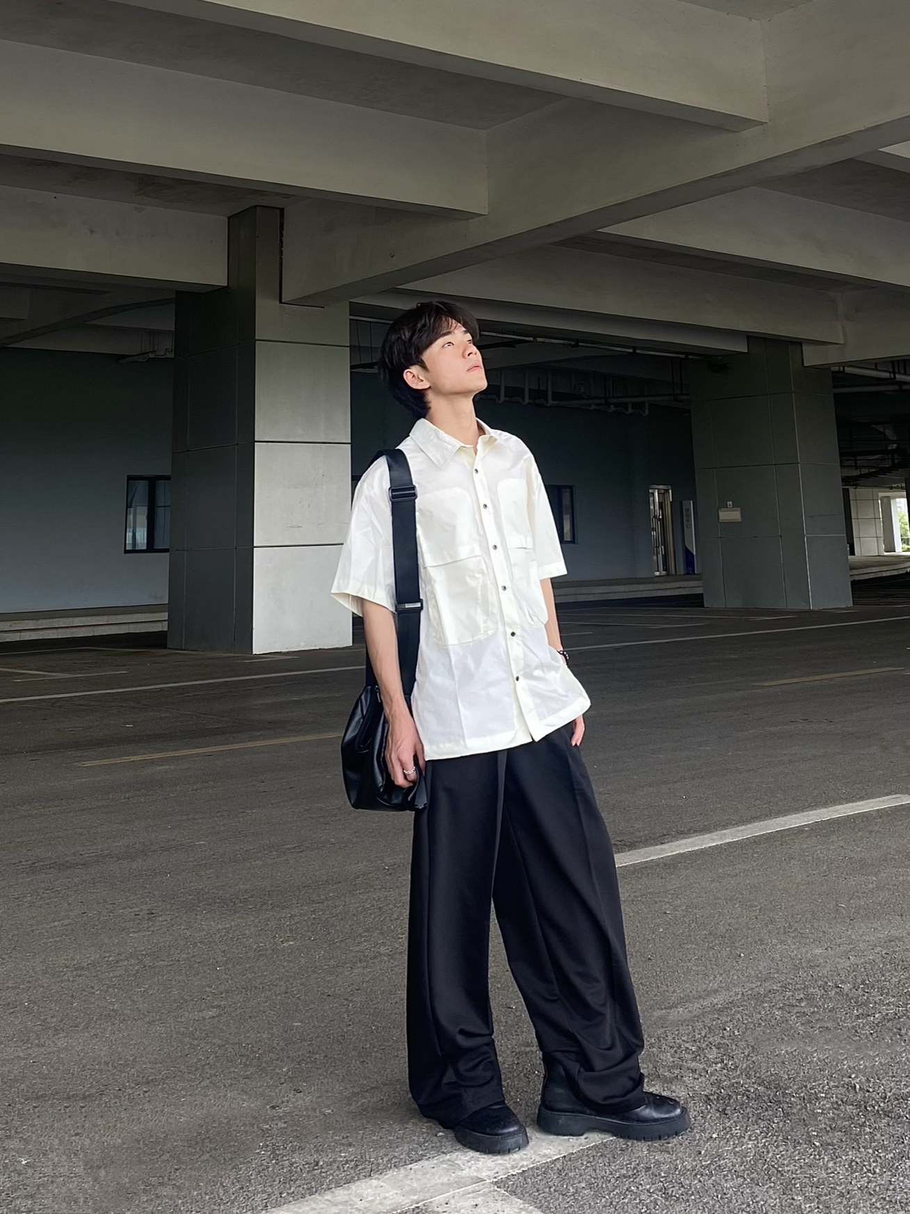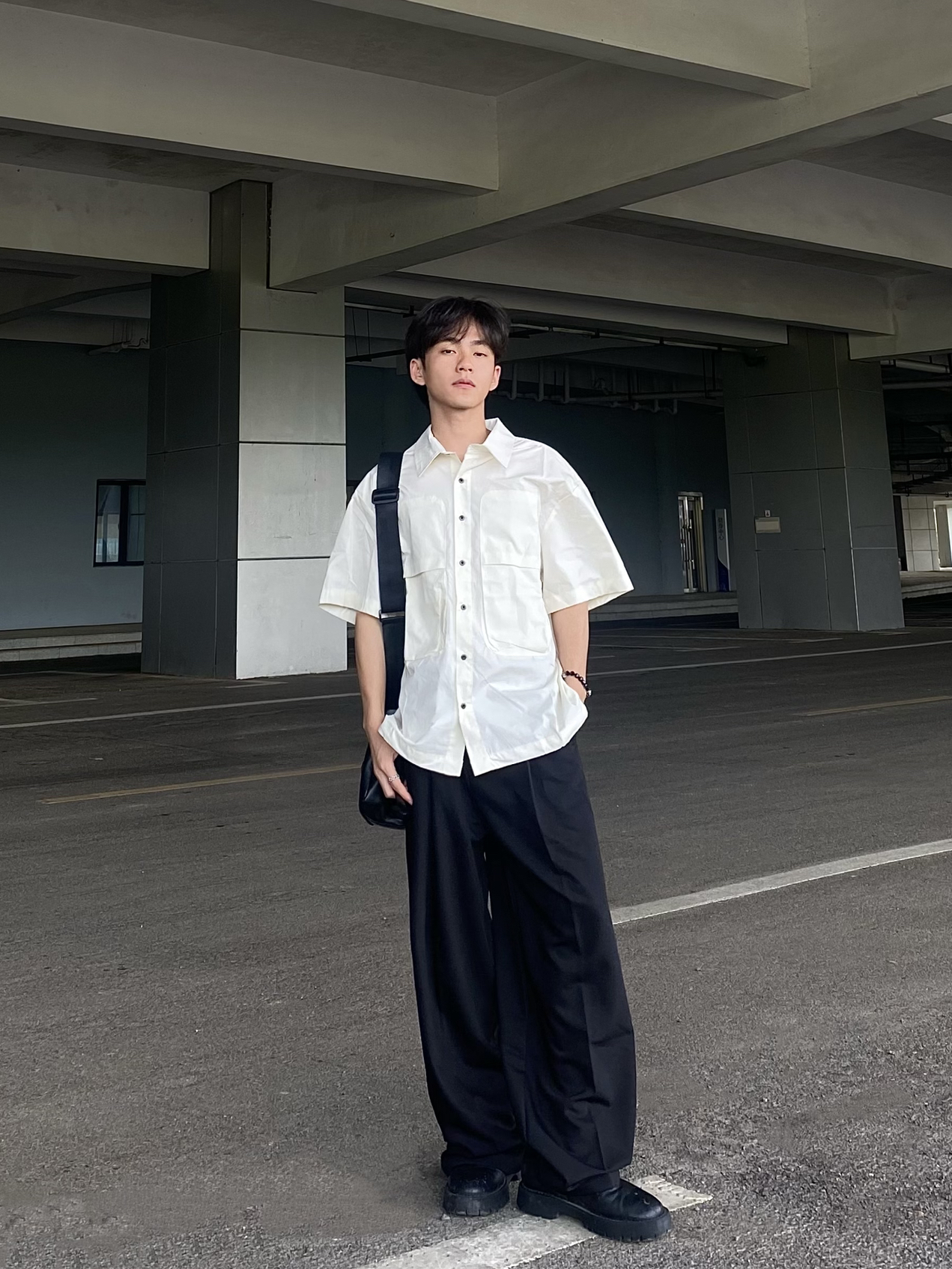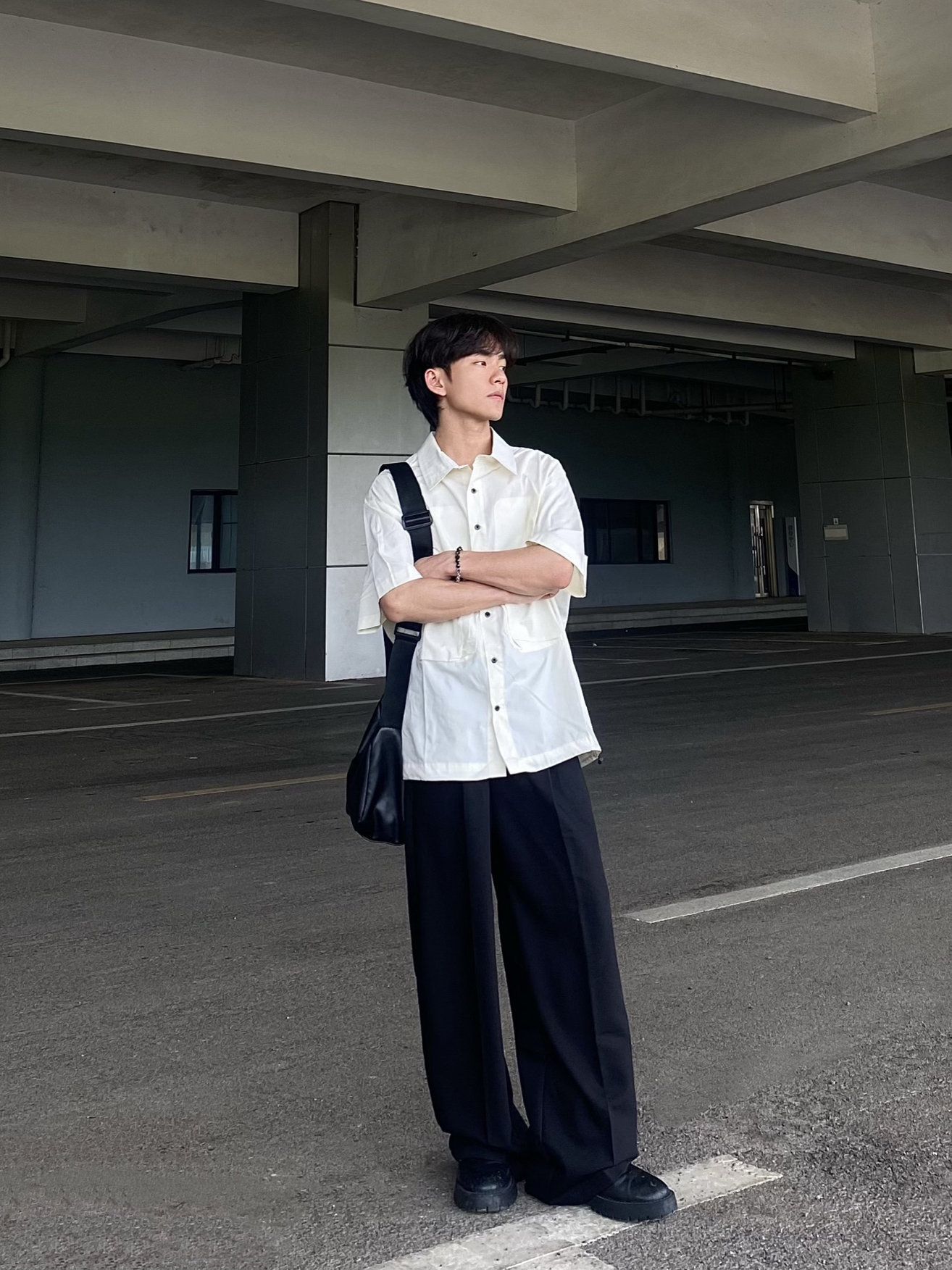 今日穿搭分享: 1⃣️上衣我选择的是一款米白色的日系纯棉休闲短袖衬衫,这款衬衫版型宽松显瘦,上身效果非常好,满满的日系少年感气息! 2⃣️裤子我选择的是一款黑色的美式休闲垂直感西裤,裤子版型我非常喜欢,面料柔软舒适,上身效果简直不要太舒服了,真心推荐,兄弟们可以直接抄作业❗️