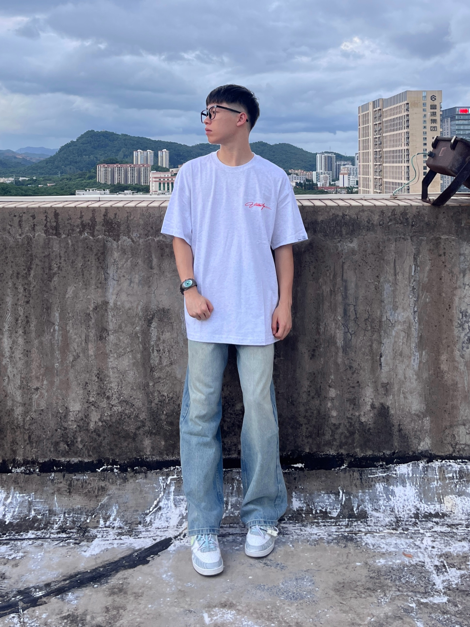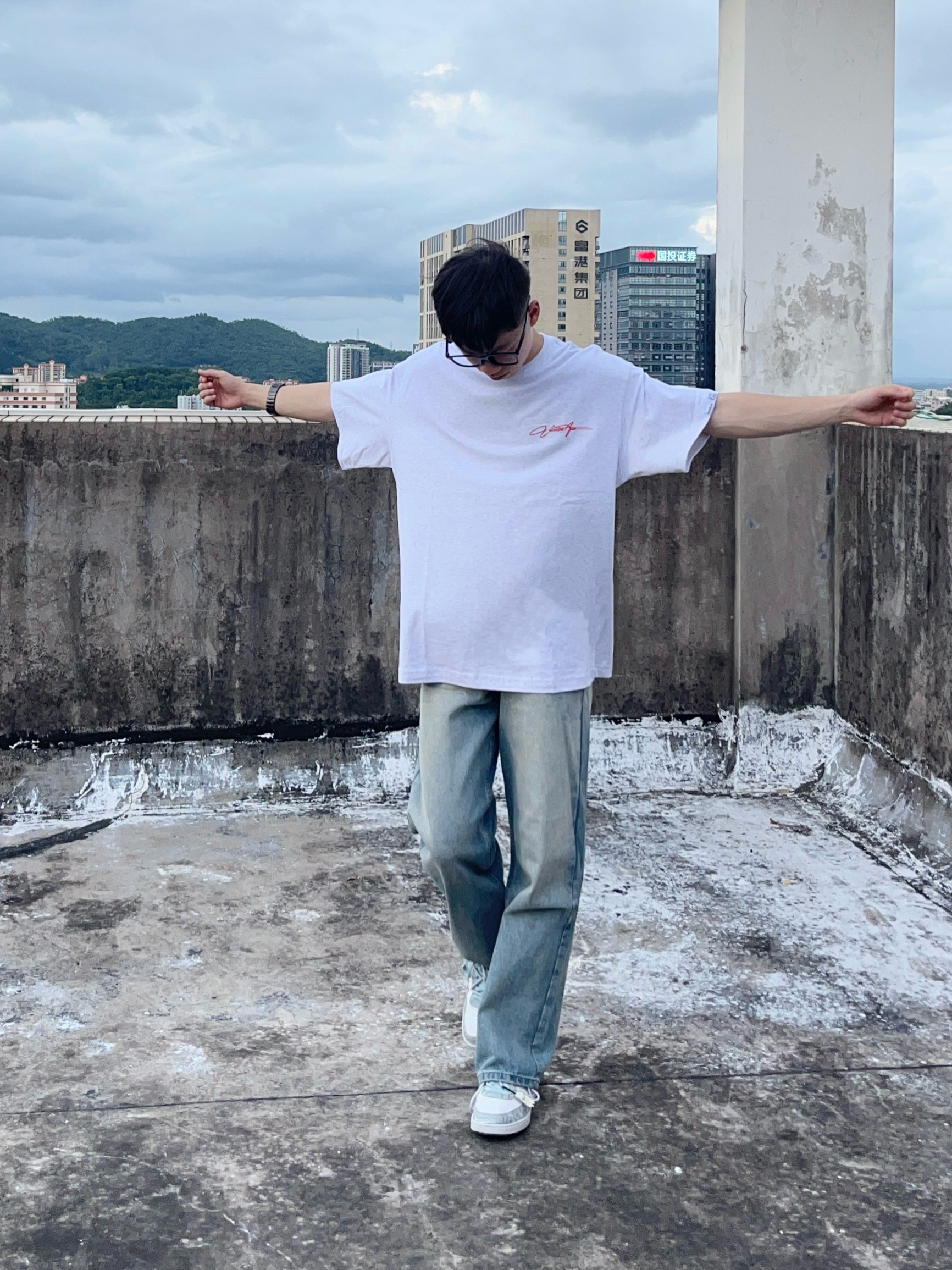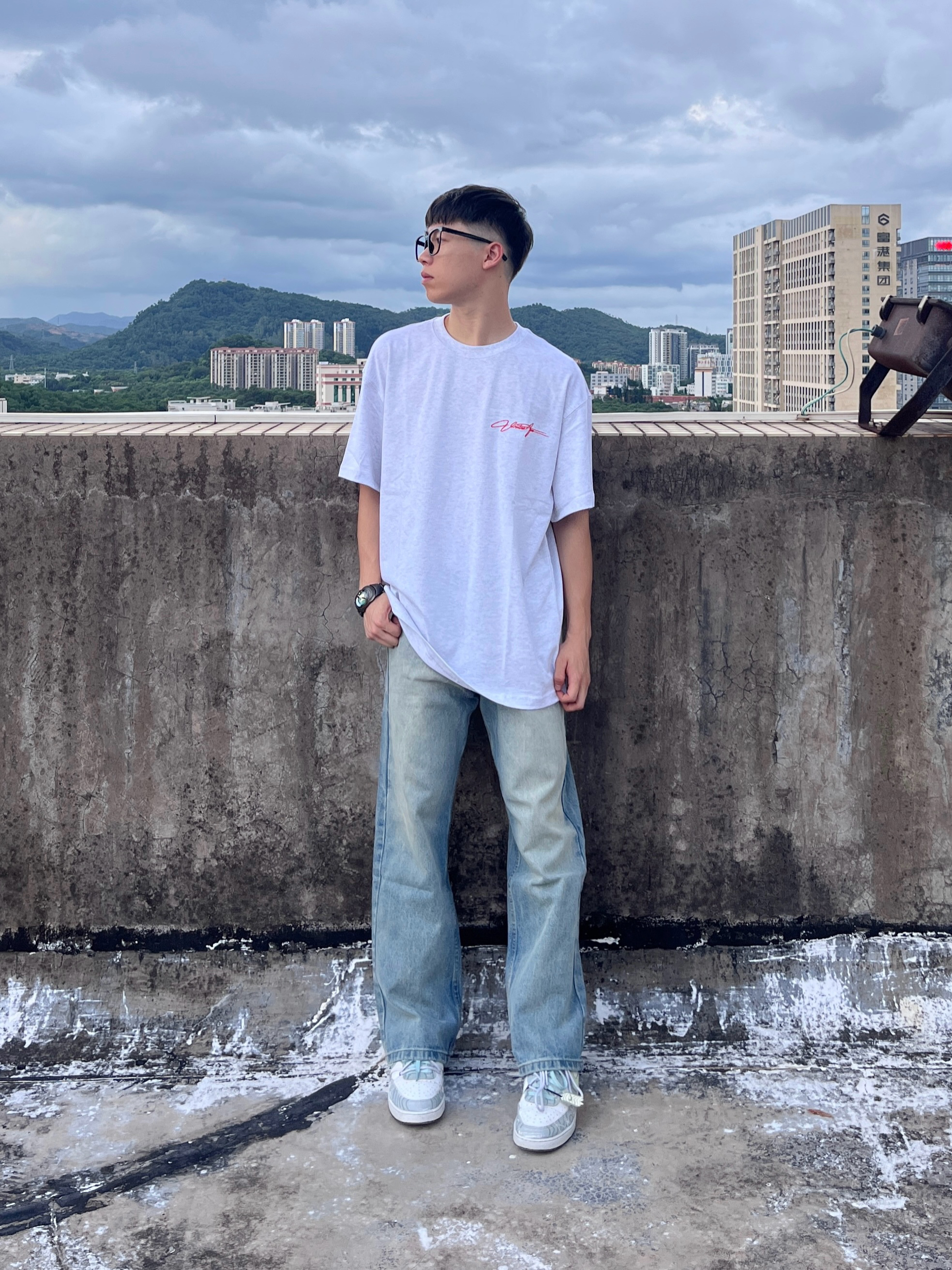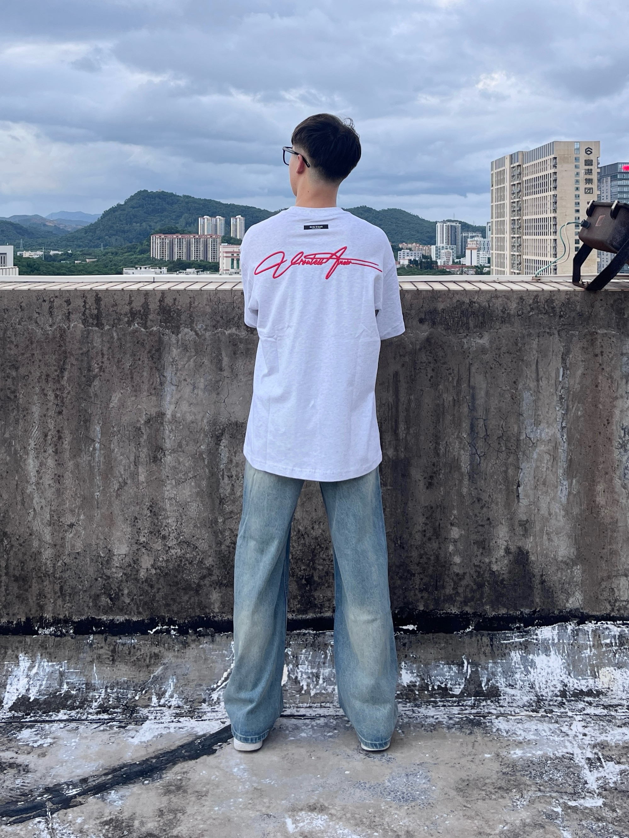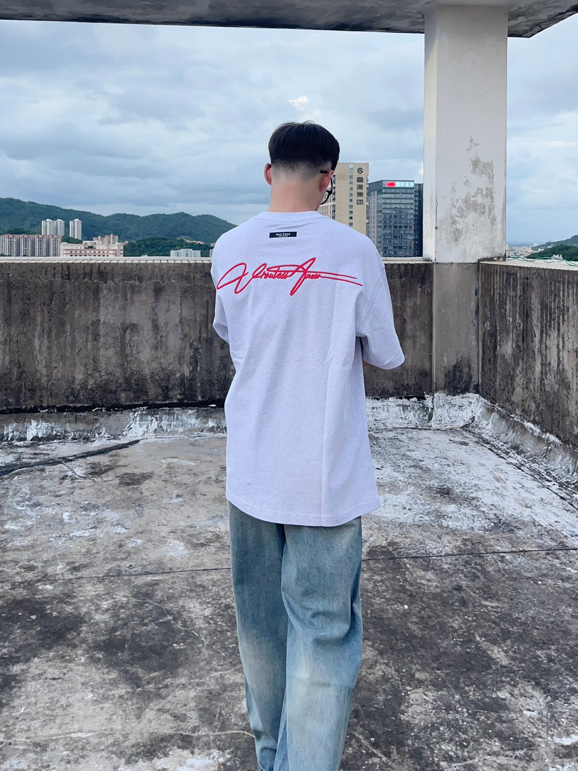 今日份穿搭分享look👀 衣服是 ROUTE 66 家的花灰色美式复古风T恤 前后的刺绣连体字母印花设计潮酷又时尚 面料也很舒适透气 173/120选择M码刚刚好 再搭配一条做旧直筒工装裤修饰腿型 版型宽松显瘦 一套搭配下来 百搭又好看
