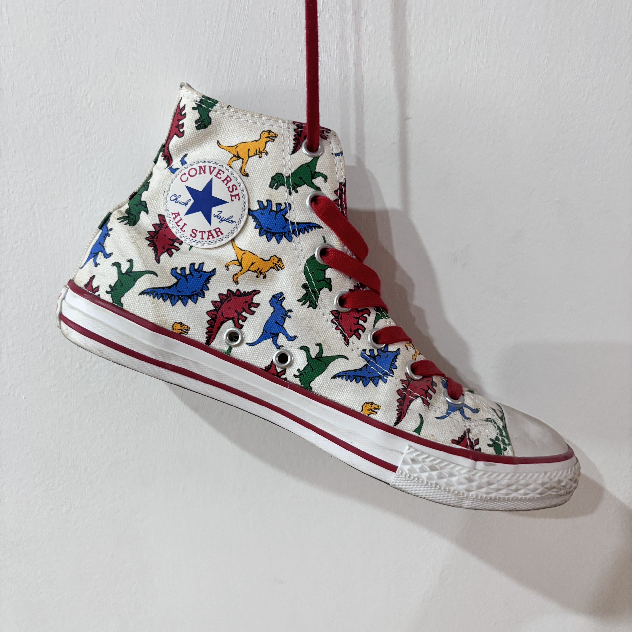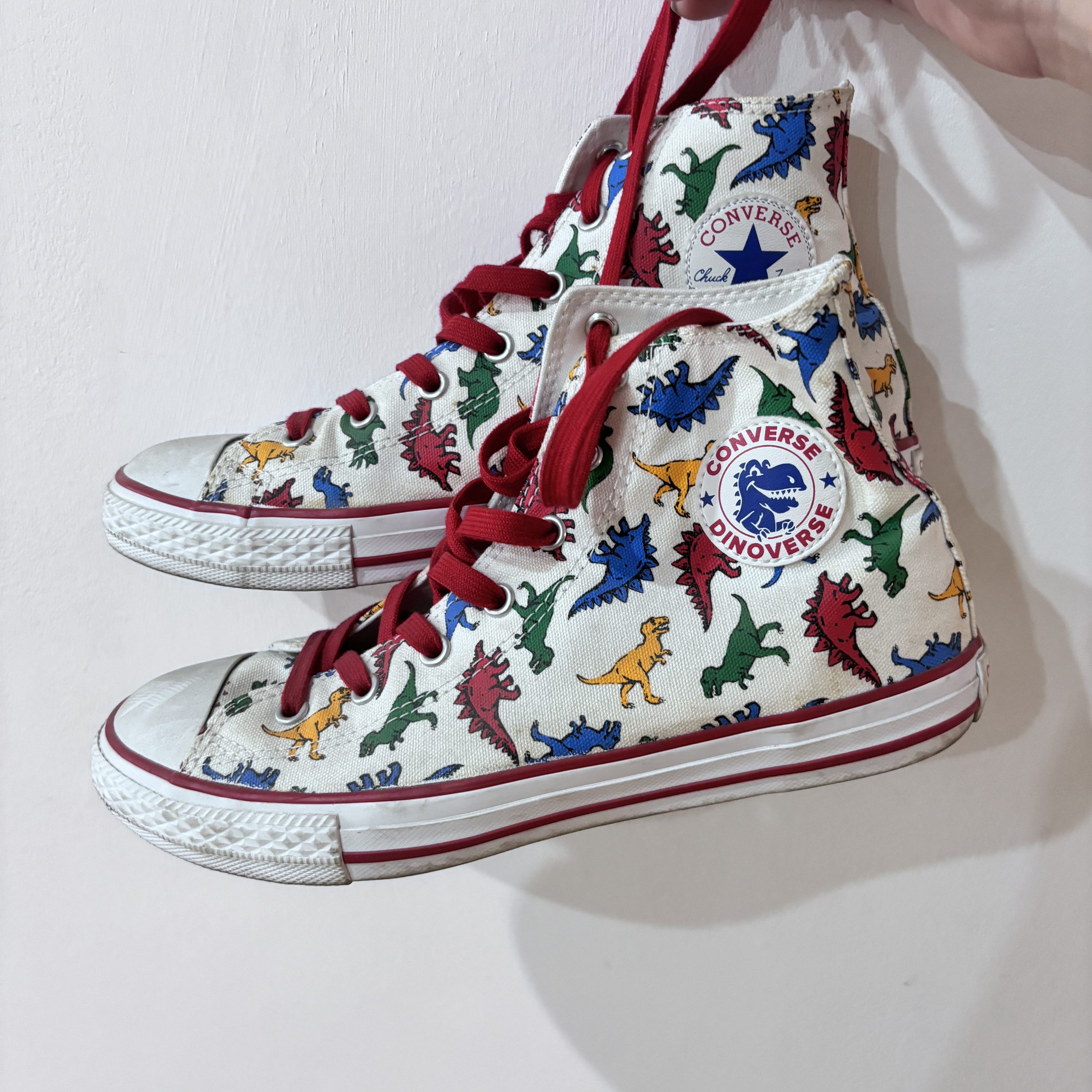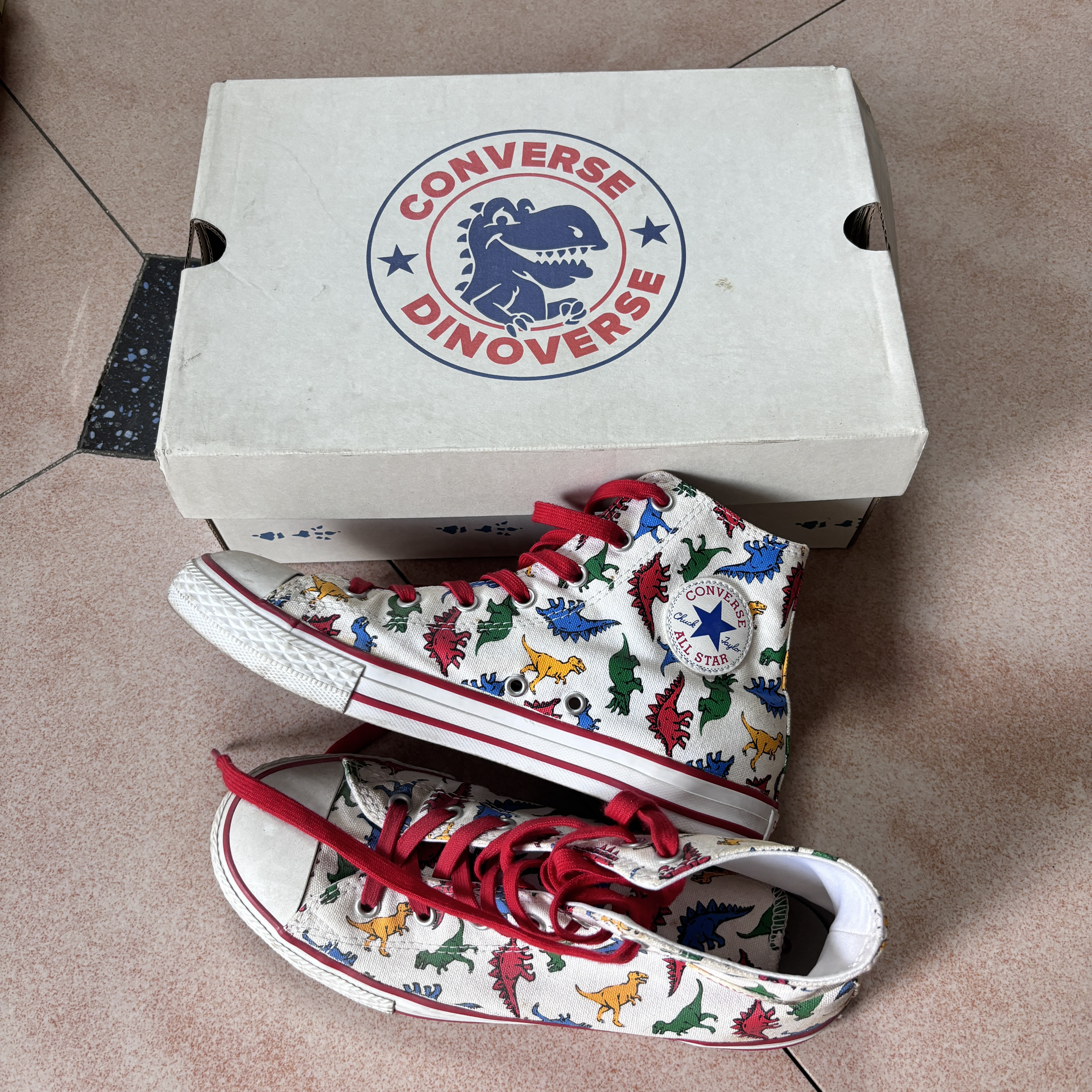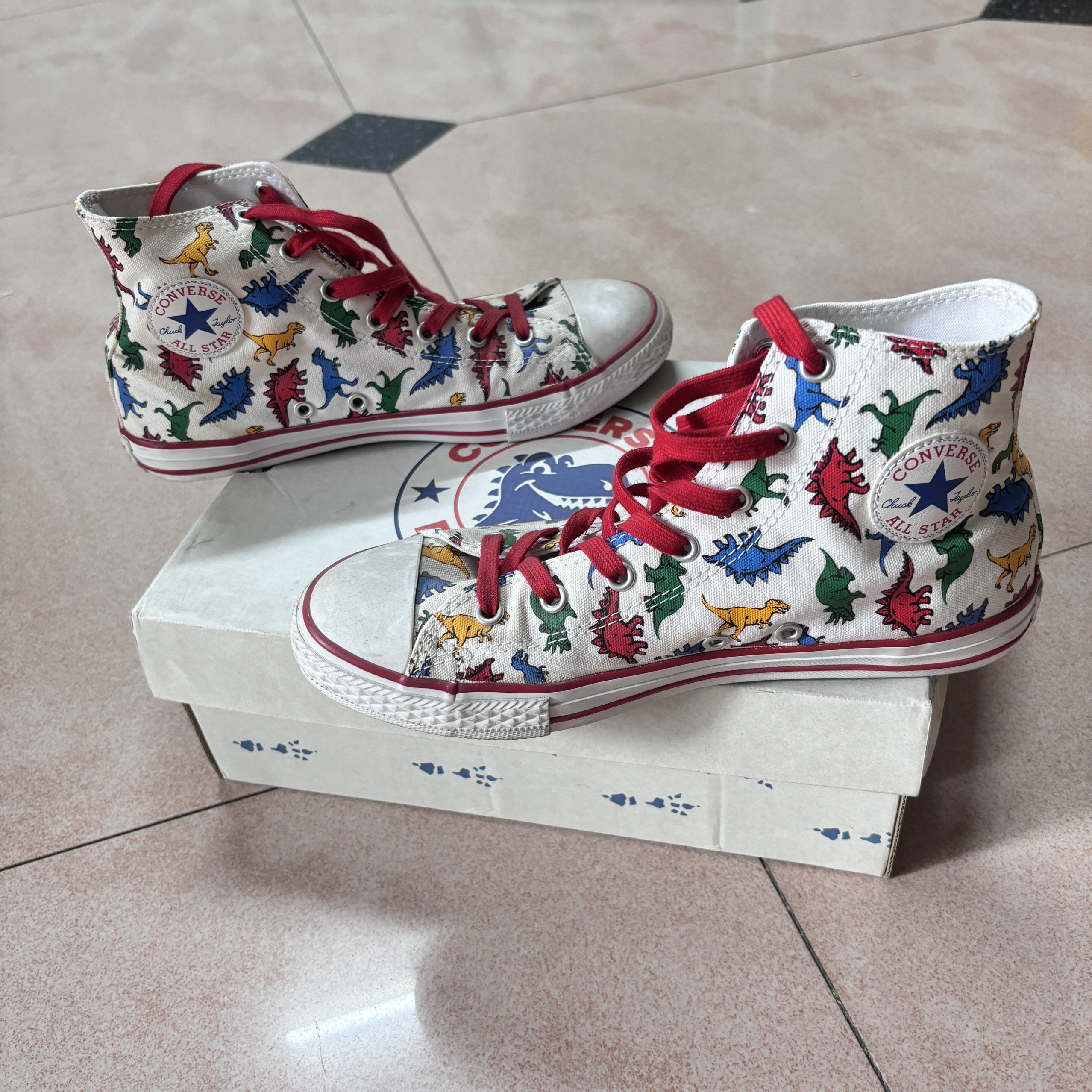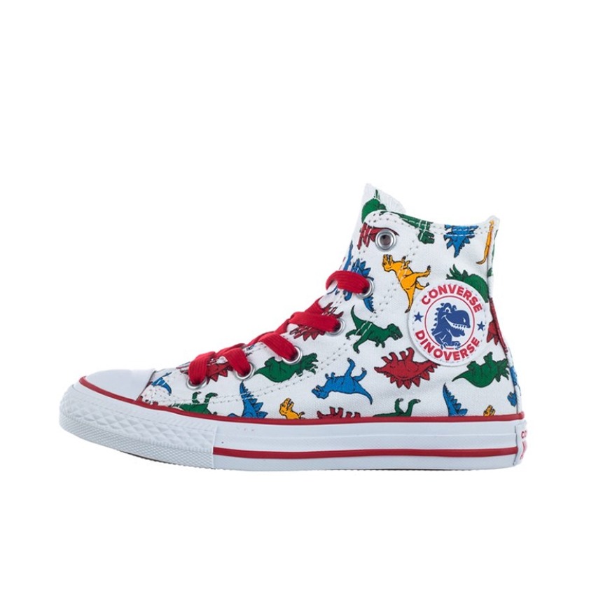 Converse Chuck Taylor All Star 恐龙印花 防滑耐磨轻便 高帮帆布鞋 鞋身恐龙印花充满童趣!一侧的匡威标替换成恐龙标,鞋底也是恐龙爪子,十分可爱! 鞋盒也与众不同的设计,非常独特,穿上吸晴且绝对不会撞款的一双鞋