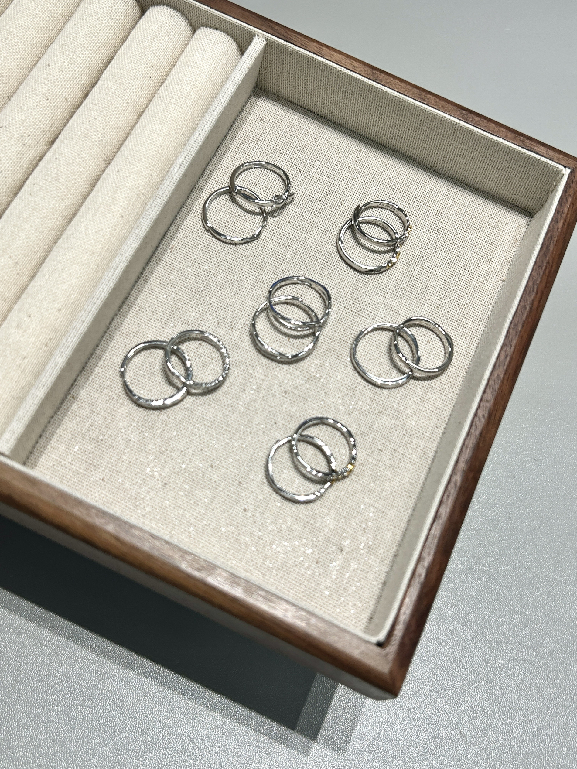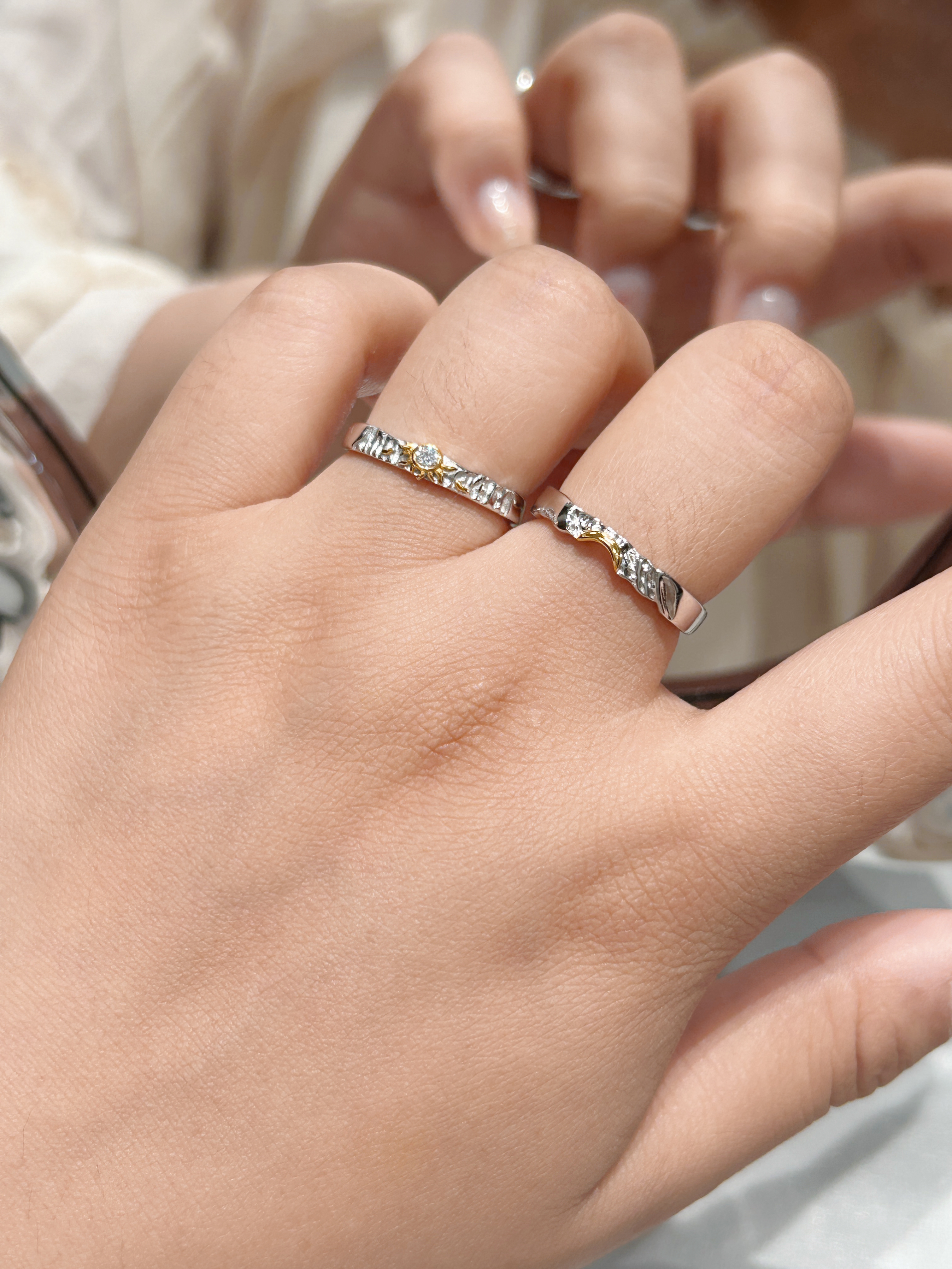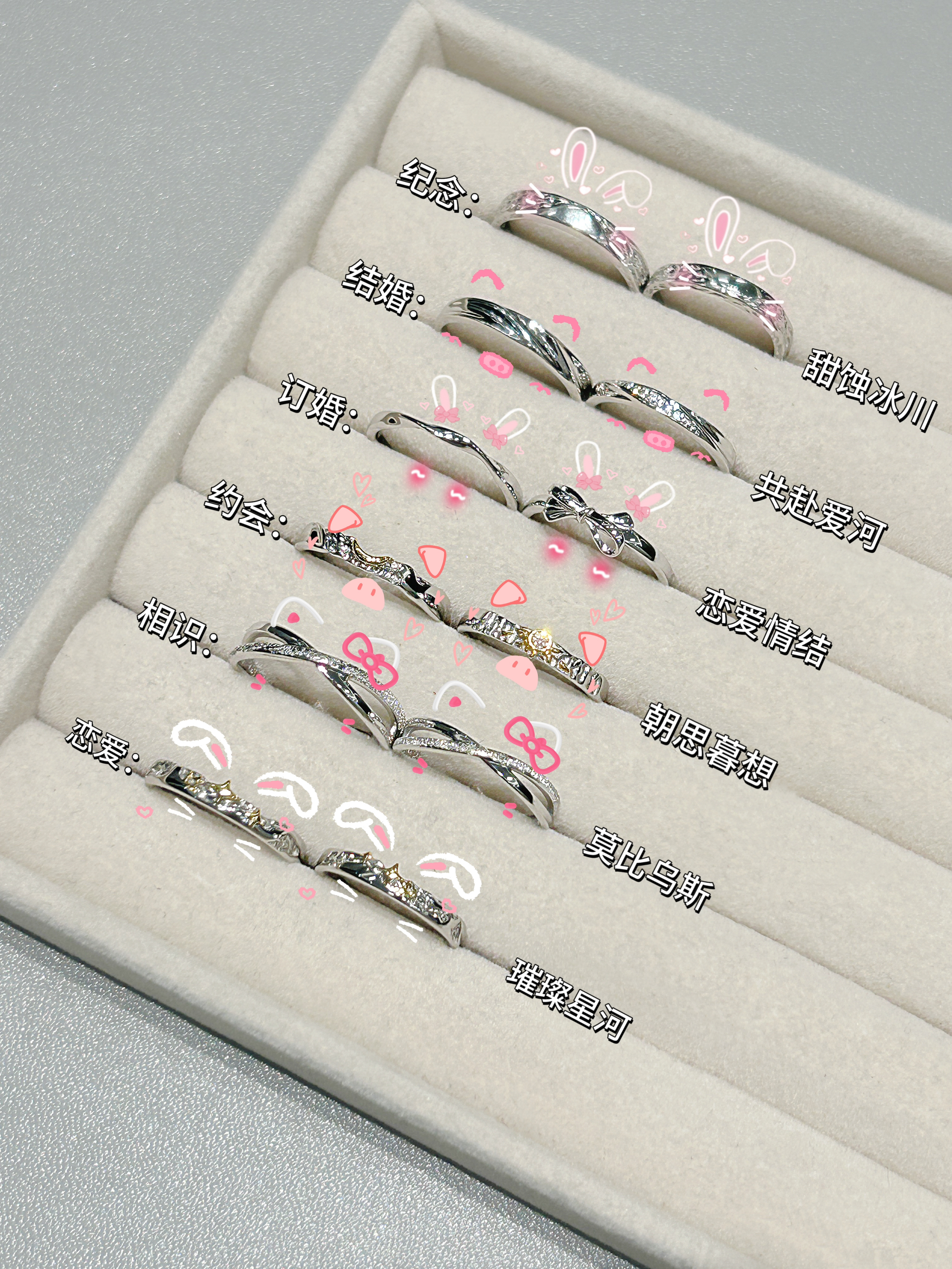 和男友恋爱三四年感觉我俩都快成戒指大户咯 这几款敲浪漫的情侣同款蛮有意义呢 纪录着我们不同的恋爱时期的爱意 我个人感觉每一个都有它独特的设计 纯银的材质 日常佩戴起来比较百搭 我本人手有点小胖 选择戒指的时候会选择一些开口的设计 感觉悄悄给心爱的人准备惊喜也不怕带不上咯 七夕的时候给人送礼蛮有仪式感的