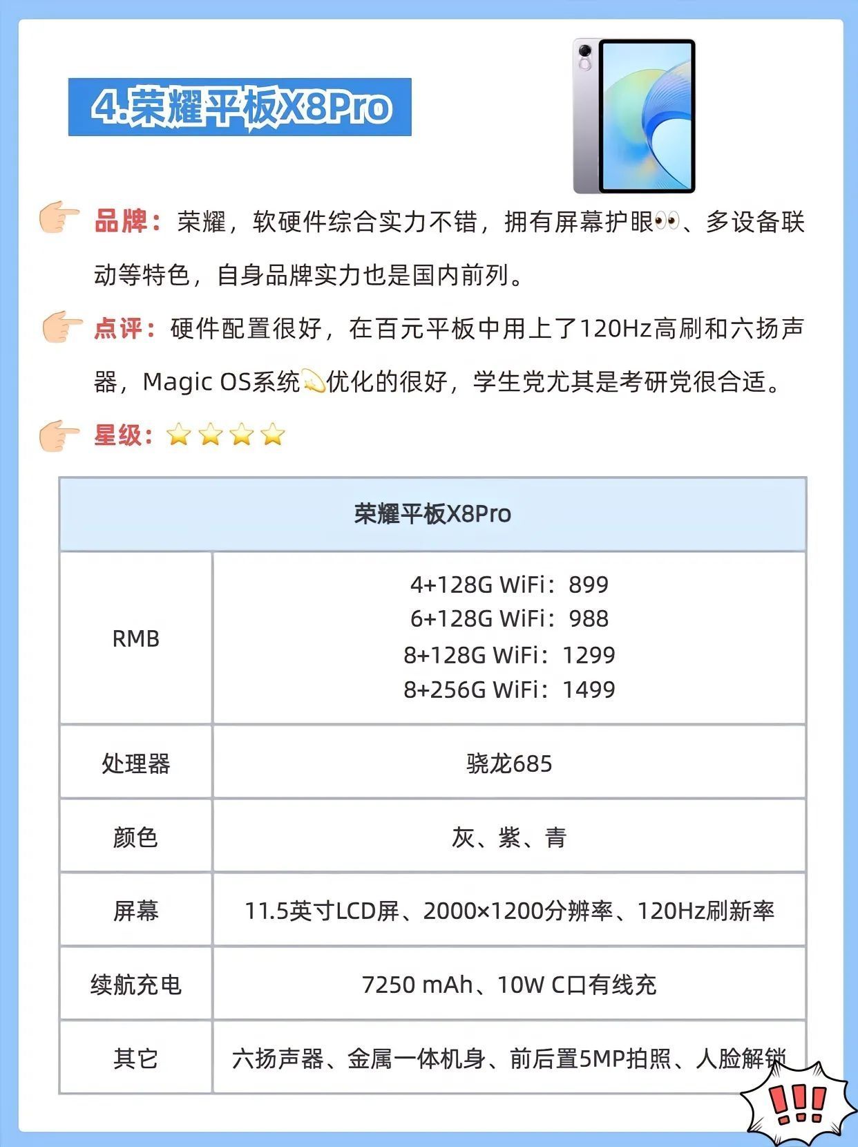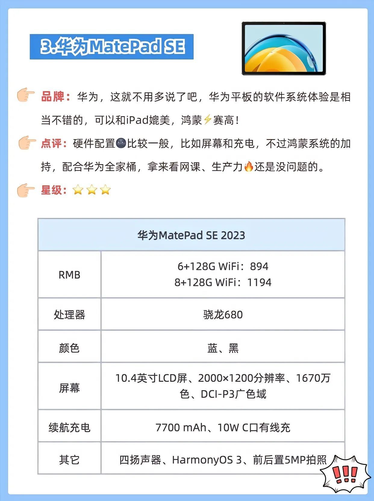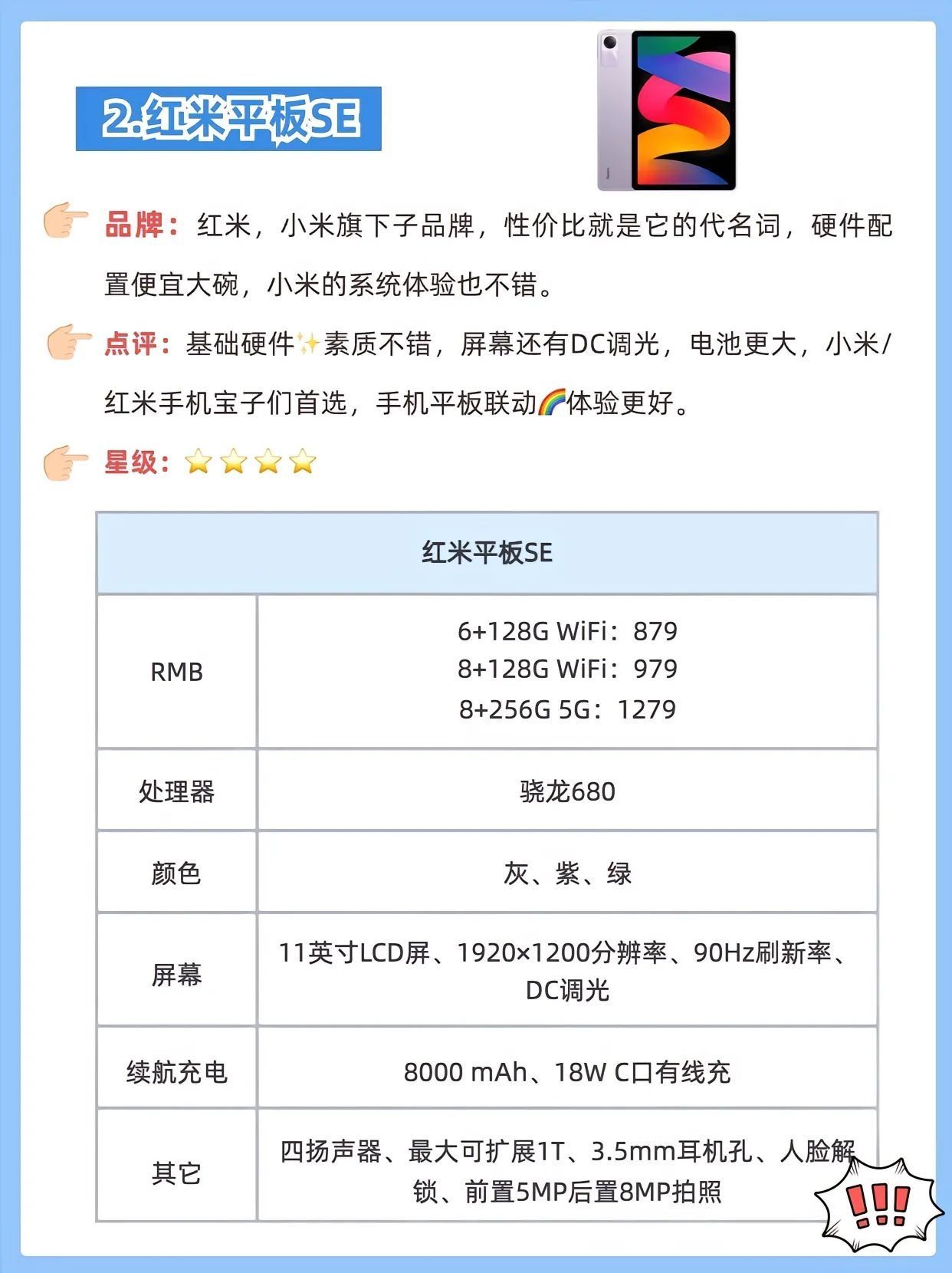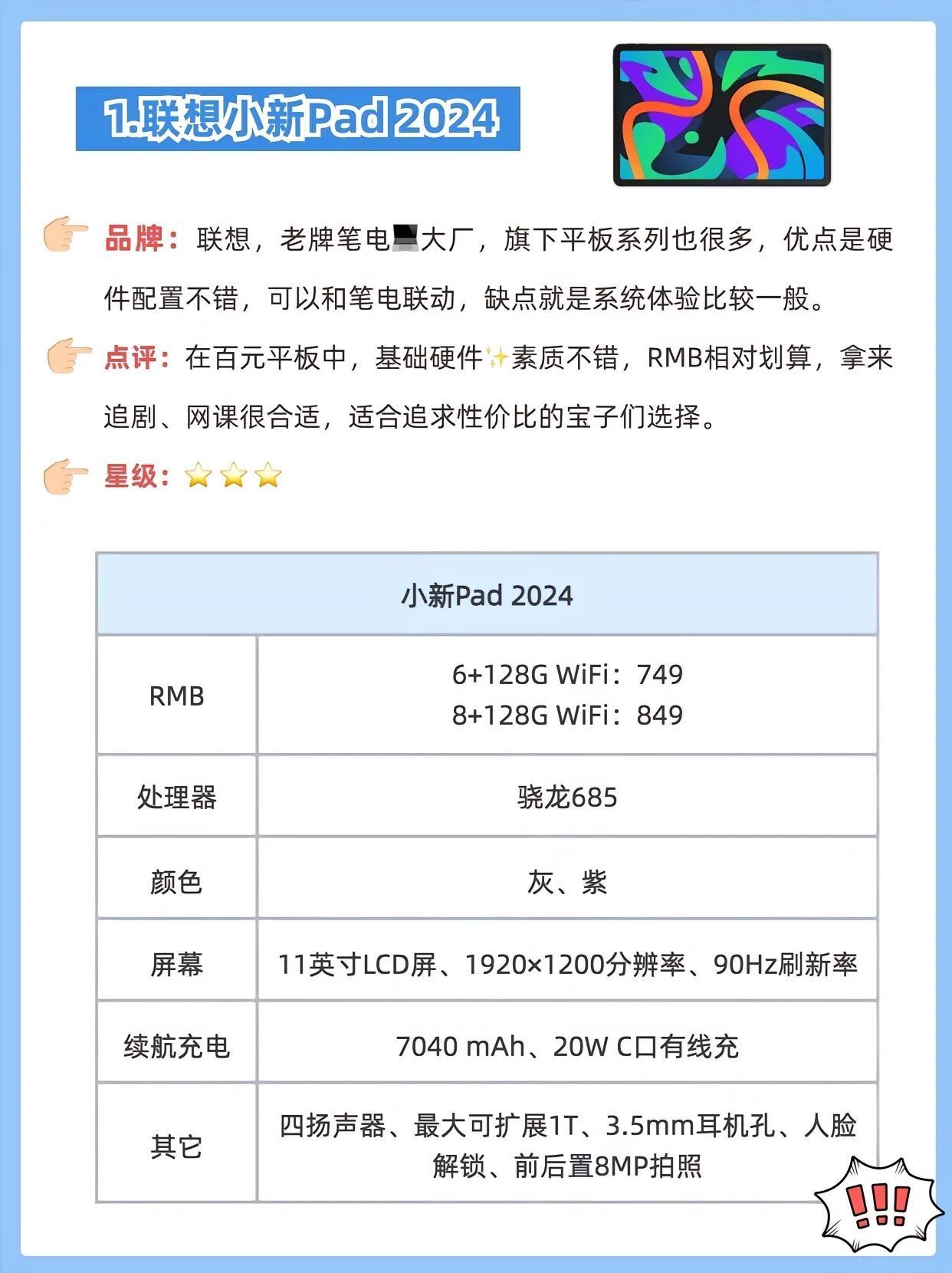 5️⃣款百元平板,2024年高性价比平板。宝子们我又来了,今天给大家推荐2024年几款性价比不错的百元平板,追剧、网课不在话下,甚至拿来玩些小游戏什么的也都🆗,赶快跟随我的脚步一起往下看吧! 1️⃣小新Pad 2024 价格:749元起 推荐指数:⭐️⭐️⭐️ 点评:在百元平板中,基础硬件💧素质不错,RMB相对划算,拿来追剧、网课很合适,适合追求性价比的宝子们选择。 2️⃣红米平板SE 价格:...