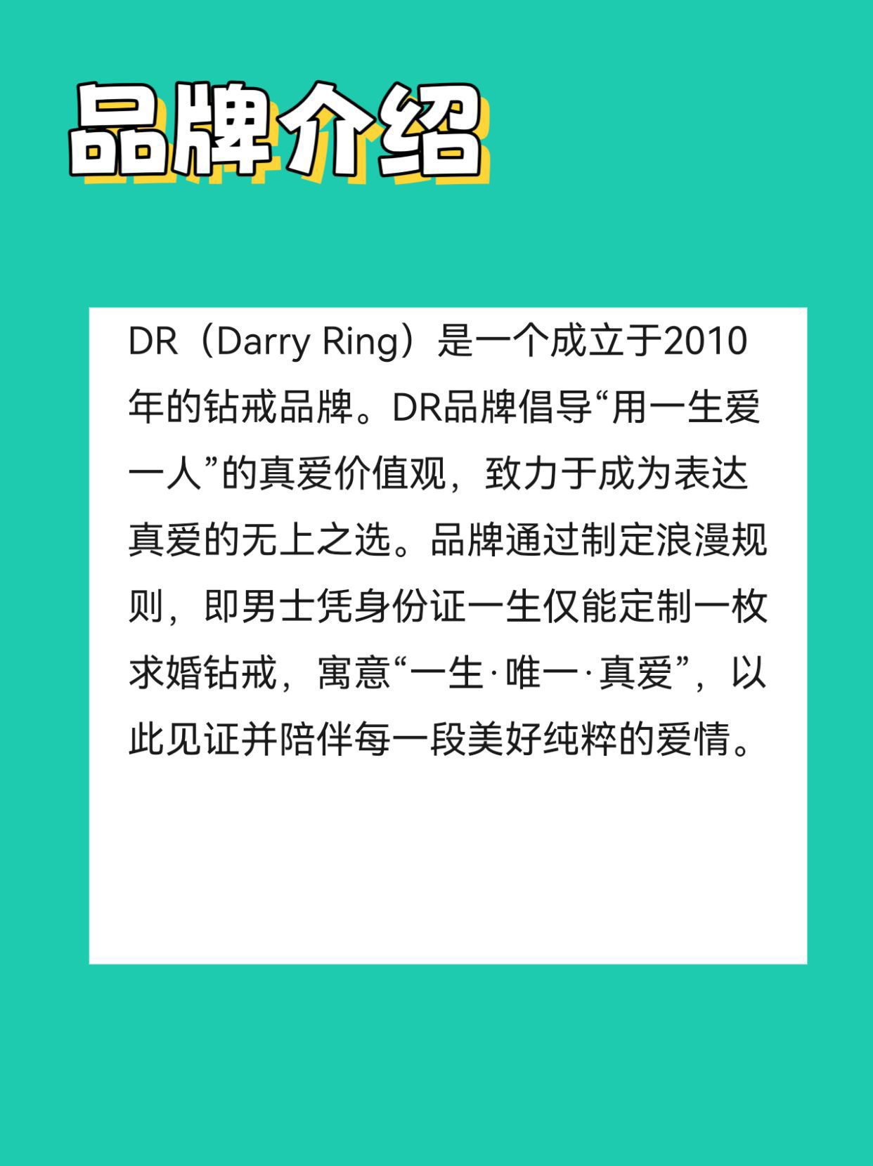 DR创始人Darren和Ruby不仅是品牌的设计灵魂,更是品牌的代言人。他们用自己的爱情故事诠释着DR品牌的精神内涵,让更多的人感受到品牌的温度和魅力。 📍真爱服务 钻石品质终身保证、钻戒终身免费清洁、求婚钻戒终身升值换款、定制记录终身不删不改、包括签订定制须知、真爱协议,求婚策划等。 📍浪漫规则 男士一生仅能定制一枚求婚钻戒,定制记录终身不可修改及删除。DR所有珠宝,均一生只能送一人,延续“用一...