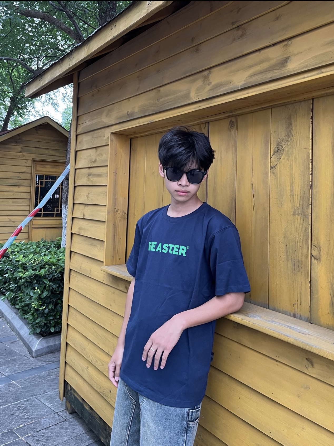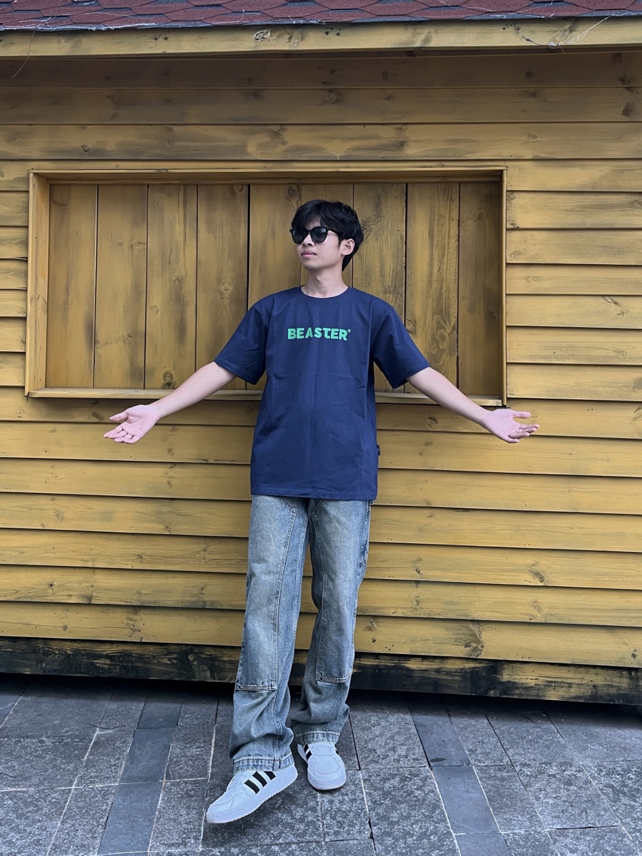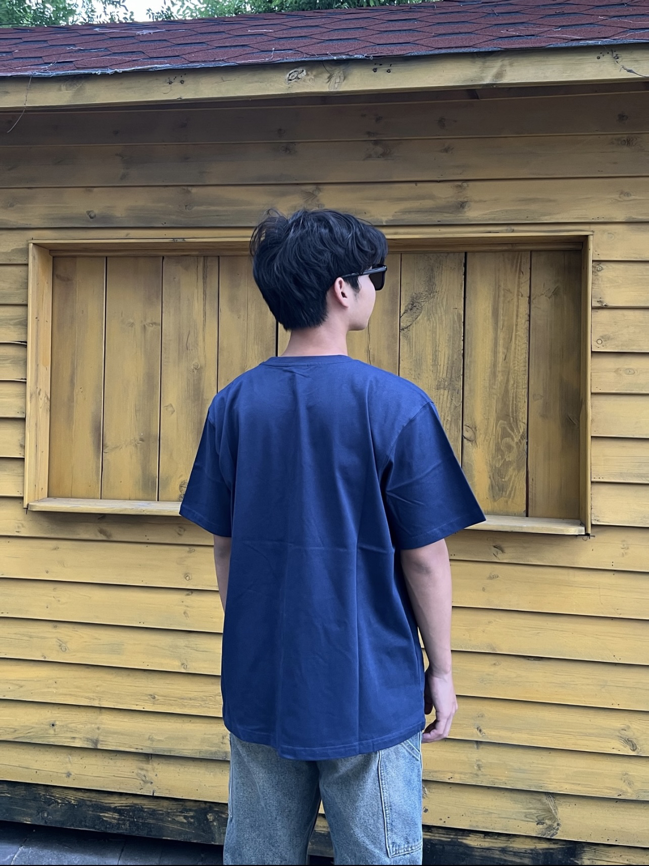 黄黑皮男生的衣柜子 上衣👔:基础版型藏青色短袖,整体只有胸口一个标语简约大气,纯棉面料穿在身上很舒服,简单的设计不一样的感觉。 裤子👖:美式牛仔裤,直筒版型,不挑身材面料硬挺有型,复古泥黄色,看起来更有质感。 鞋子👟:阿迪达斯的板鞋,简约好看易搭配。 👔:M 👖:M 👟:41