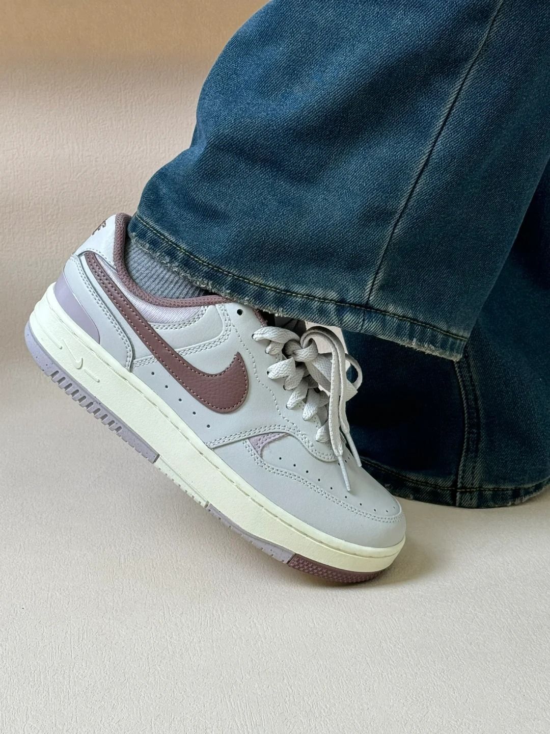 Nike Gamma force新款,耐克经典板鞋又出新配色啦 🔥烟灰色鞋身打底,红棕豆沙色钩子搭配,整体有种复古休闲的氛围感,百搭又好穿,搭牛仔裤尊嘟很好看 🌟厚底增高效果,还是一如既往的棒,很适合160左右的宝子们。 💖整体鞋身包裹性强,橡胶大底,穿起来很有质感。尤其是皮质面很好打理,擦一擦就干净啦