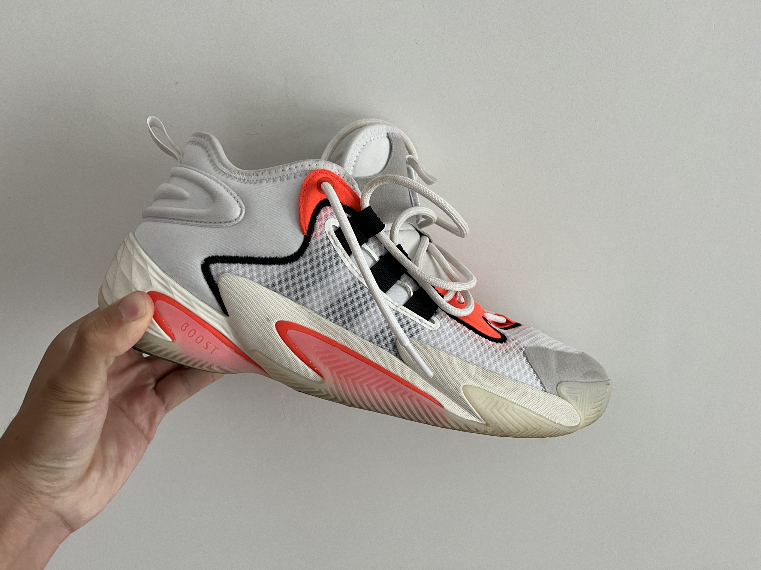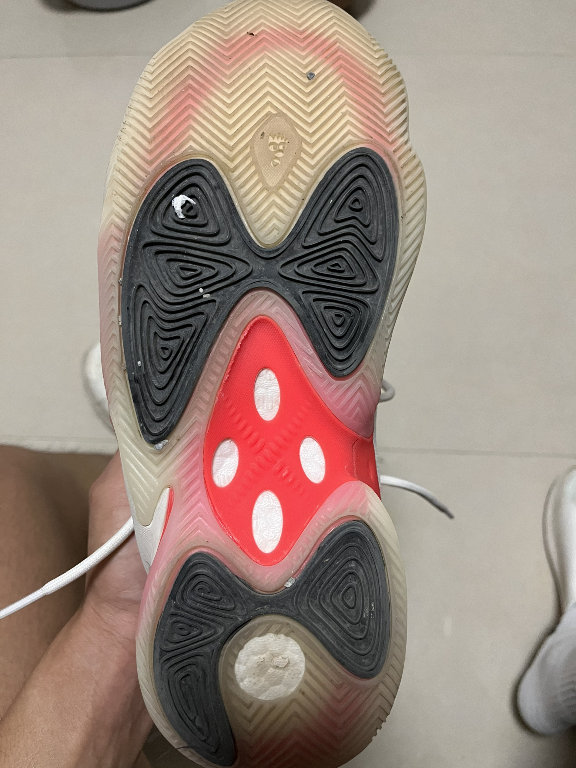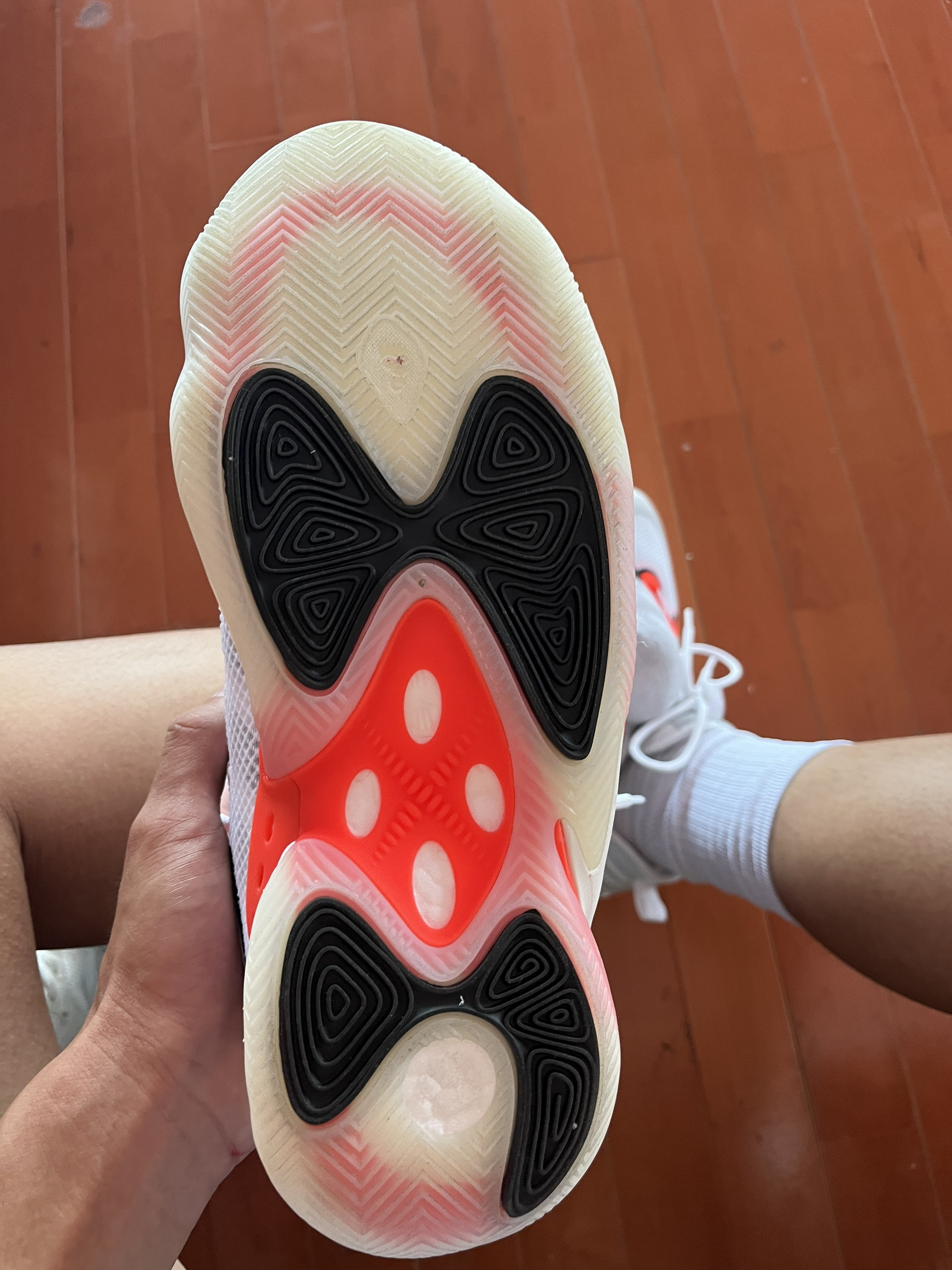 这一双鞋买了快两个月内场穿了有五六次外场也是五六次一次差不多一两个小时 我本人180 144打法5投5突脚属于比较瘦的 初上脚就觉得包裹很不错 鞋面很厚实中底的boost需要打几次球穿开了脚感还是很不错我在内场缓震完全够用外底很宽 防翻侧很好中底贯穿式tpu抗扭稳如老狗中底的泡棉也有上包 侧向支持很稳外底抓地方面 在没有灰的内场很好 人字纹靠谱 在外场也是稳定发挥 外底硬度中规中矩 不过因为纹路比...