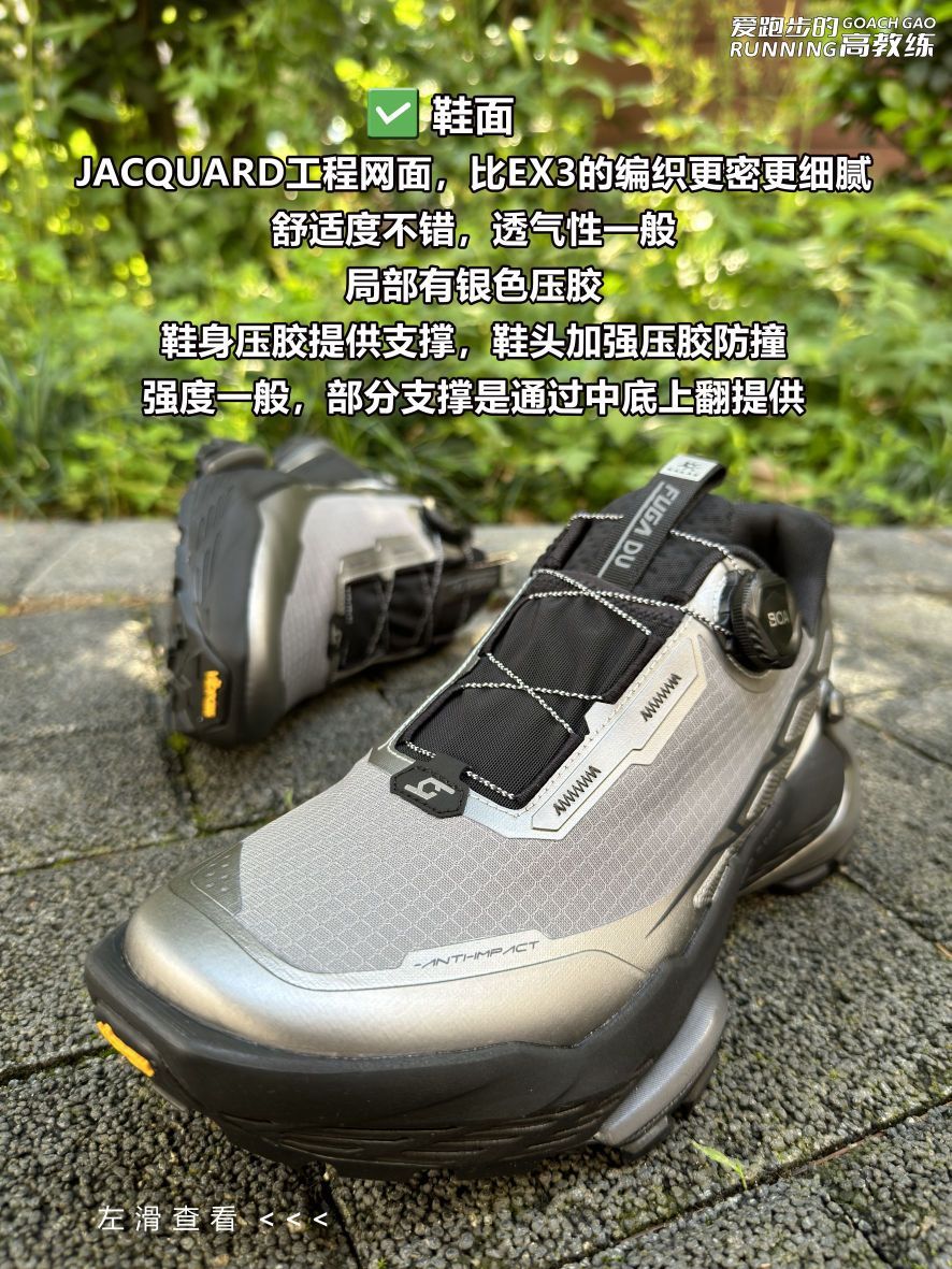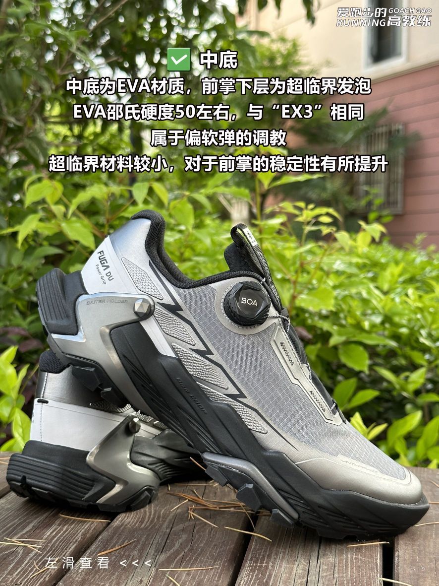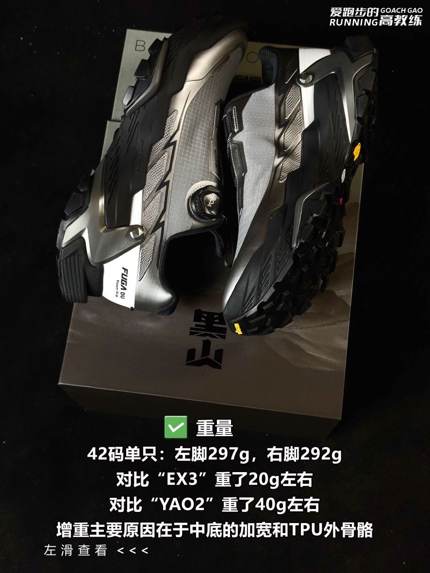 📝跑鞋数据: ✅鞋重:42码单只左脚297g,右脚292g,; ✅鞋面:工程网面,舒适度优秀,透气性一般,银色压胶提供支撑; ✅鞋楦:正常鞋楦,按正码选择,户外适应选大半码; ✅鞋舌:鞋舌中间层有打孔,半内靴设计,相较于普通版更加轻薄透气,还比普通版多了提拉环和一层防沙网布; ✅鞋带/鞋带孔:BOA系带系统,穿脱便捷,贴合精准,但包裹性相较于基础款的AWS两段式收紧系统会弱些; ✅港宝:高强度港宝...