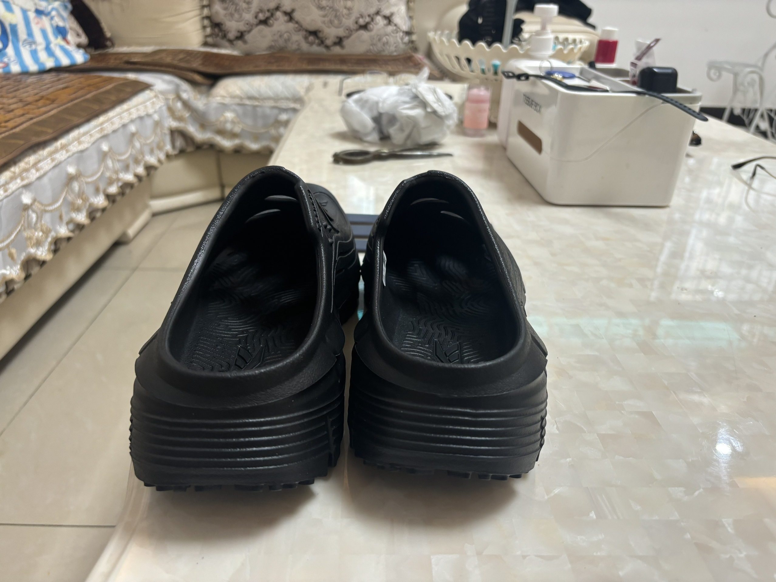 鞋底特别软弹,有踩屎感,做工不错没有异味。 包裹性很好,也不硌脚,有一定增高效果。购入的黑色,对黑武士配色无法拒绝,特别帅气,外观低调冷酷,也很好打理。去健身游泳,日常出勤特别舒服,十分跟脚,这是我穿过最跟脚的拖鞋,穿袜子搭配个人认为会更还看,注意尺码,是偏大的,平时穿42的只用买40.5!