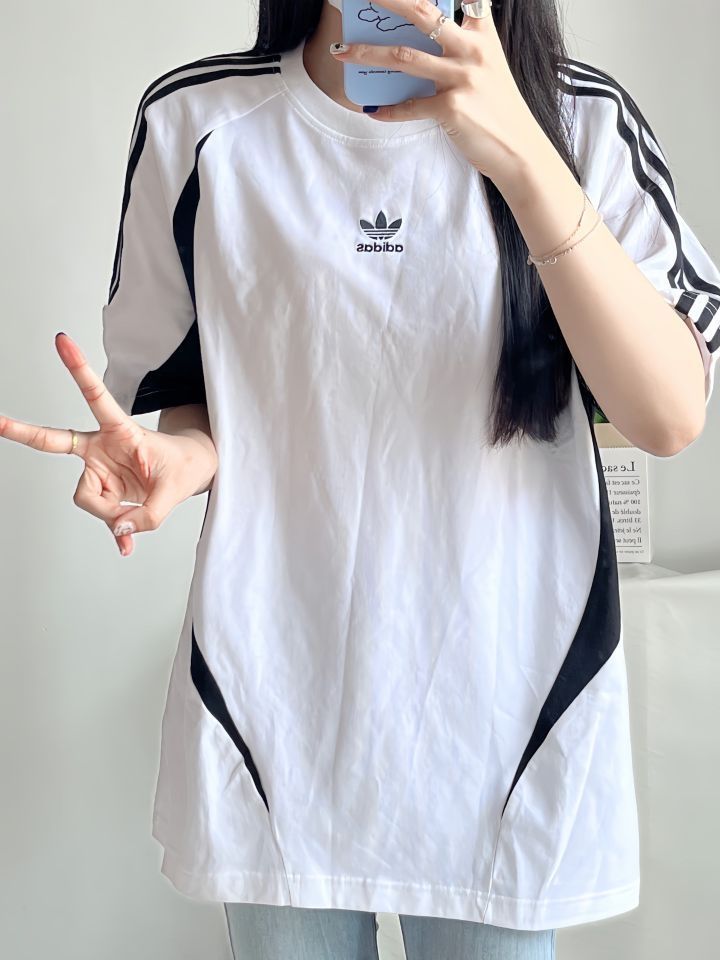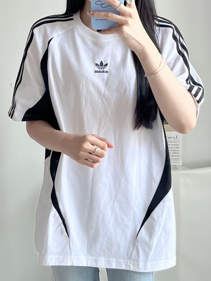 🆒adi这款设计是机能风 小巴黎味儿挺冲的 一眼就爱上了 ✨身高163体重92 短袖穿M码的 ✨这款和之前不太一样 没有经典三条杠设计 黑白拼色设计加上胸口三叶草logo点缀 上身百搭好看 设计的有种机能风 比较酷🆒 ✨面料还好 我搭配了浅蓝色牛仔裤感觉是不错的 也可以搭配阔腿裤 休闲裤 (图片来自博主:十三亿圆)