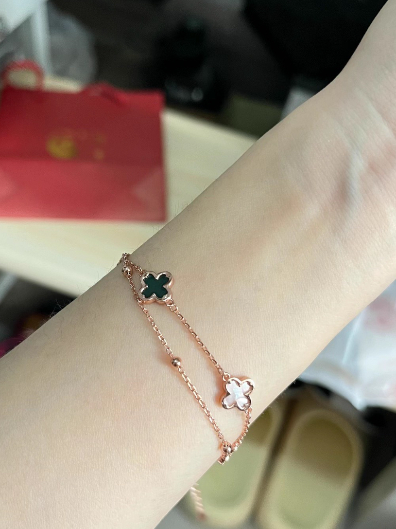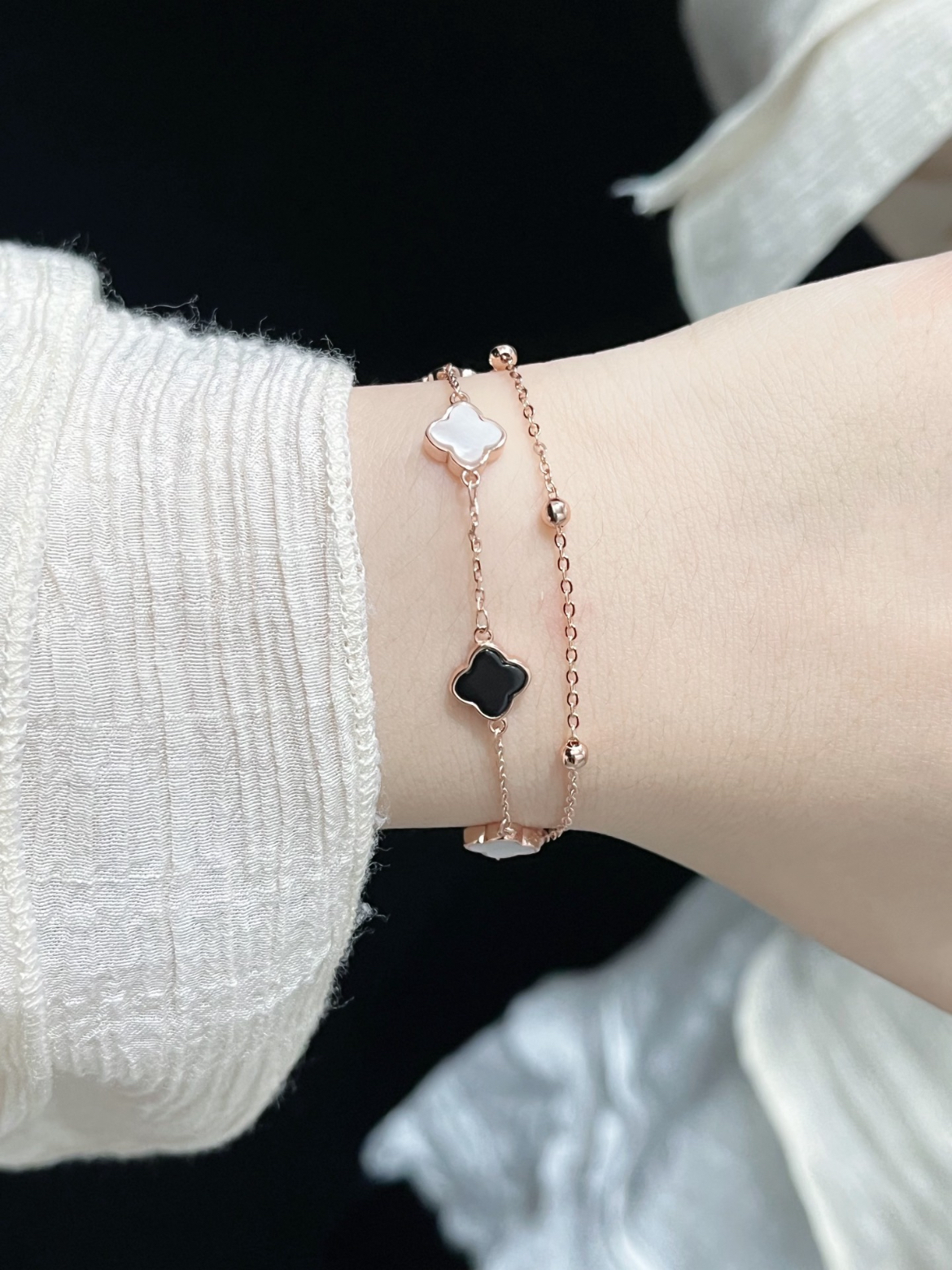 温温柔柔的又有气质的四叶草手链谁懂啊!上手真的温柔又清冷的氛围感!黑白色的搭配真的好有设计感~一条黑白两色四叶草、一条带小金珠双层叠戴的设计真的好好看呀!有种低调又高级的美,送长辈或者女友都很合适呢! (图片来自网络,侵删)