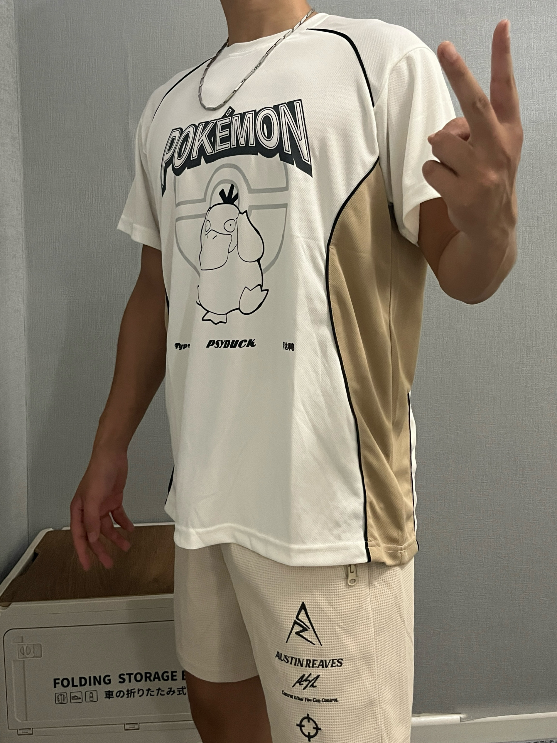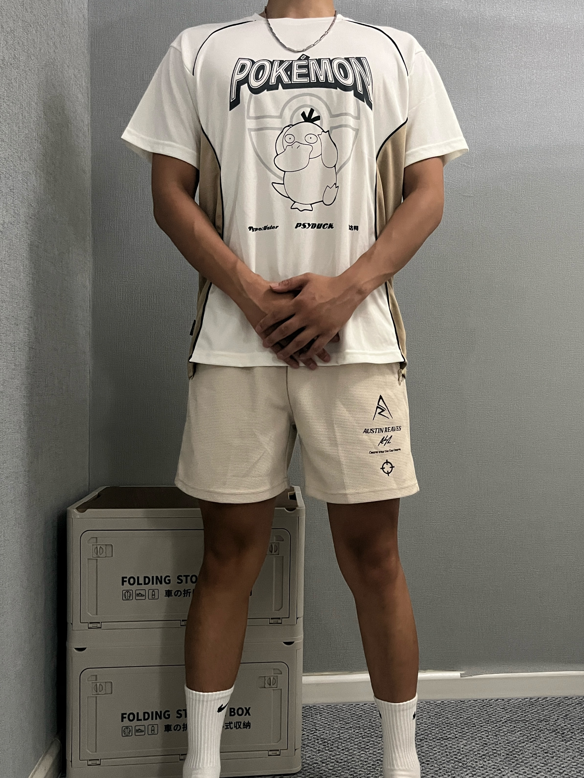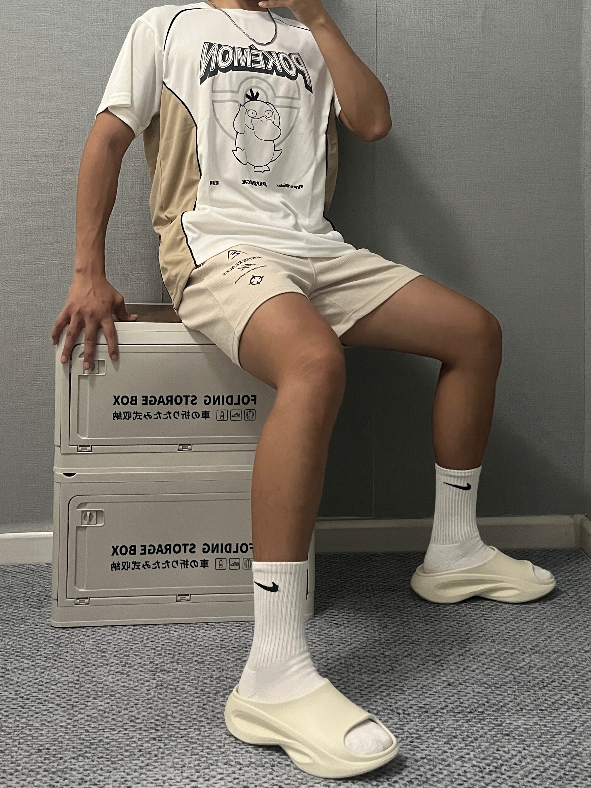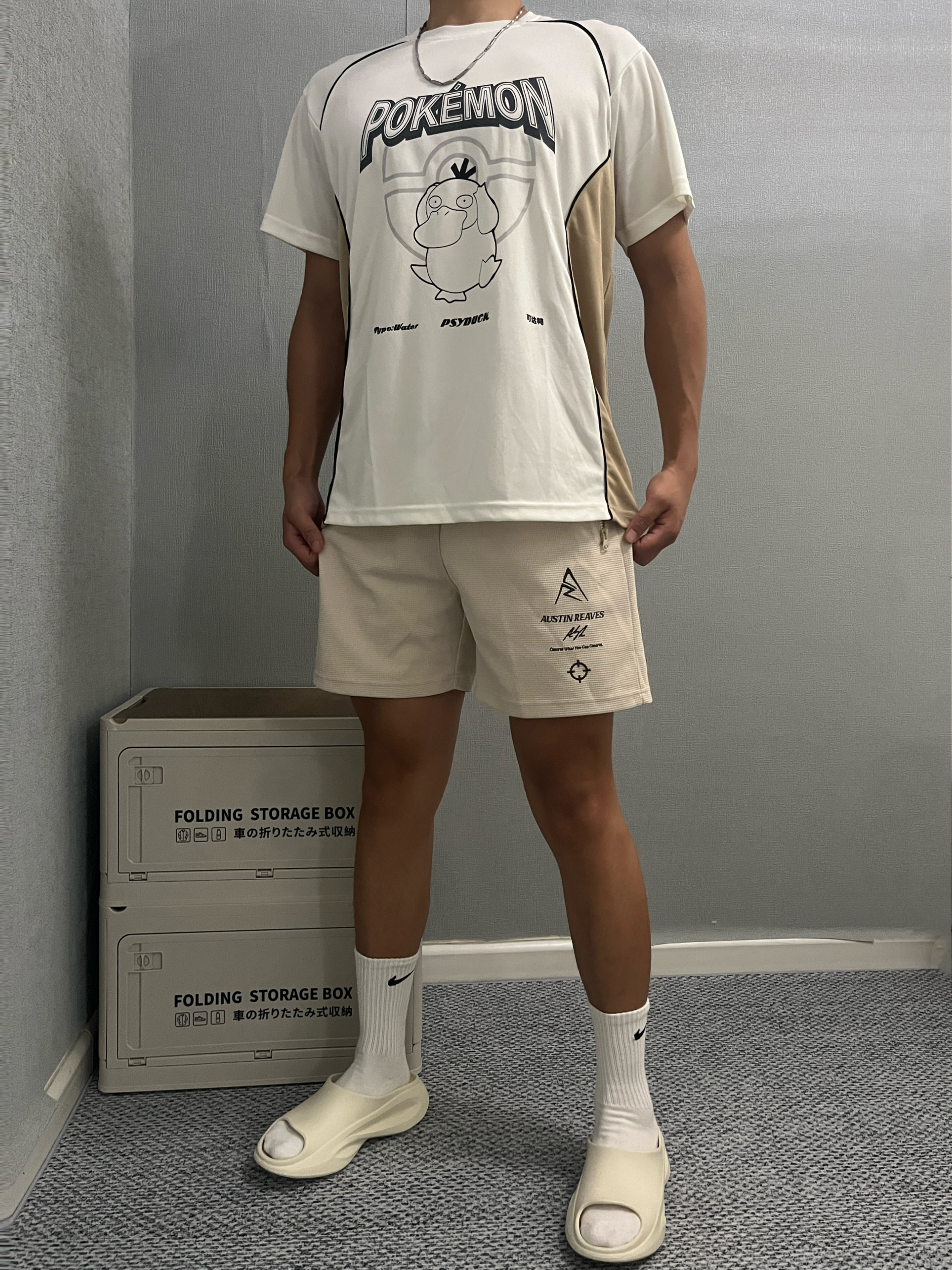 身高|体重:180cm|75kg 🧍♂️ 穿搭风格:美式球员风 👔 上衣:维动宝可梦联名可达鸭短袖 👖 下装:准者里弗斯同款短裤 👟 鞋子:WHITEHOT 运动拖鞋 今天又是非常chill的一天