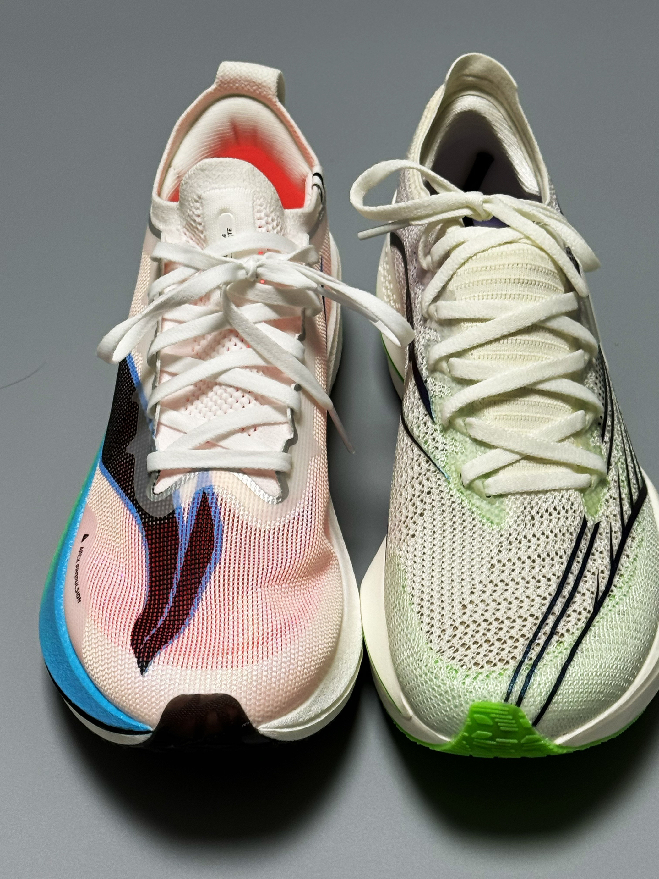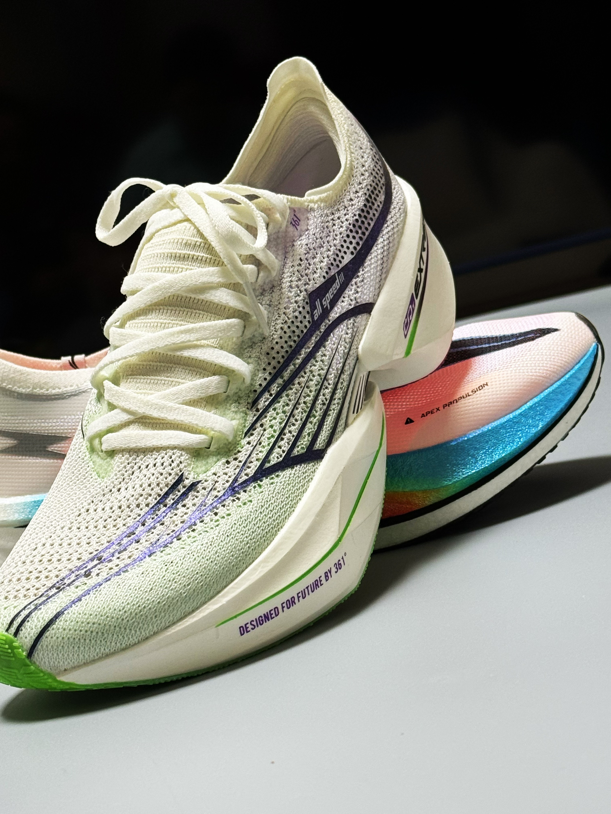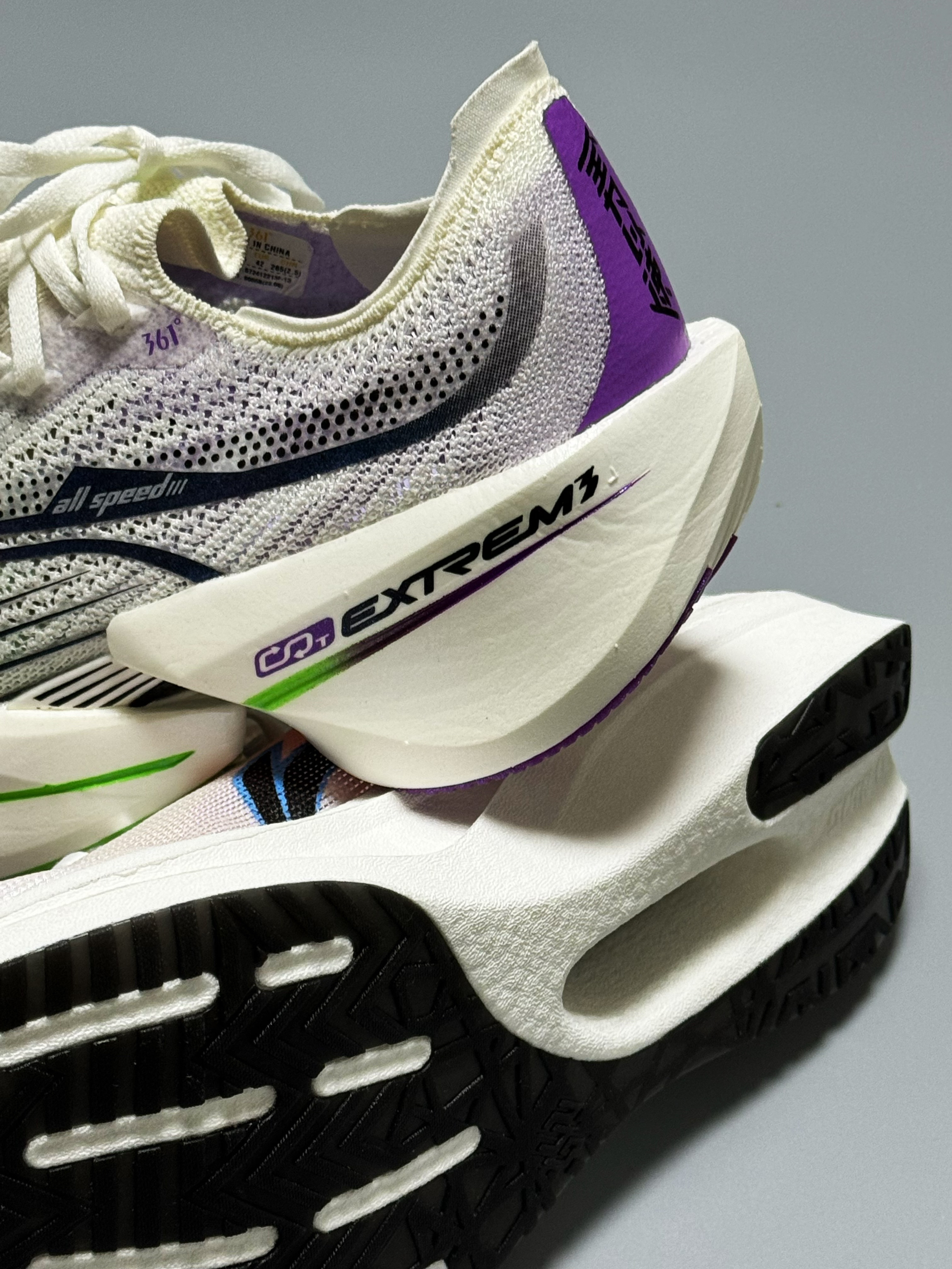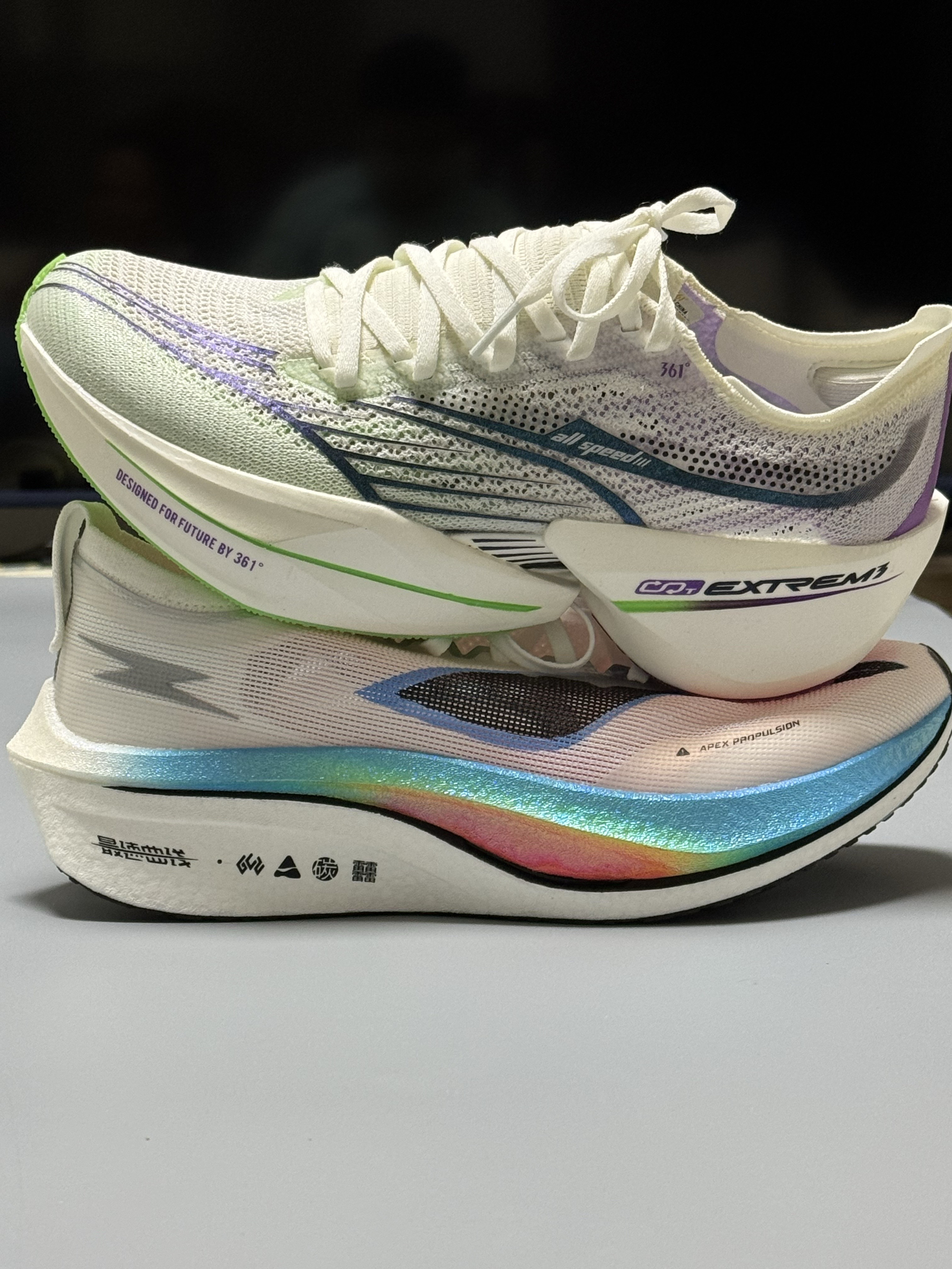 halo 阿迪来了,本期分享两双竞速马拉松跑鞋!分别是这双飞电4E,以及这双361度飞飙future! 话不多说,我们先来看看这双飞电4E,整双鞋鞋面采用一贯的䨻丝设计,一体式弹力鞋舌,后跟环绕式填充,鞋楦有所加宽,对宽脚的跑者更友好。在中底结构上,采用了进化式设计,内嵌异构碳纤维板和李宁跖枕科技,以优化跑步感受和提升助推力。鞋面设计更加人性化,鞋楦有所加宽,适合宽脚跑者。外底GCU铺面,纹路更粗...