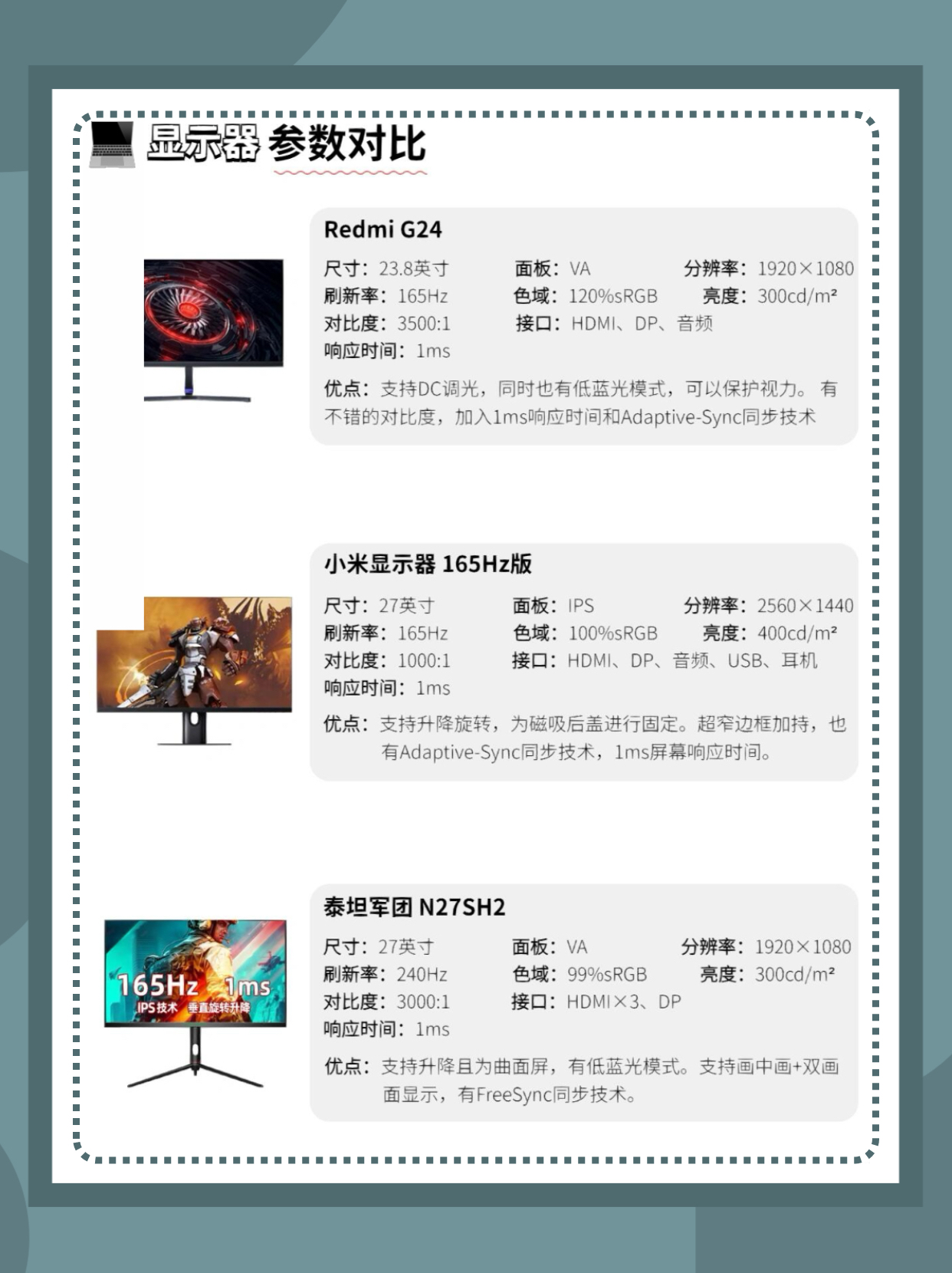 本篇笔记关联了MI/小米 XMMNT27HQ 27英寸 165Hz 2K 显示器 窄边框 广色域 外接 IPS技术 旋转 升降 可壁挂 高刷新率 电竞 办公 黑色、AOC Q24G2 23.8英寸 165Hz 2K 电竞显示器 快速 高刷 液晶 广色域 低蓝光 外接 黑色、Redmi/红米 G24 P24FCA-RG 23.8英寸 165Hz 1080P 电竞显示器 极速响应 高刷新率 高刷广色域 高清 高亮 低蓝光 窄边框 硬件级 外接 液晶屏 黑色等商品,为用户提供真实的使用体验和购买参考。