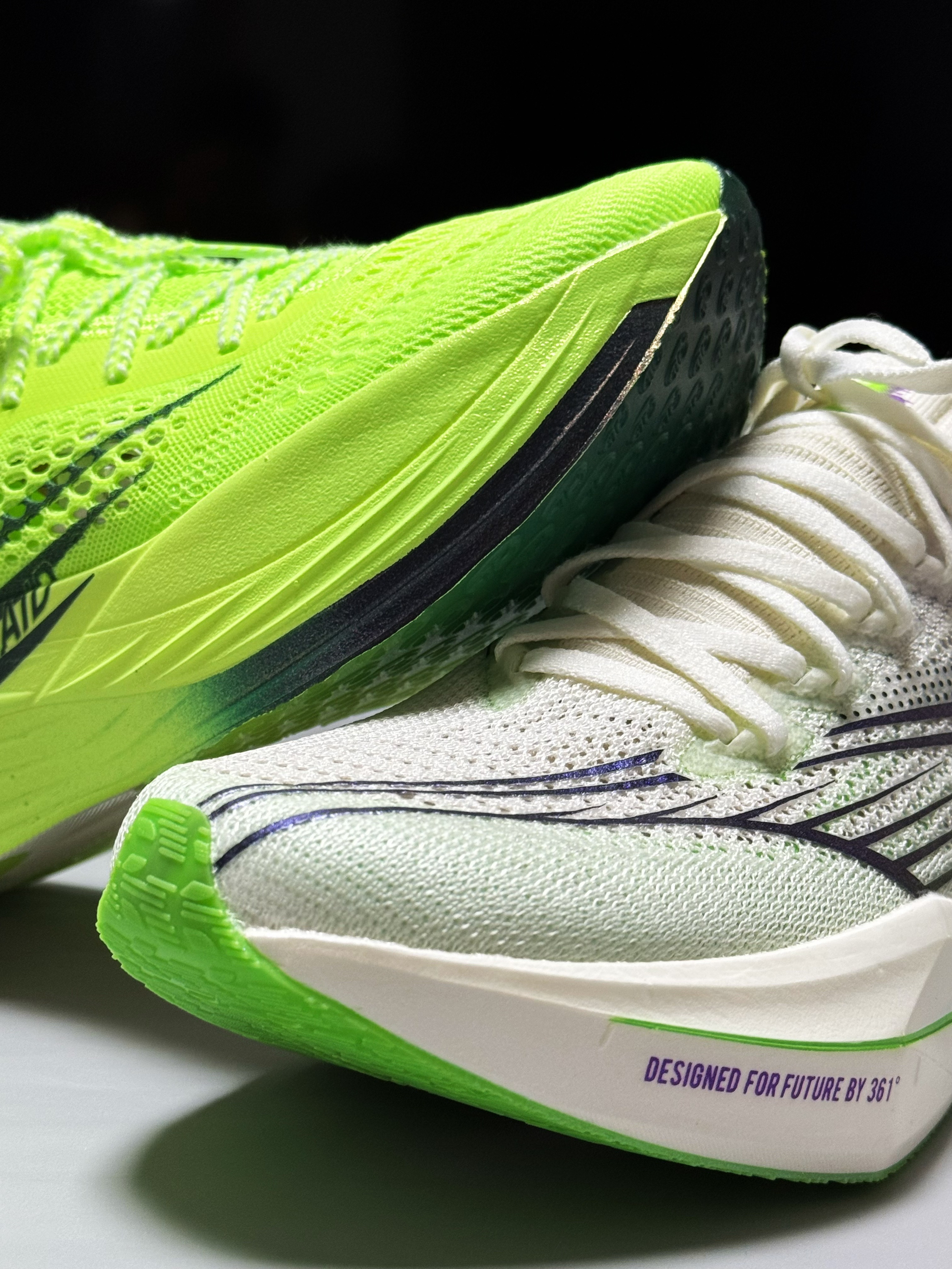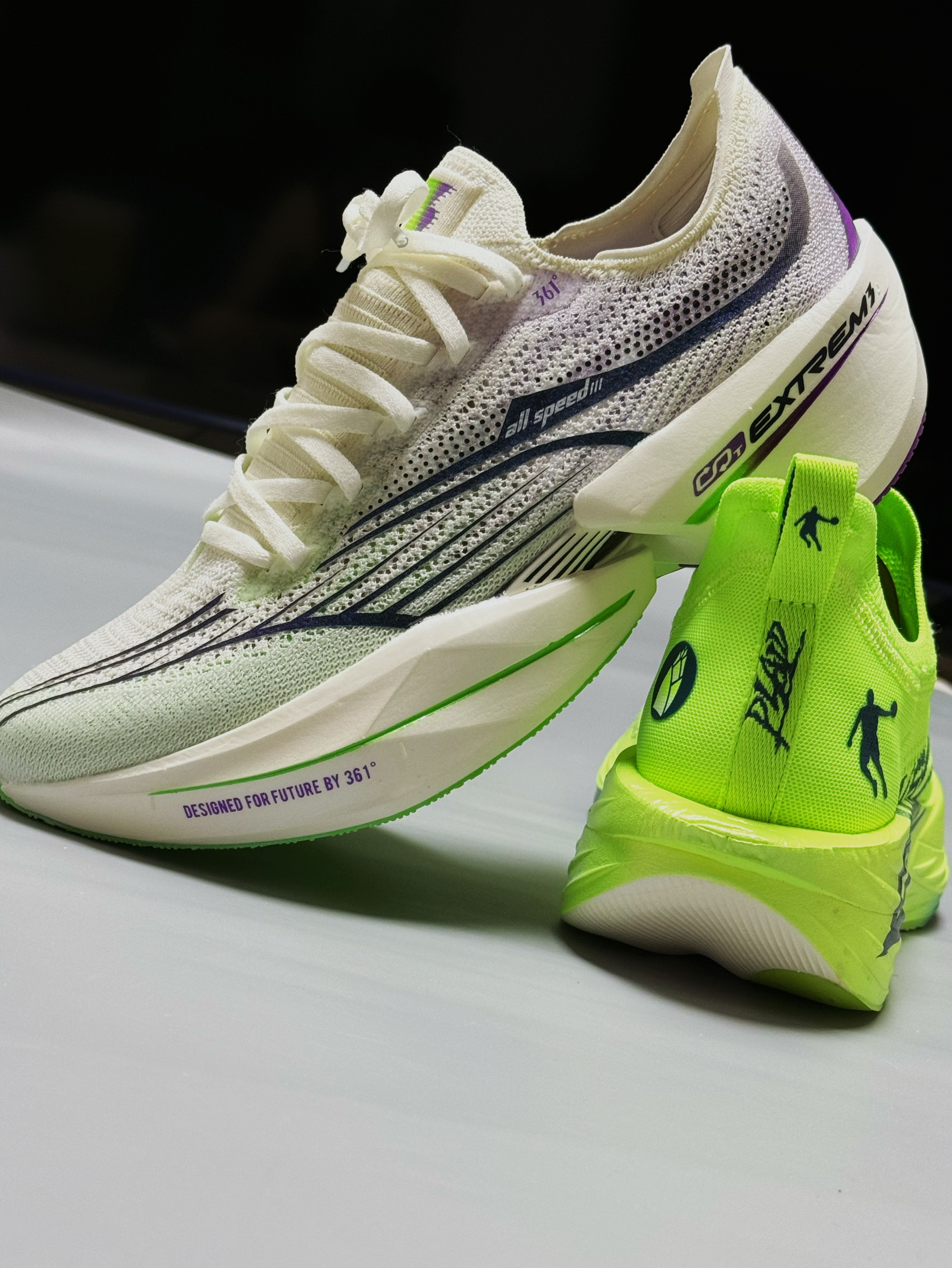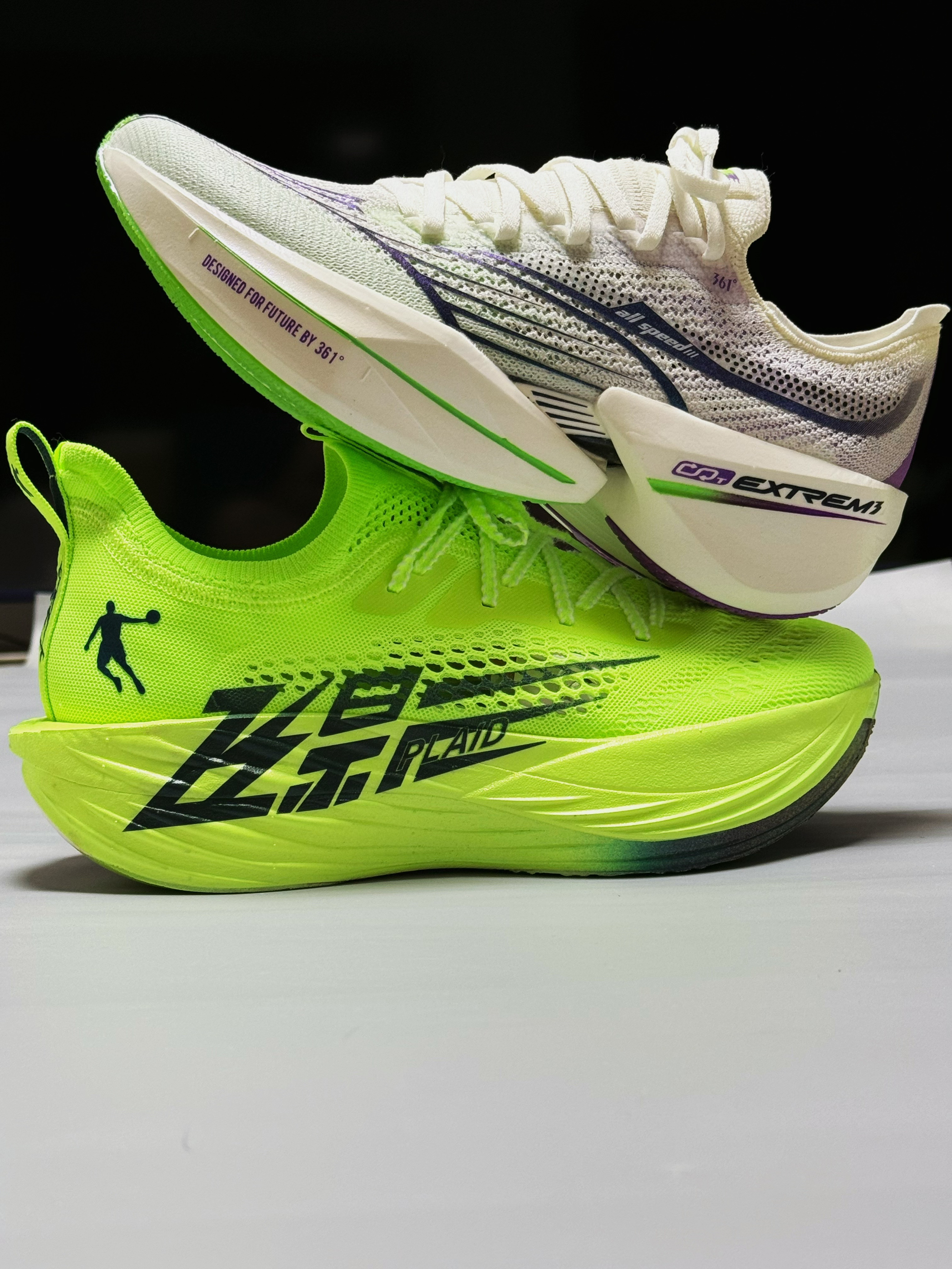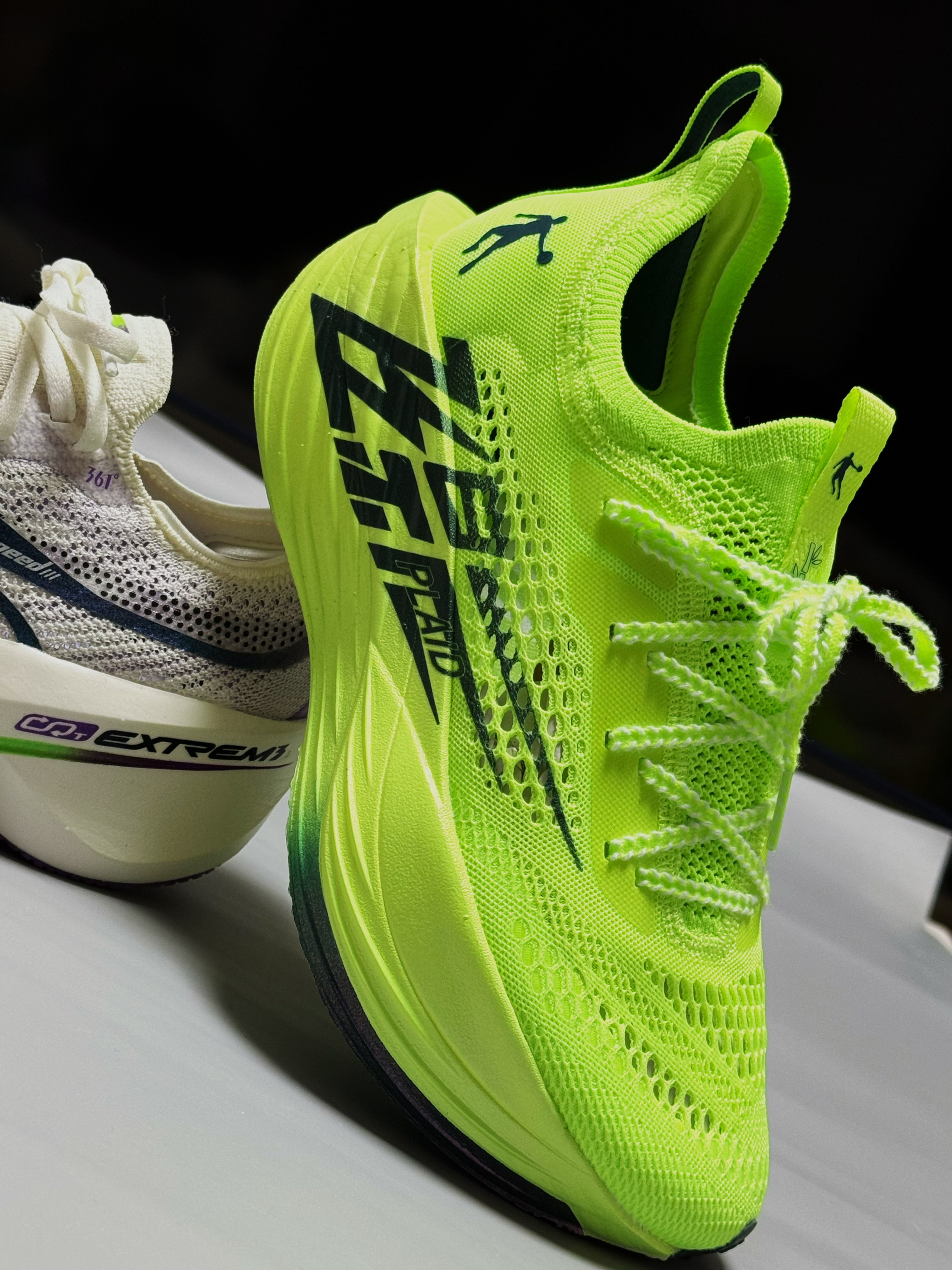 halo 阿迪来了,本期分享两双最近get的国产竞速马拉松跑鞋!没错,就是这双361度飞飙future,以及这双飞影Plaid! 话不多说,我们先来看看这双飞飙future,整双鞋外观颇具匠心,采用了中底三明治架构,并配备了外露加强筋碳板以及分体式中底。其前掌厚度为31mm,后掌厚度为39mm,坡差为8mm,给人一种高端、专业的视觉感受。不过,初次尝试时,确实感觉它有着不小的驾驭门槛,无愧于竞速鞋...