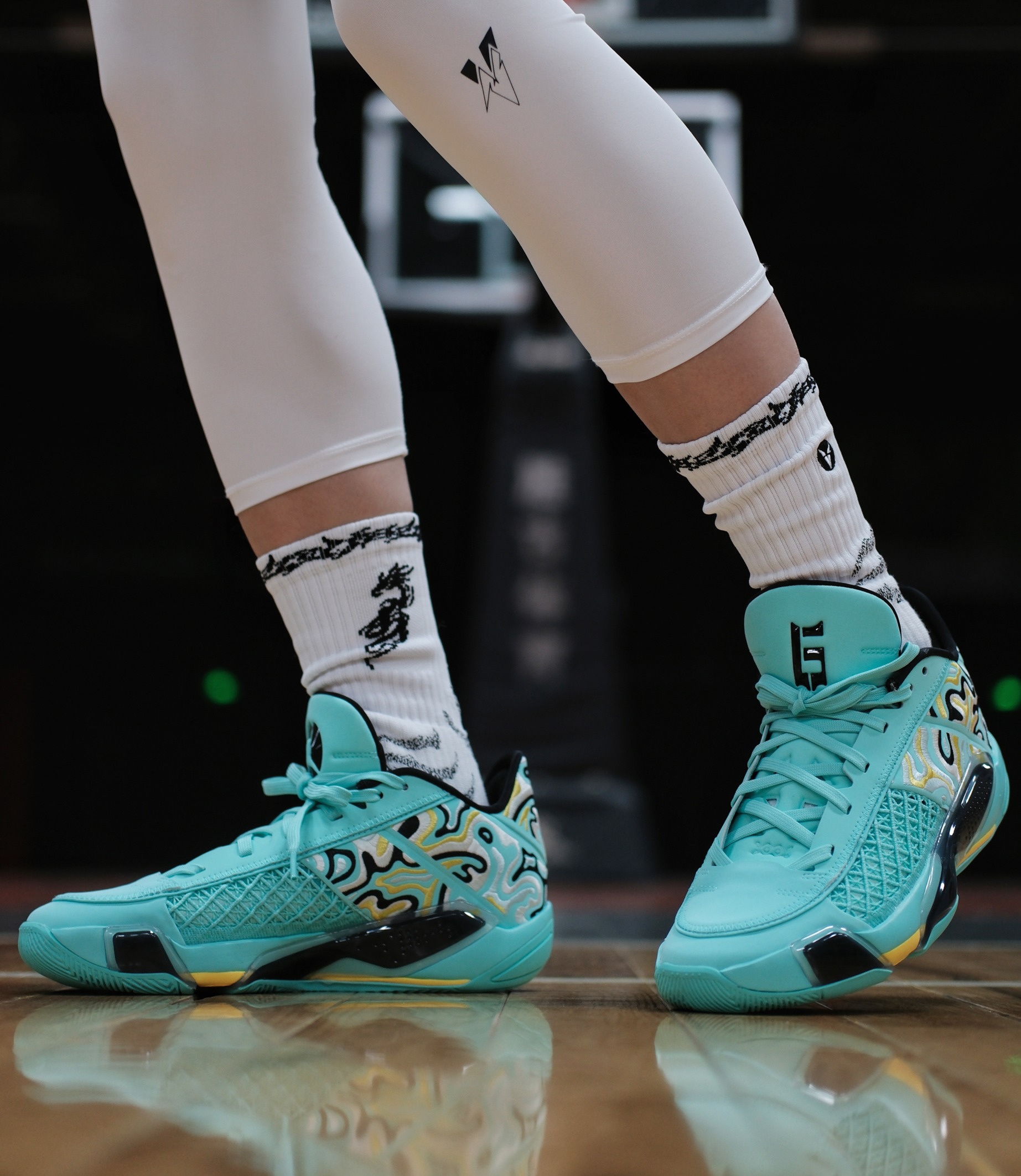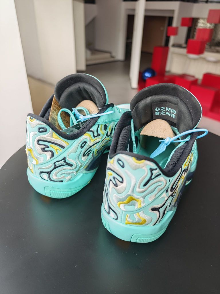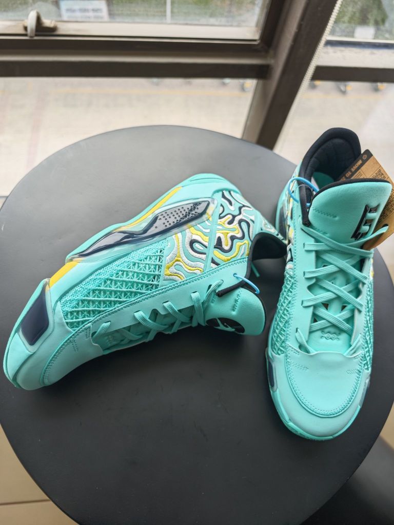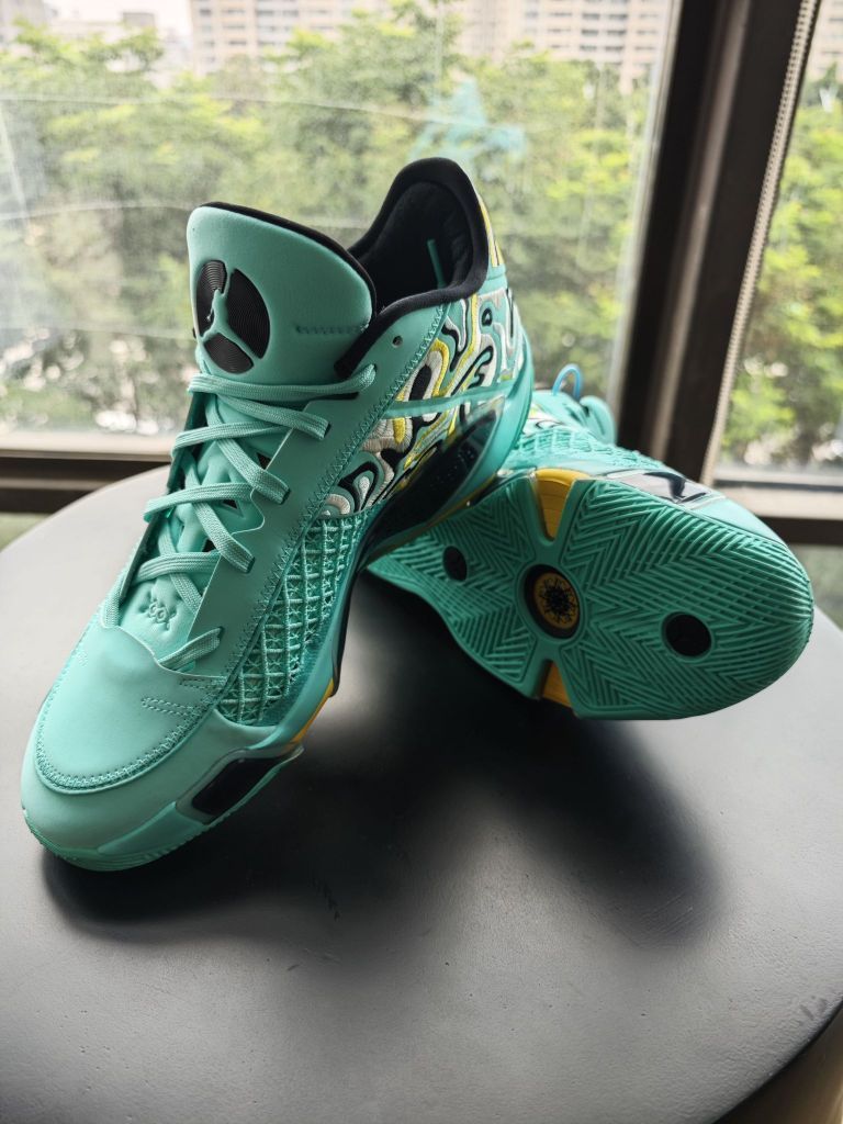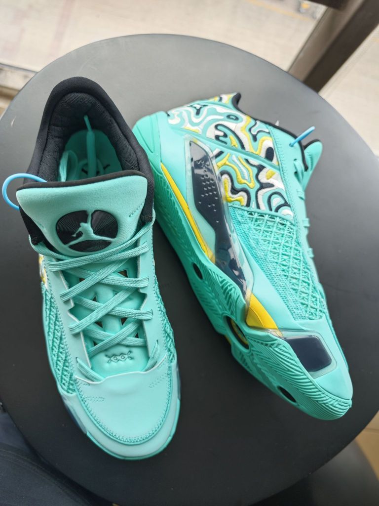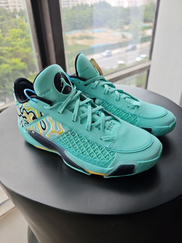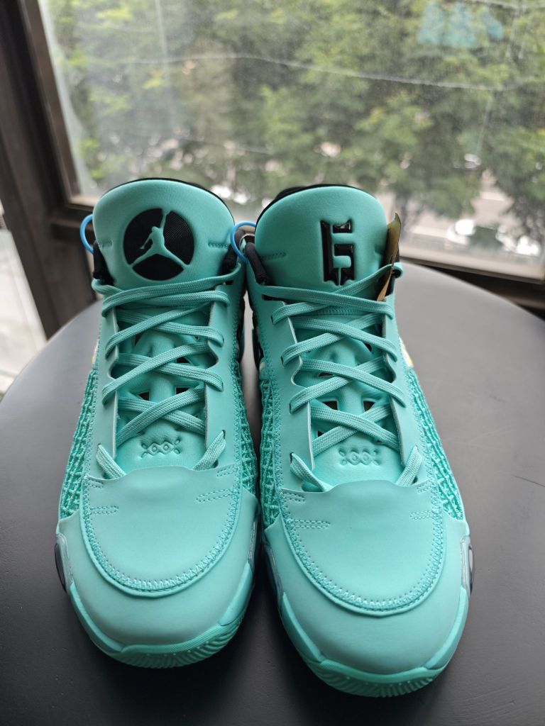 aj38low黑色伽马蓝的配色上脚实战几场之后,非常满意,趁着暑期价格合适,又入手了一双郭艾伦配色,主打夏日的清新自然。 郭艾伦配色,乔丹正代针对中国市场的专属配色,一直都是细节满满,比如一脉相承的中国玉的绿色,比如鞋舌内侧“心之所向,身之所往”的标语,比如郭艾伦的6号,等等,都是吸引大批的球友入手此款球鞋的理由。