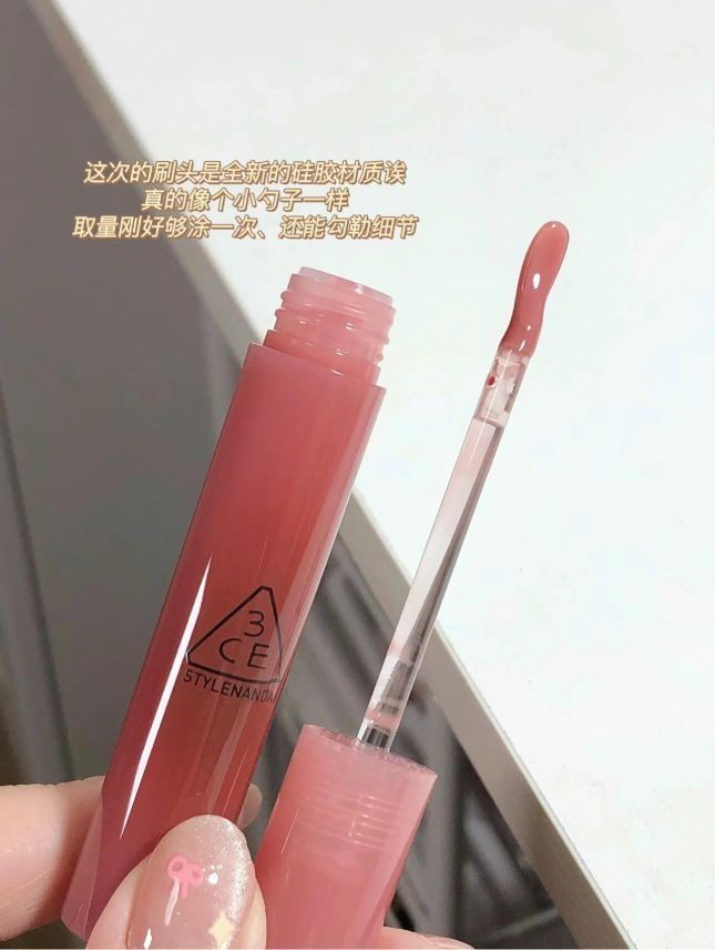 报!3CE小蜜勺来了! 春日明媚少女风我好爱 透亮的果冻感外壳、妥妥的韩系甜妹 feel 嫩嘟嘟的镜面玻璃唇好米 妆感好清透、水光感美的我说不出话(上嘴有滋润感 这次的刷头是全新的硅胶材质诶真的像个小勺子一样 取量刚好够涂一次、还能勾勒细节