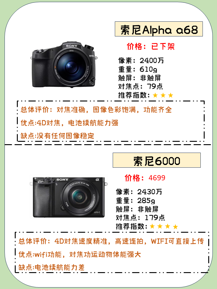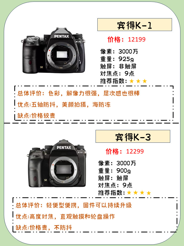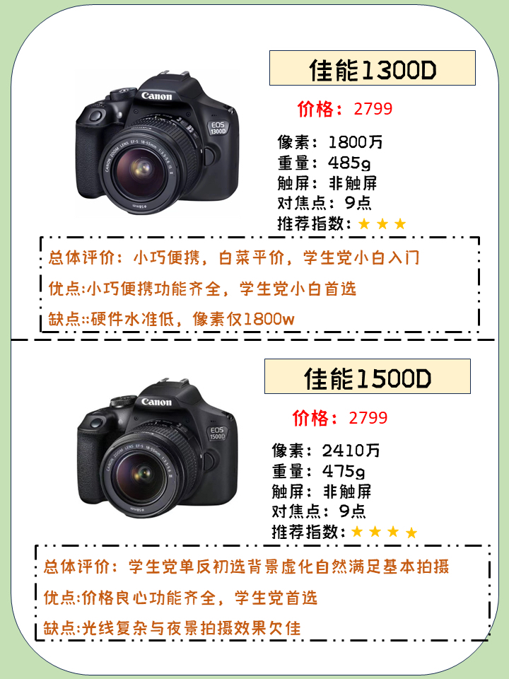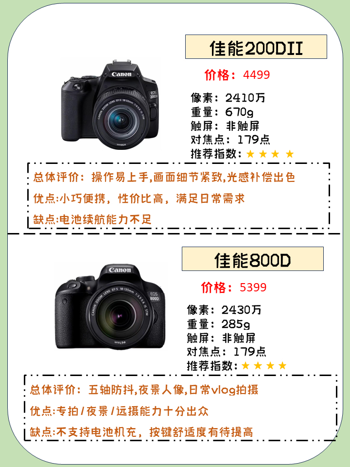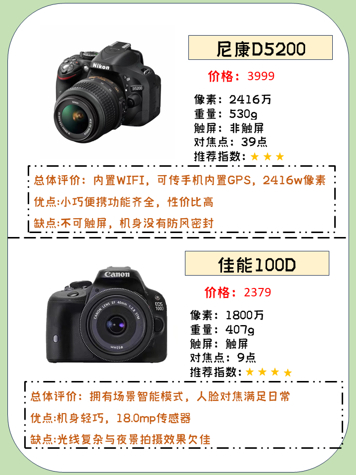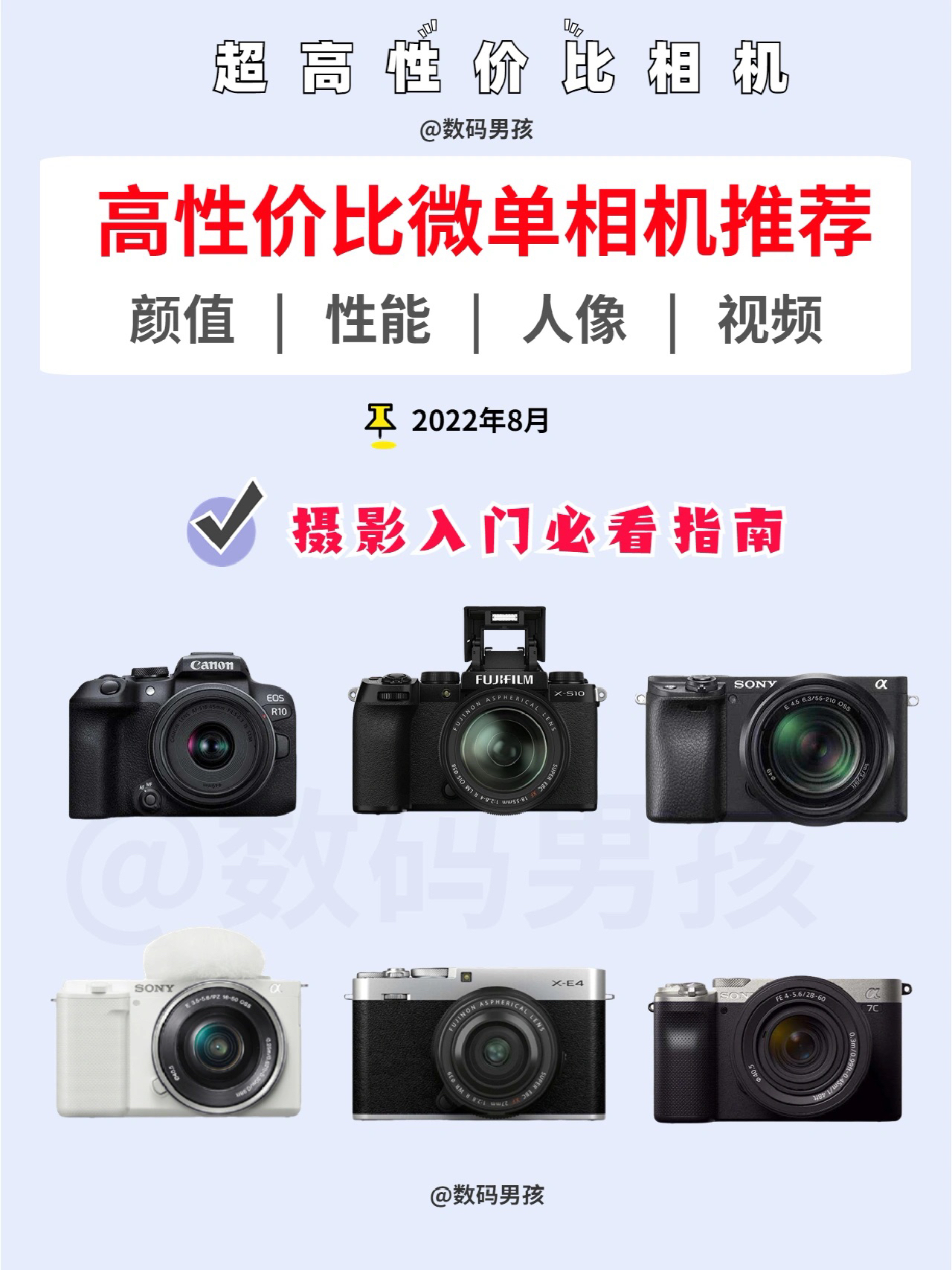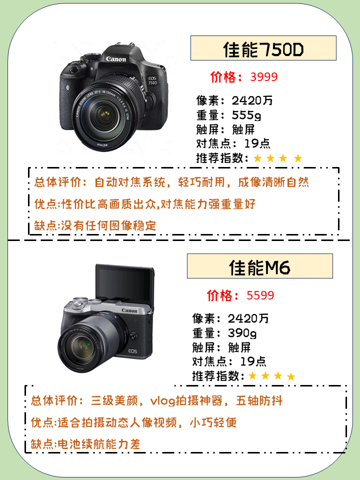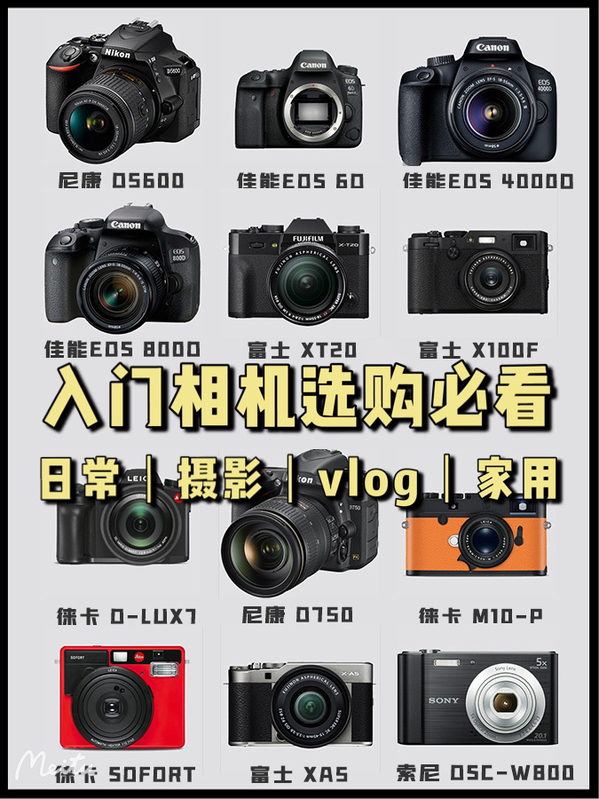 相机的选择可要细细的选择一番,快来看看吧 ✅佳能750D 自动对焦系统,轻巧耐用,成像清晰自然 优点:性价比高画质出众,对焦能力强重量好 缺点:没有任何图像稳定 ✅佳能M6 三级美颜,vlog拍摄神器,五轴防抖 优点:适合拍摄动态人像视频,小巧轻便 ✅尼康D5200 内置WIFI,可传手机内置GPS,2416w像素优点:小巧便携功能齐全,性价比高 缺点:不可触屏,机身没有防风密封 ✅佳能100D ...