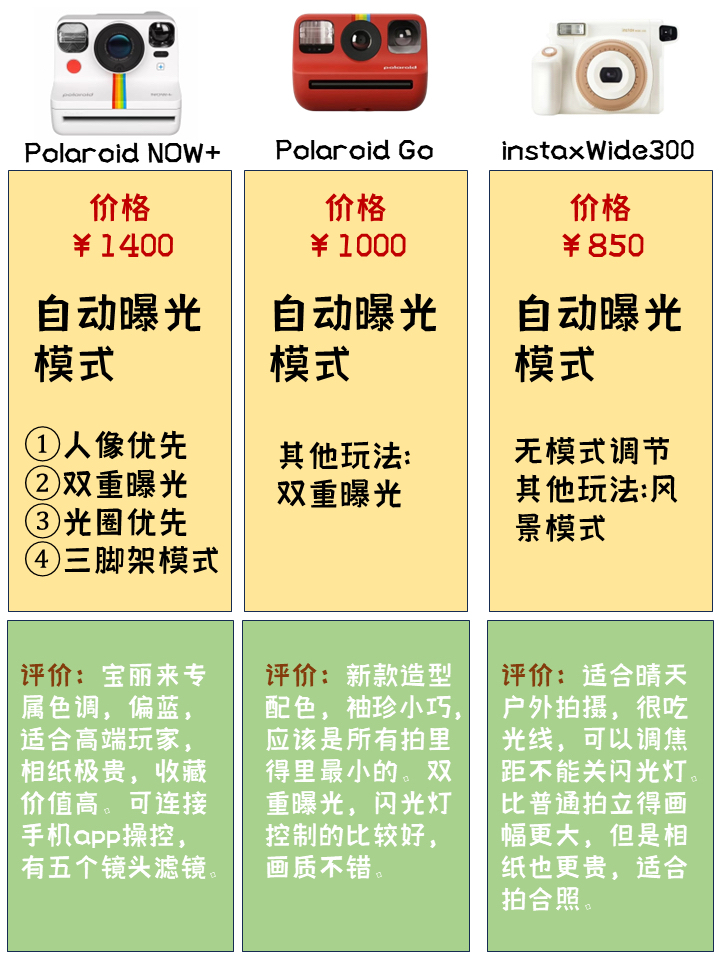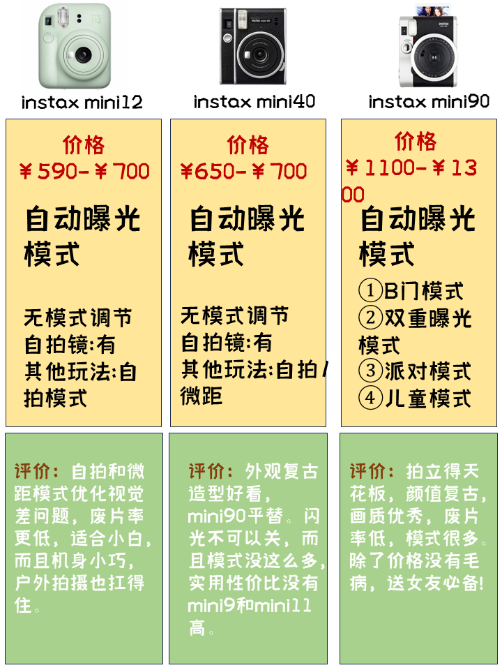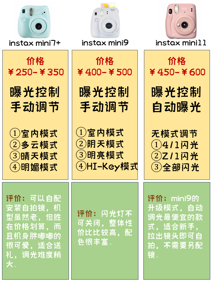 ✅instax mini7+ 可以自配安装自拍镜,机型虽然老,但胜在价格划算,而且机身胖嘟嘟的很可爱,适合送礼,调光难度稍大。 ✅instax mini9 闪光灯不可关闭,整体性价比比较高,配色很丰富。 ✅instax mini11 mini9的升级模式,自动调光最便宜的款式,适合新手,拉出镜头即可自拍,不需要另配镜。 ✅instax mini12 自拍和微距模式优化视觉差问题,废片率更低,适合小...