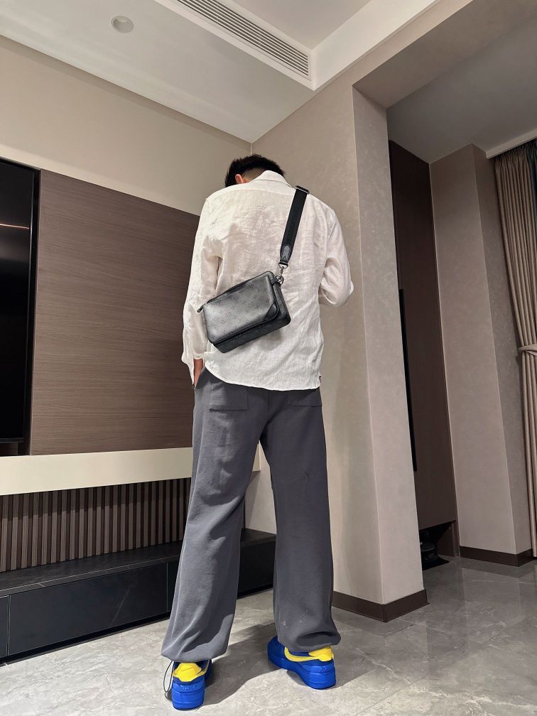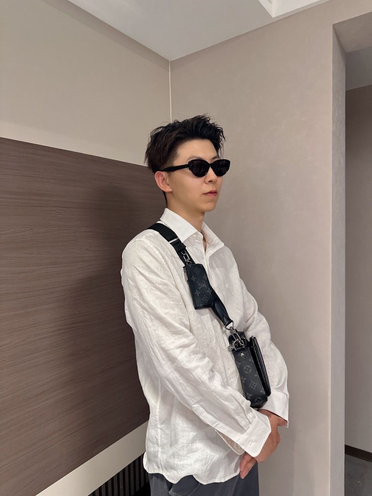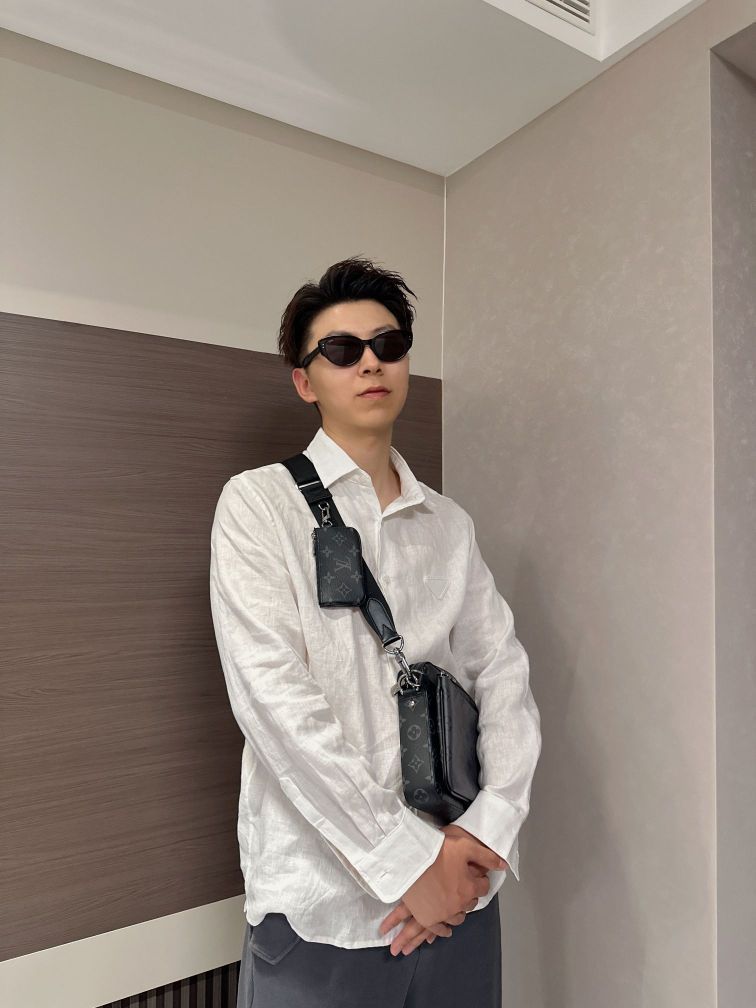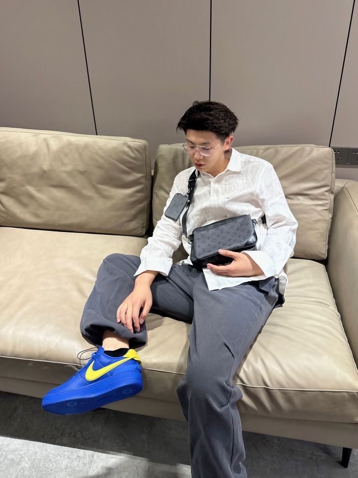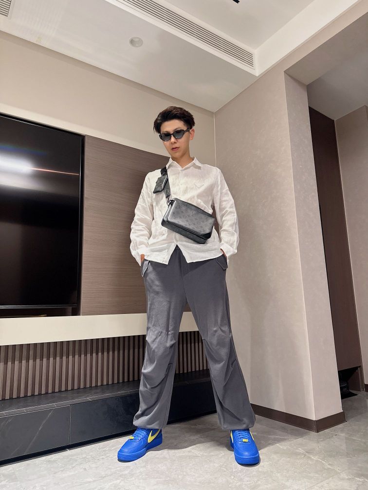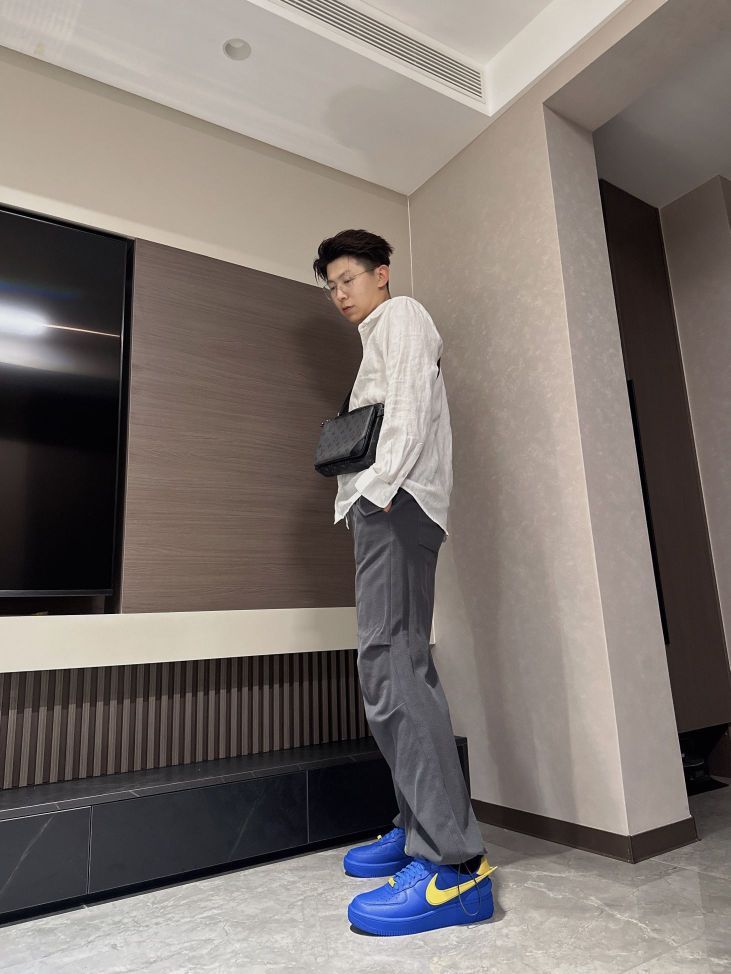 上身纯麻长袖衬衫夏季透气不闷热 👇 包是早前买的黑武士三合一 一直觉得这包是特别值得入手的一款百搭性价比贼高 👇 鞋子AMBUSH空军 蓝黄配色 不难配衣服还有款绿色也不错 👇 墨镜fakeme 我超级喜欢的一款墨镜配衣服真的很好看但就是有点小贵