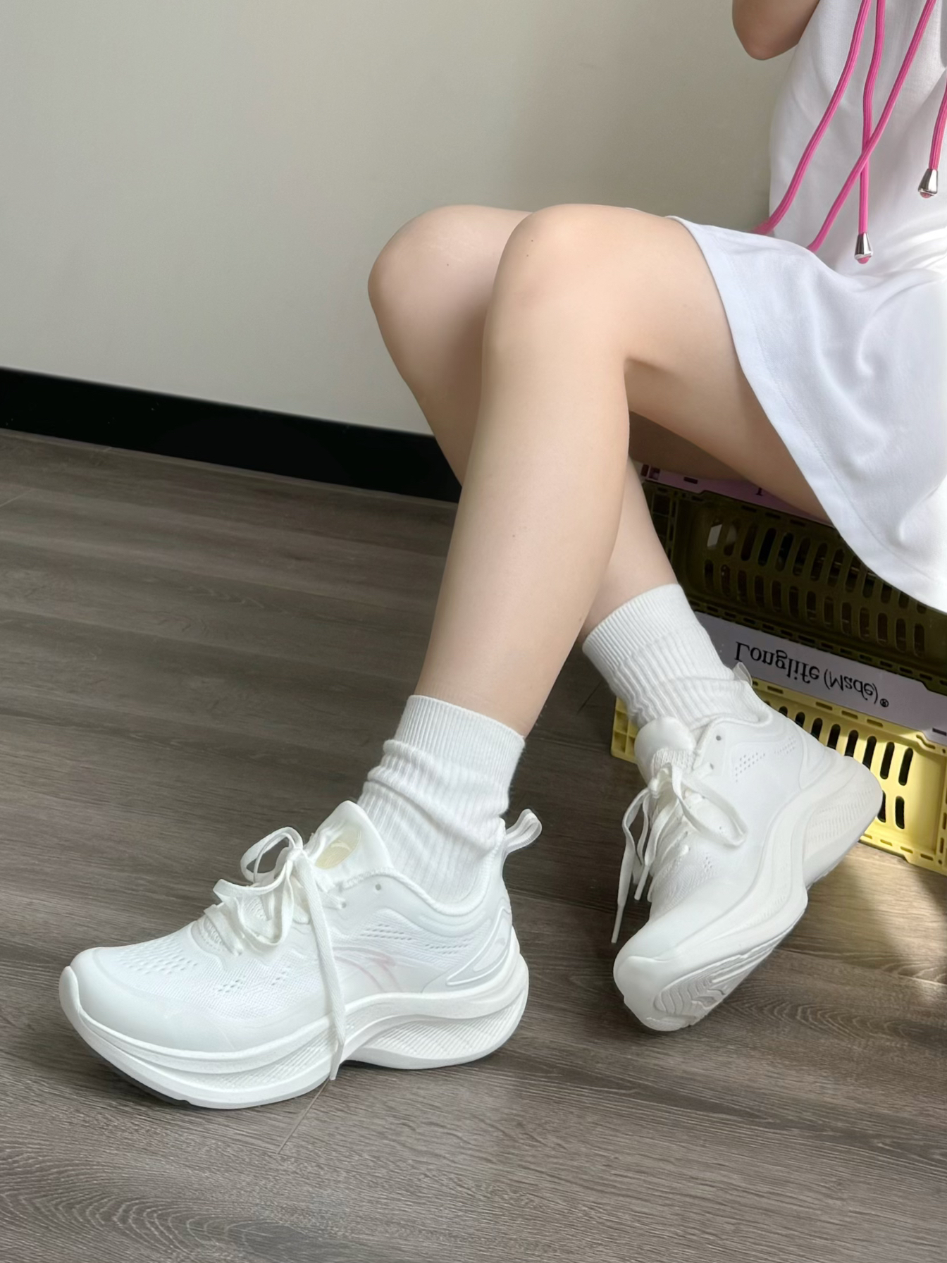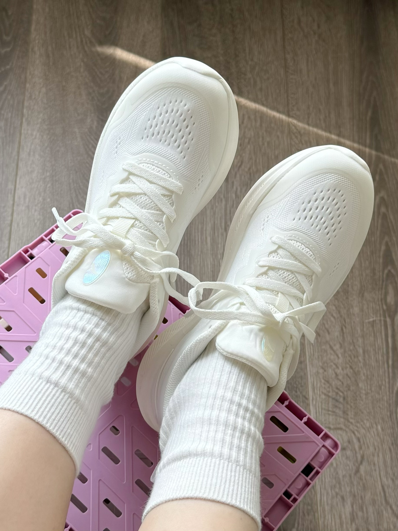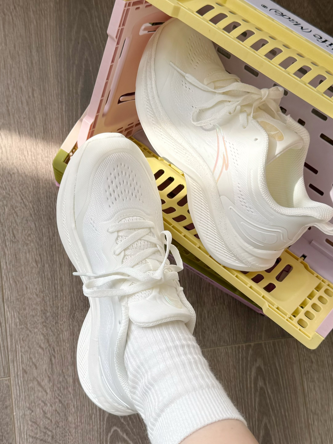 一双闪闪亮的白色跑鞋!! 是属于夏天的奶呼呼配色! 轻薄网面透气舒适~ 脚感蛮轻弹的!包裹性也不错! 白色还超级百搭! 和我所有颜色的运动服都适配诶