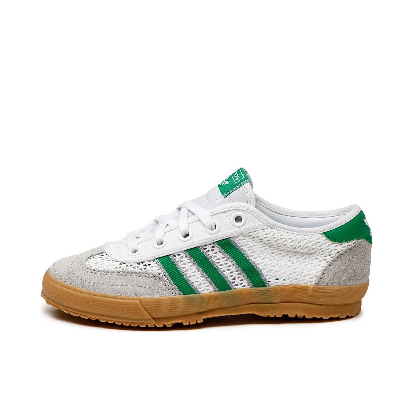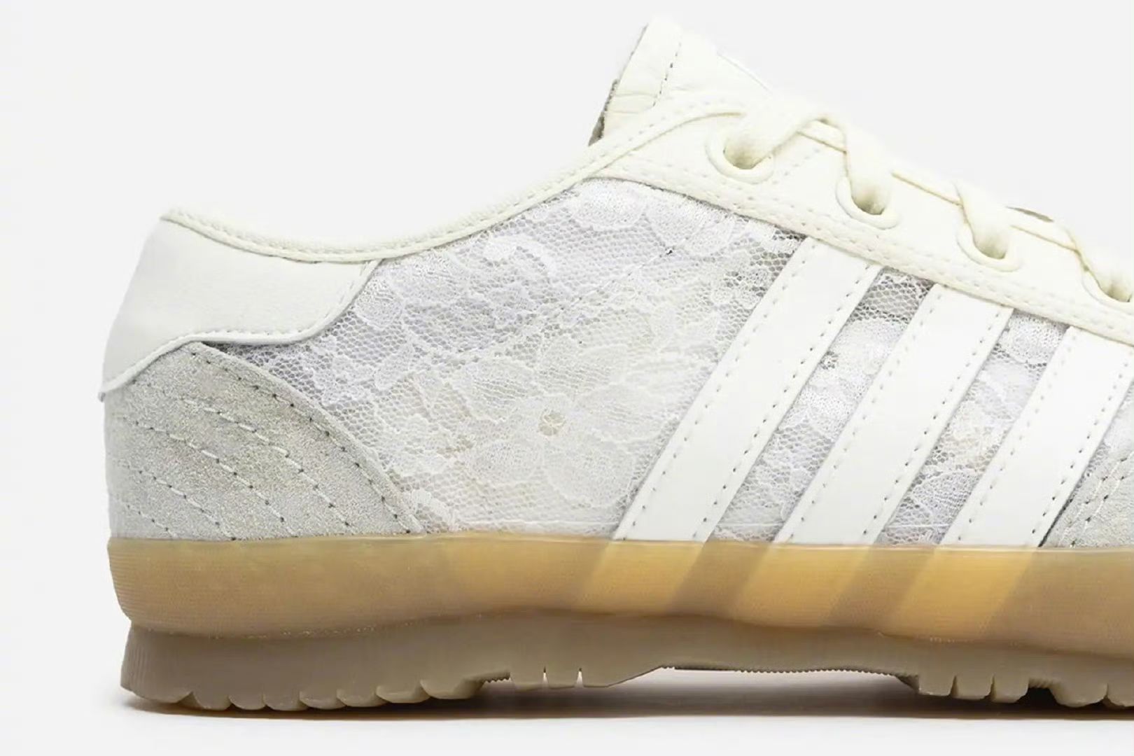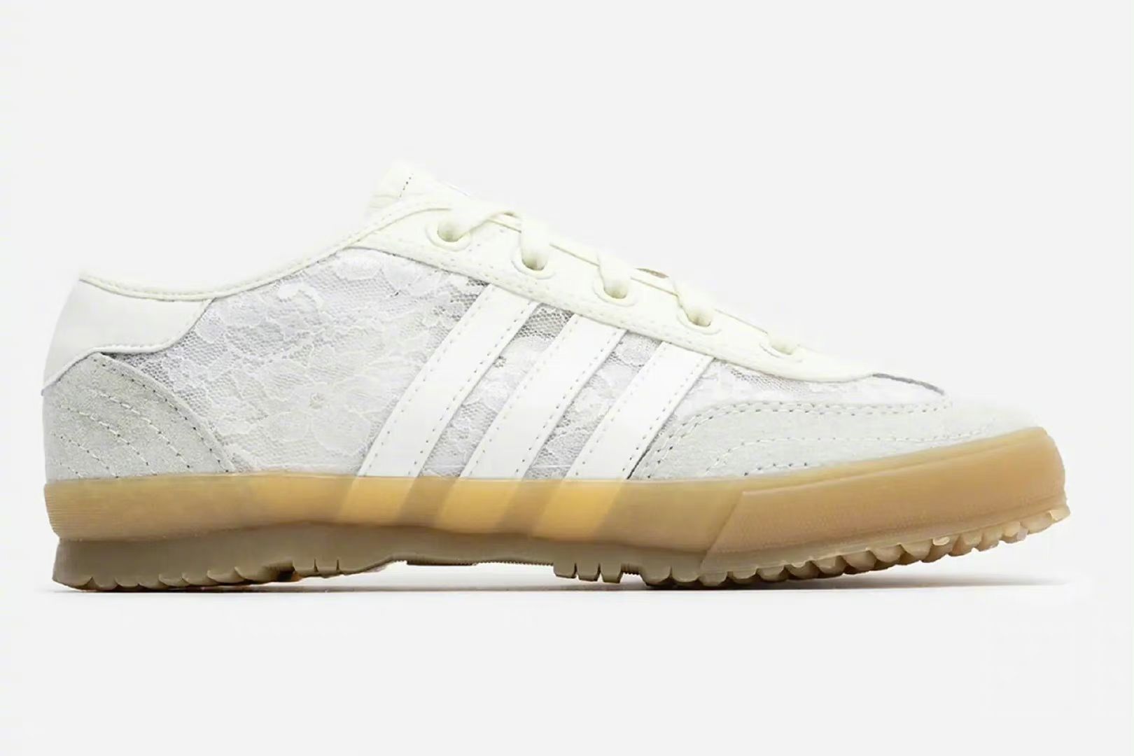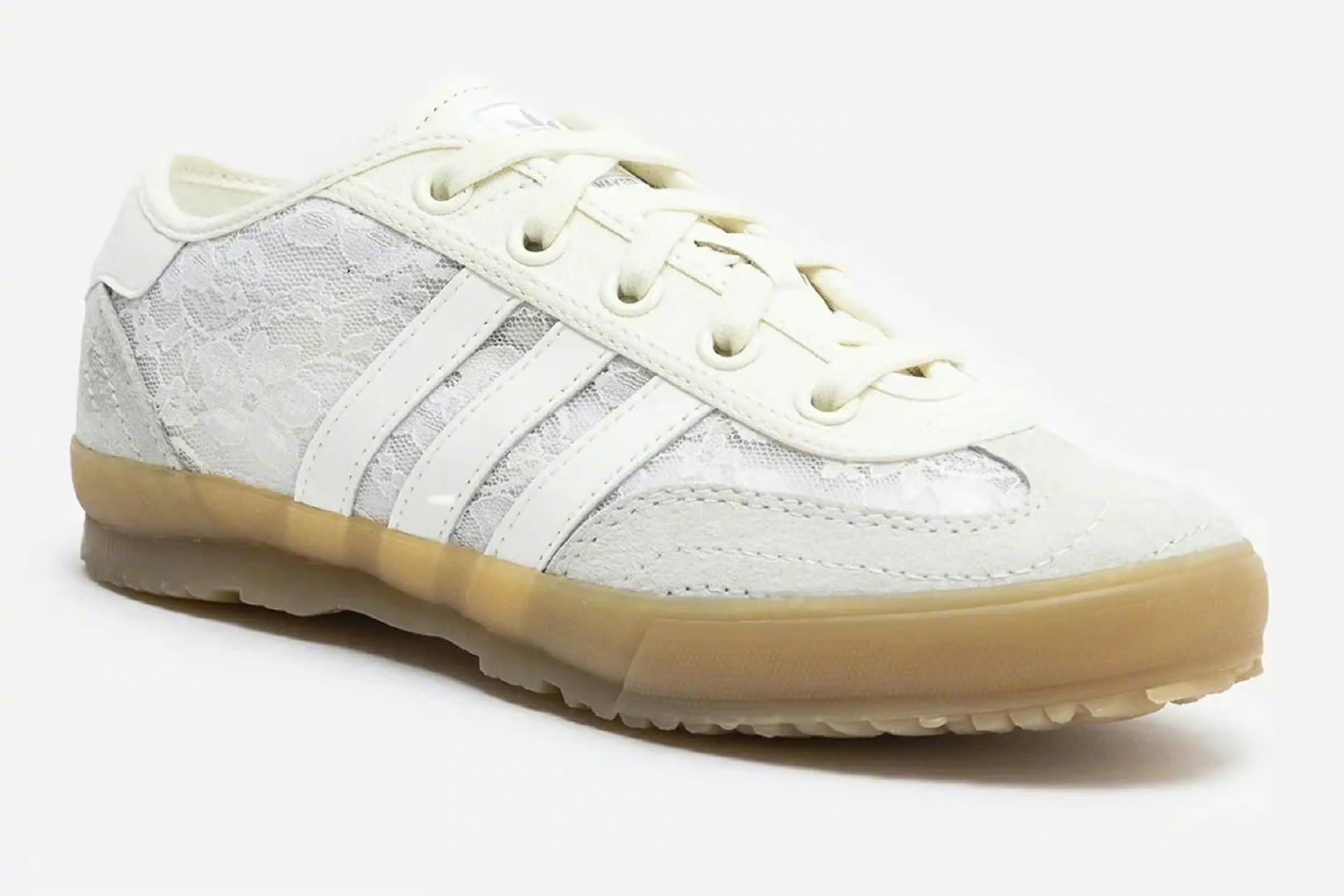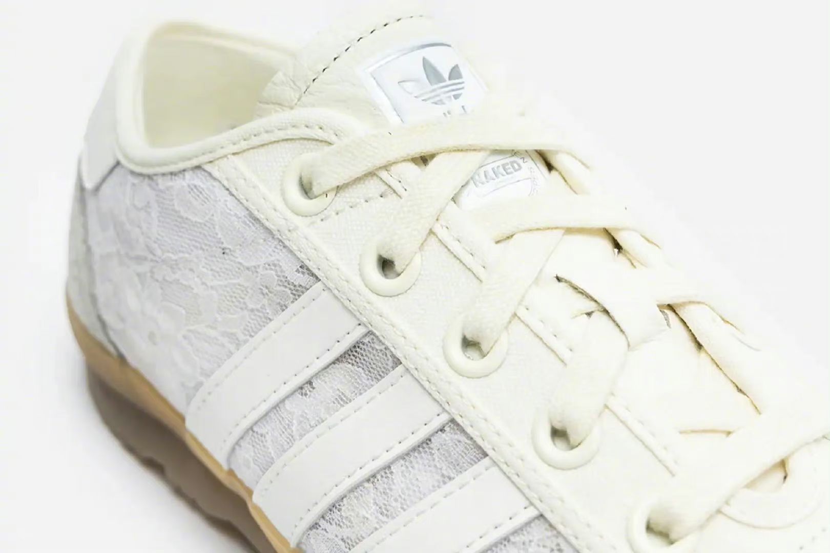 Naked x adidas Tischtennis 以女性为中心的潮流店铺NAKED与adi合作推出以复古乒乓球鞋Tischtennis为蓝本的联名版本,鞋面以白色蕾丝进行装饰,象牙色帆布和白色皮革三道杠、灰色绒面革T形鞋头和鞋跟,生胶色上包外底的设计。 2024.8.8 / JI3995