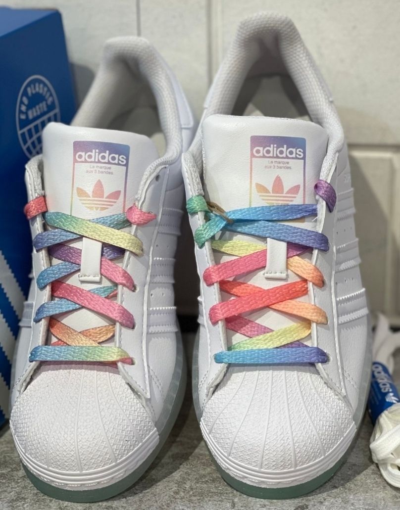 三叶草纯白贝壳头+靓丽彩虹色鞋带 白色合成革鞋面质感好,易于打理。 透明橡胶外底+彩虹🌈色底 想要简约可以搭配白色鞋带 可以自己穿,可以送给朋友👀