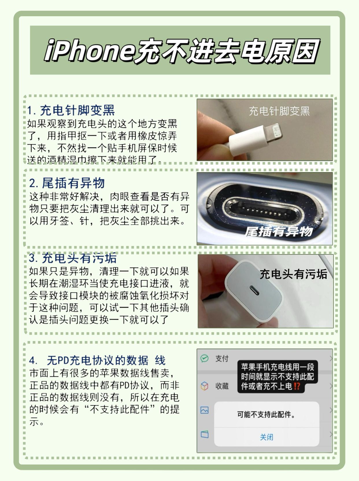 4个实用小技巧,我们在选苹果快充充电时,是不是经常担心影响电池🔋健康呢?其实不用担心,本笔记为你详情介绍iPhone充不了电以及解决方法,详情的评测各大品牌的苹果充电器对电池的影响和性能。 1️⃣省点钱💰拯救自己的苹果快充 关于充不了电,看看自己的苹果充电器的数据线有没有那个插针有点黑,或者有灰尘,打酒精或者干净的擦布来擦干净,清除异物一般都可以恢复正常充电❗️ 2️⃣如何挑合适苹果快充 苹果充电...
