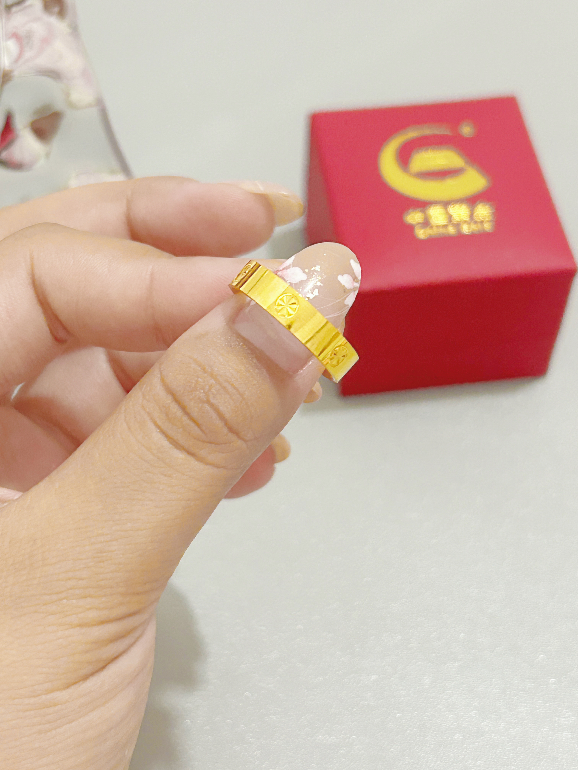 浅浅分享一下七夕男友准备的七夕礼物吧~ 是中国黄金家的一个黄金戒指 金灿灿的黄金光泽 戒指上刻的米字bling bling的 还蛮有小设计呢 我觉得戴在手上一整个贵气感 日常搭配起来蛮百搭精致的 咱就是说~尊嘟拒绝不了金灿灿的黄金带来的快乐呀