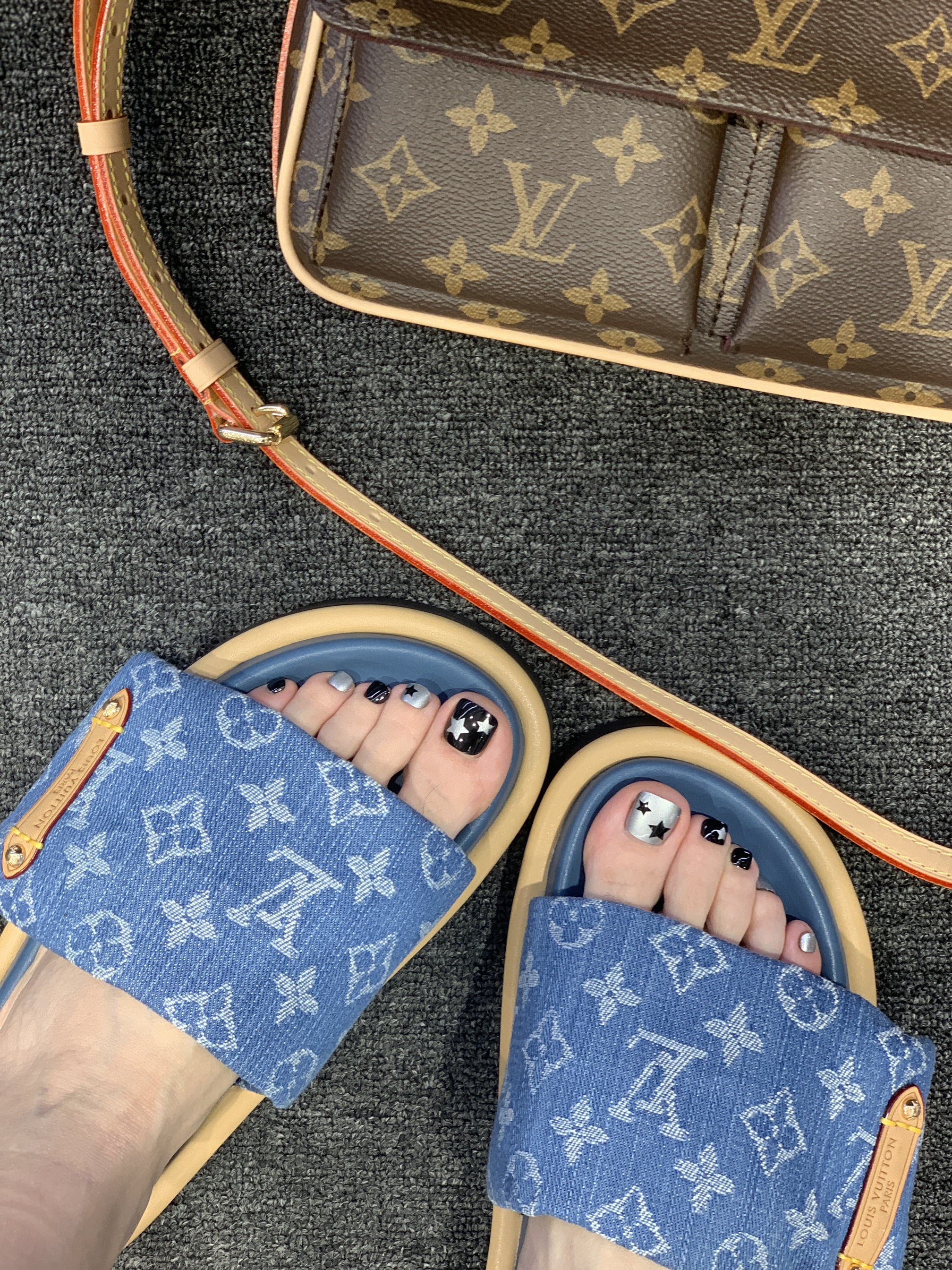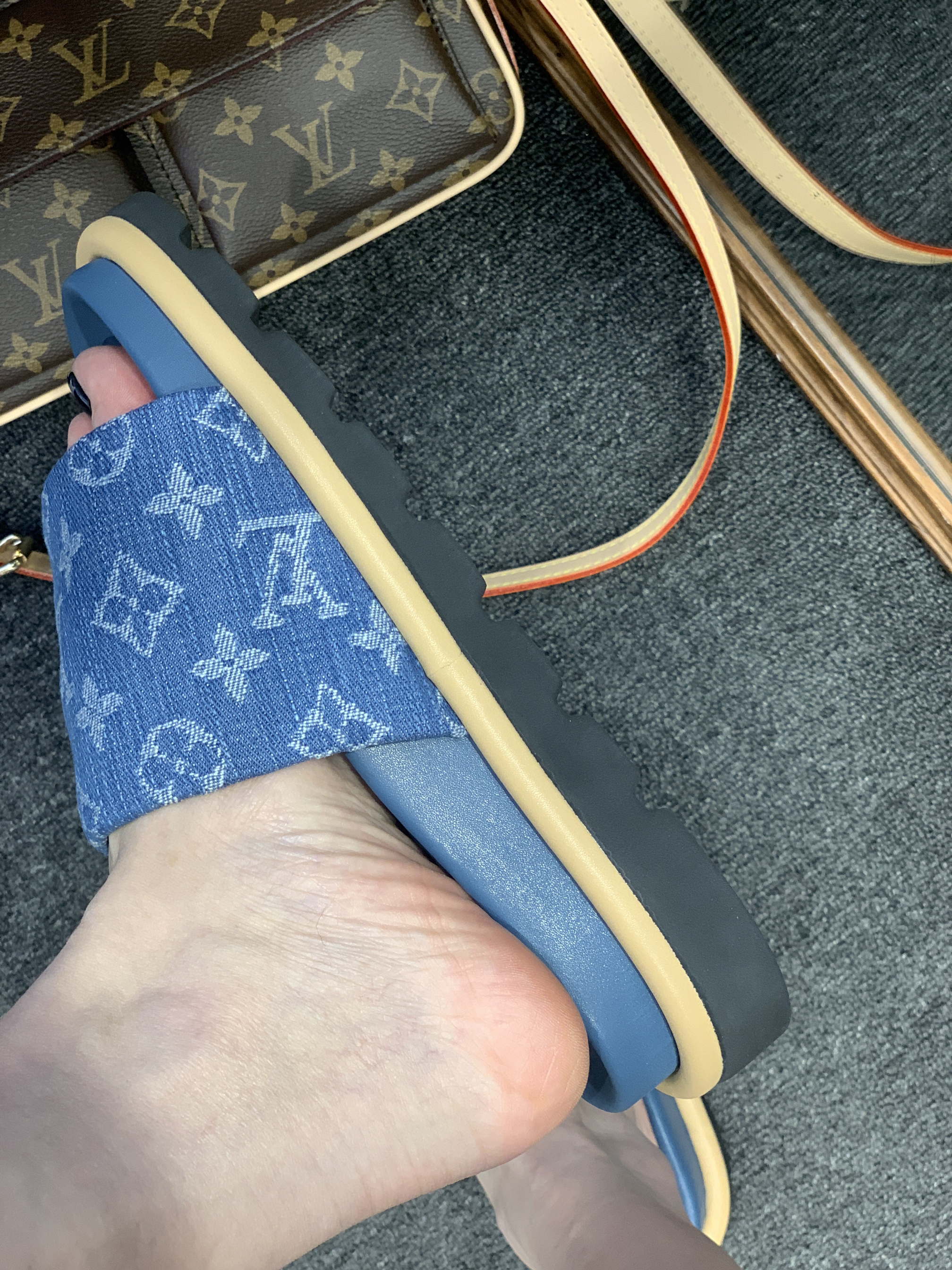 lv这双牛仔拖鞋真的好可爱哟~软绵绵的鞋面真的好像面包🍞呢 上脚特别轻,也有两三公分的厚底,好评呀 成功安利我的朋友买去度假🏖穿 哈哈哈