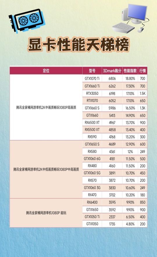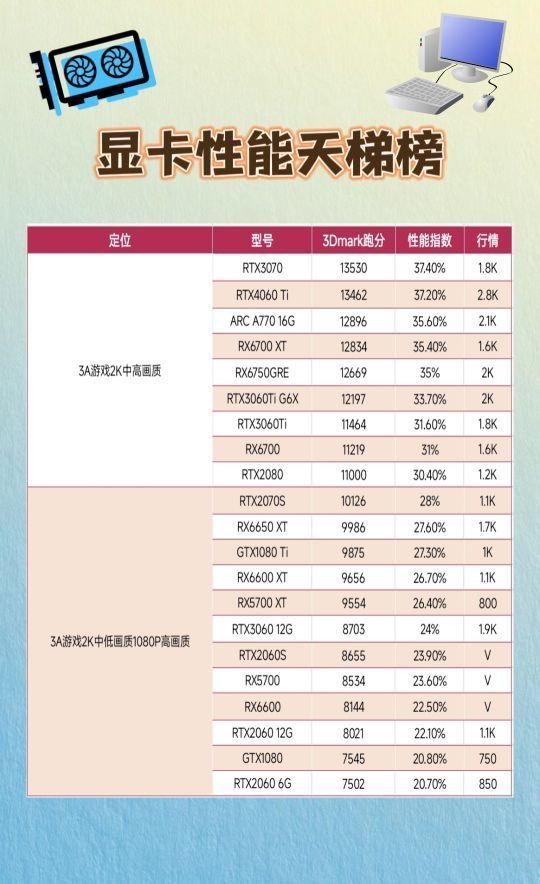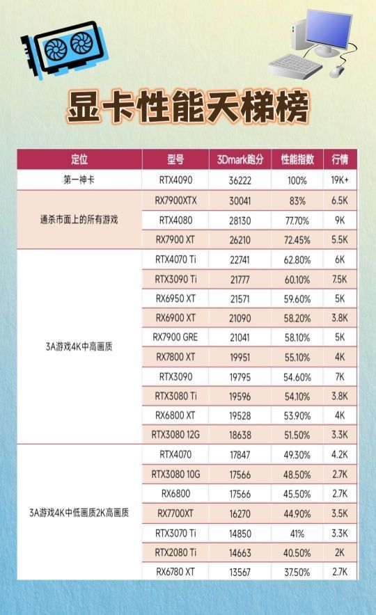 市面上现在显卡多种多样,一些数码小白装机的时候弄不清楚,而且还容易被割韭菜,这篇显卡性能的笔记可以直观的展示各需求阶段适合的显卡以及跑分和价格,希望可以帮到你。