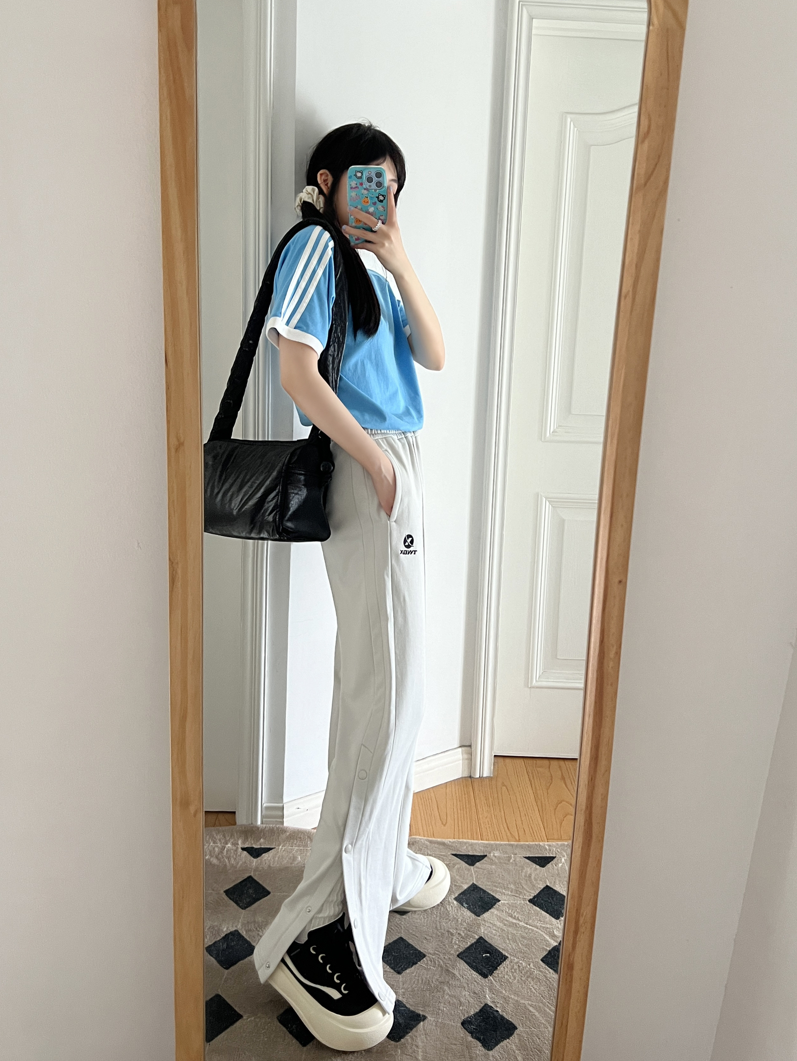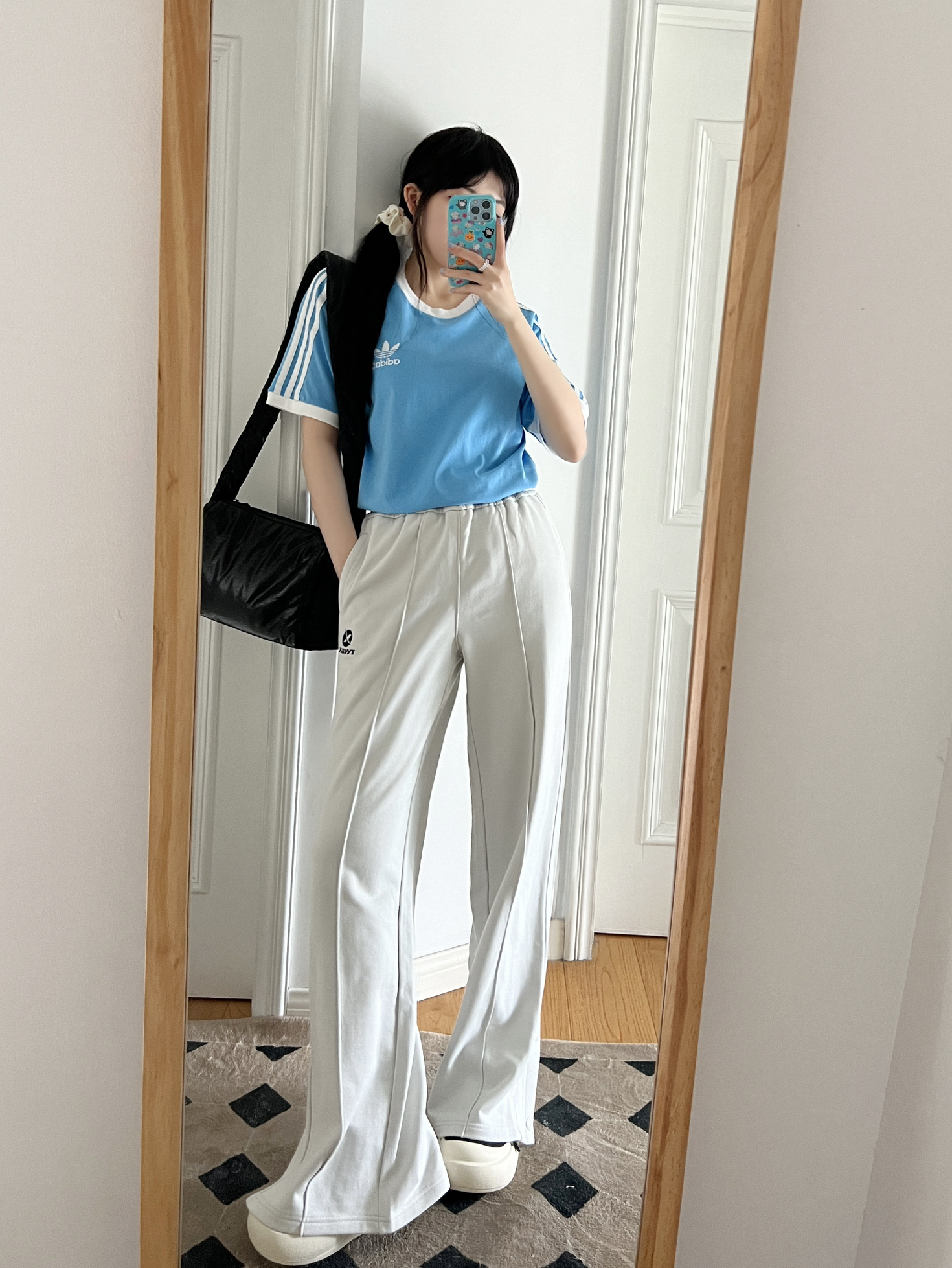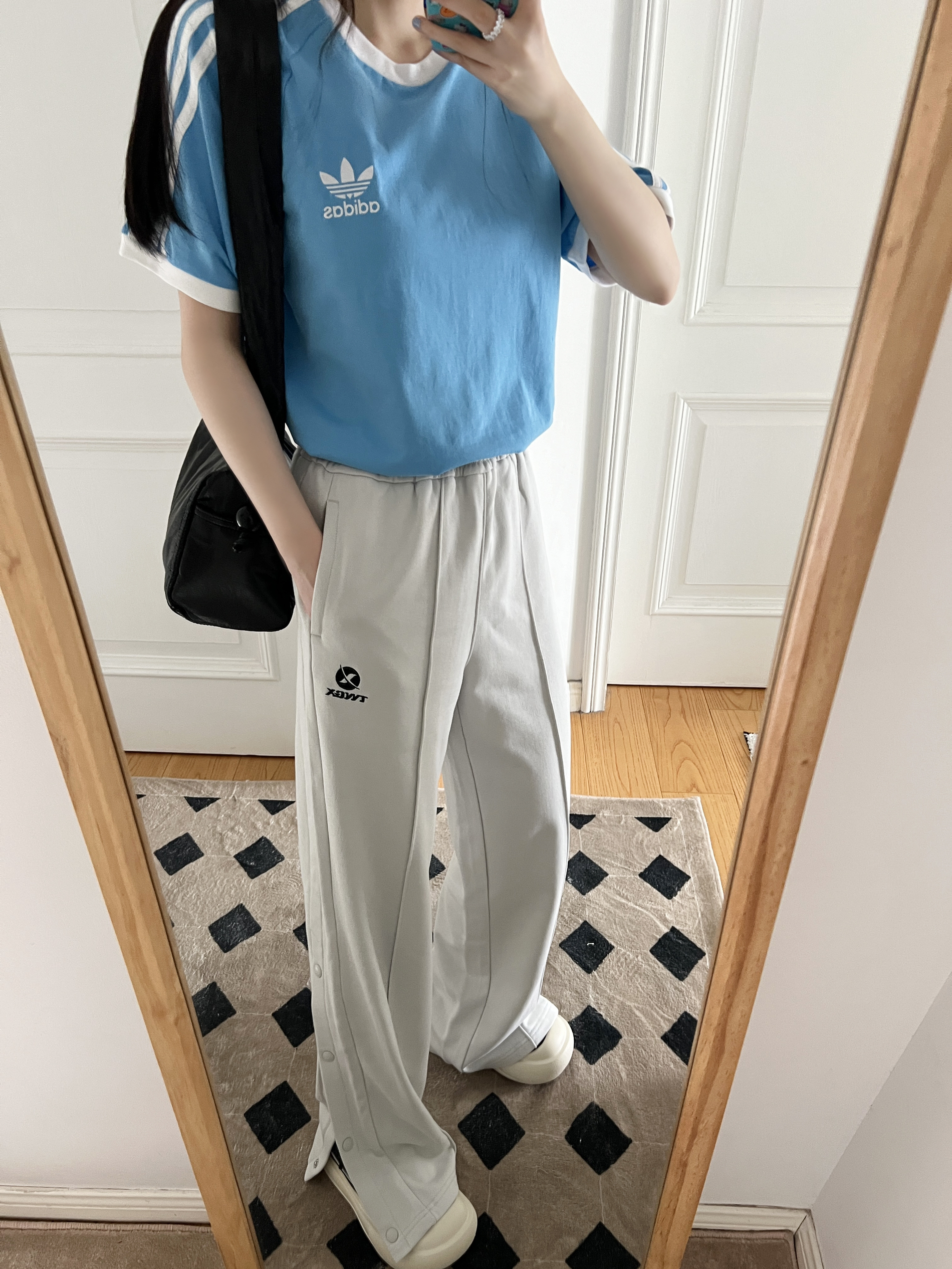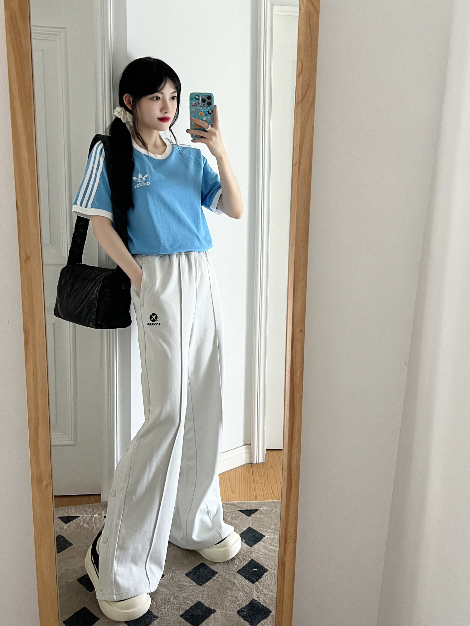 蓝色复古T恤🧊➕灰色直筒裤🆒 这件裤子的版型真的好好呀~ 直筒高腰的设计👀拉长腿型 随便搭配一件T恤就很好看啦✨