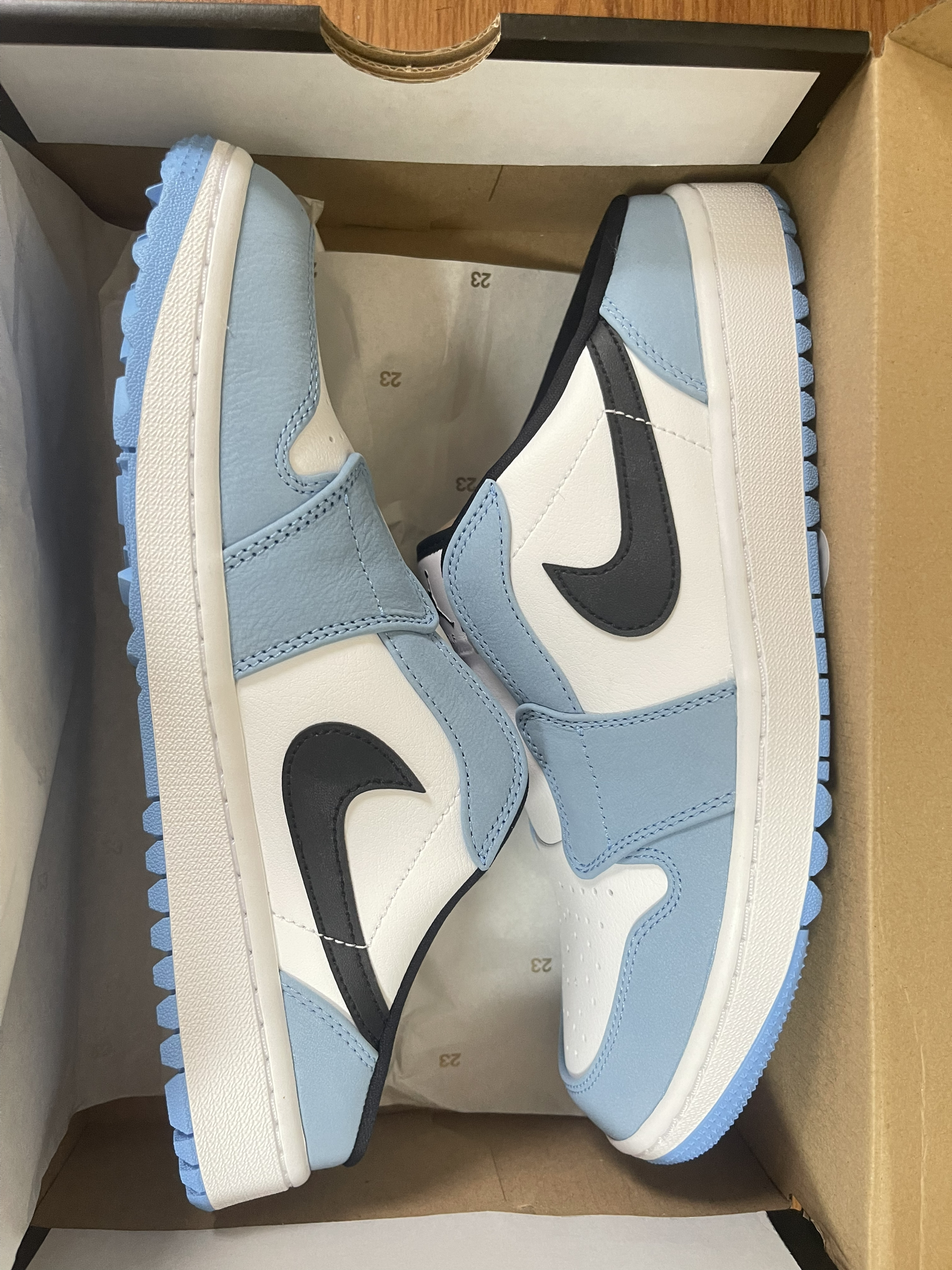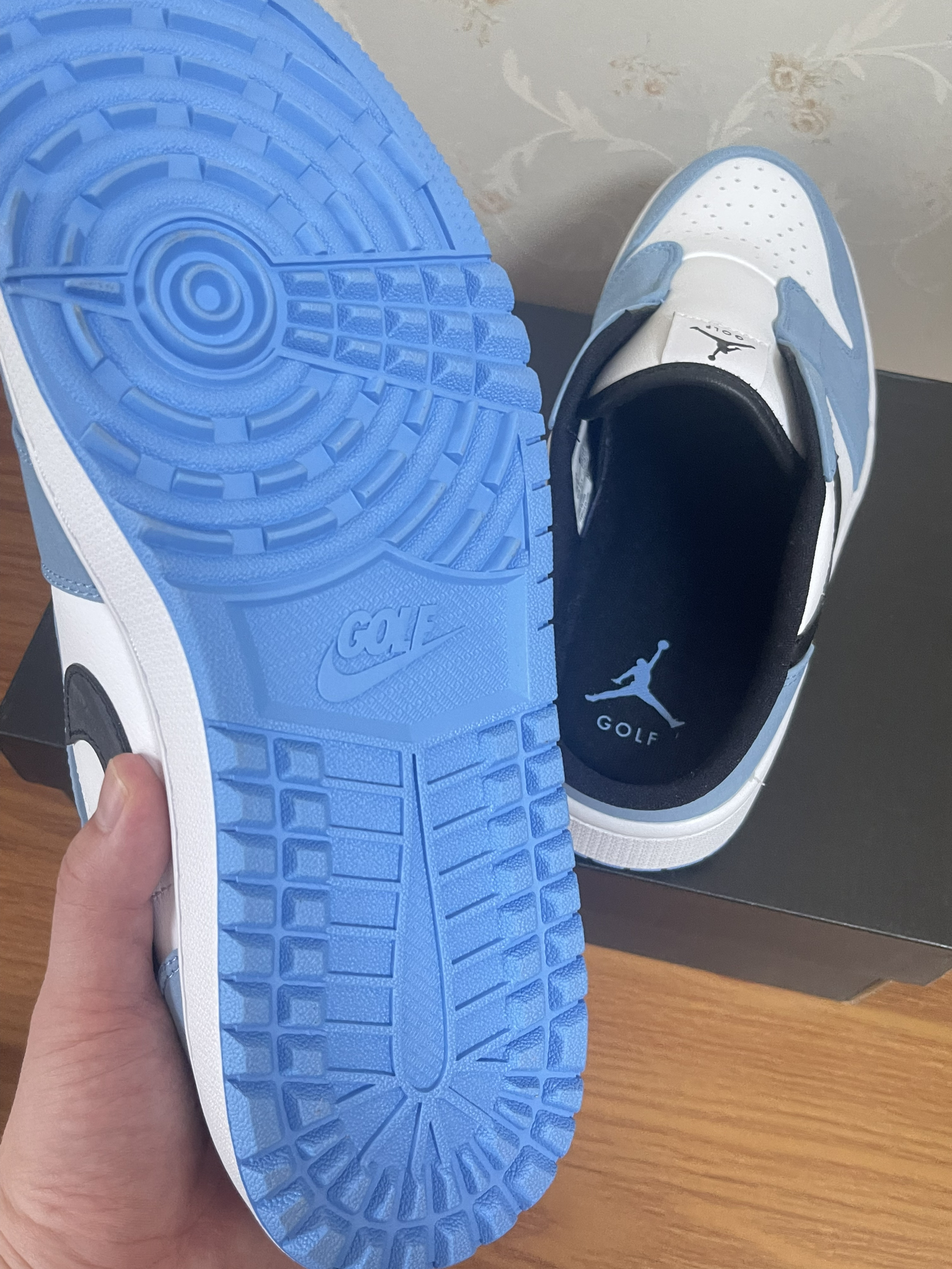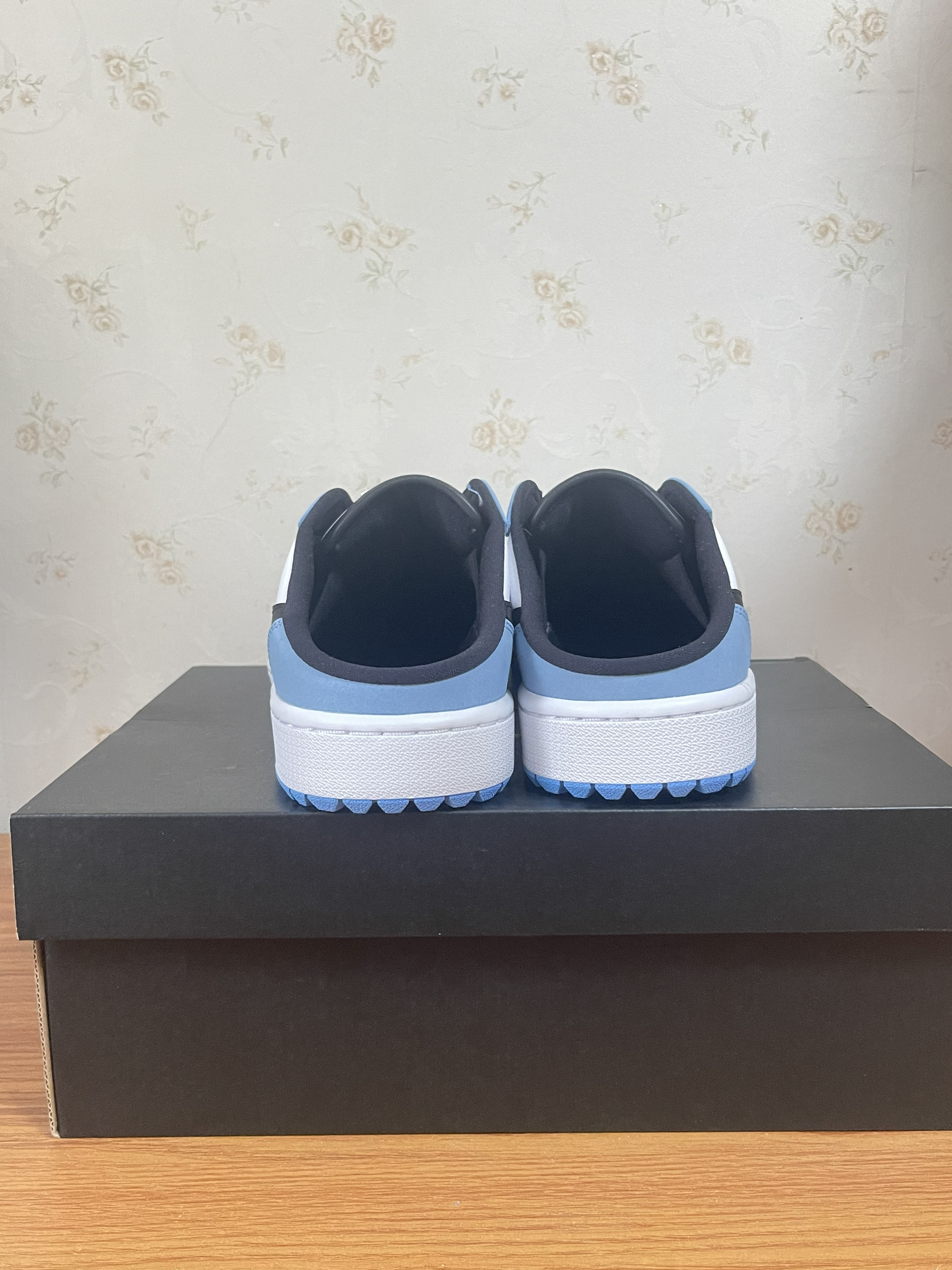 👟球鞋名称:AJ1low mule 🔍分享理由:AJ1low的钟爱粉不能没有一双AJ1low的拖鞋。北卡蓝➕夏季简直绝配! 🤔整体感受: 1.尺码建议买大一码,鞋楦偏窄,偏矮。 2.一脚蹬的体验非常爽,鞋子包裹好,鞋子跟脚。 3.蓝色部分麂皮材质,质感拉满。 4.还是建议穿袜子上脚哦。