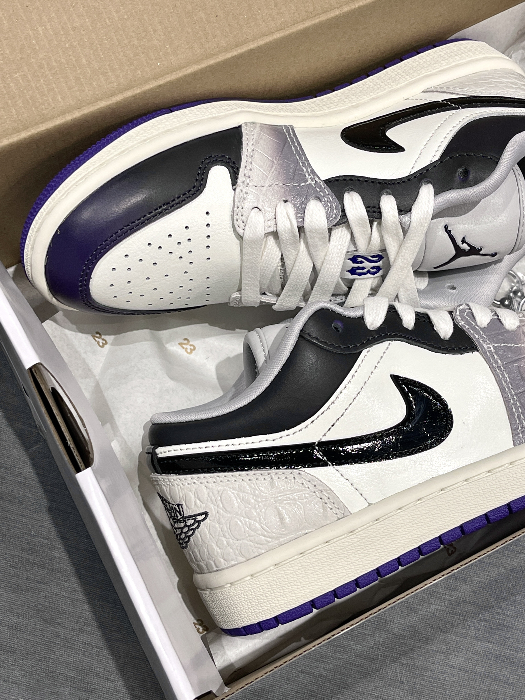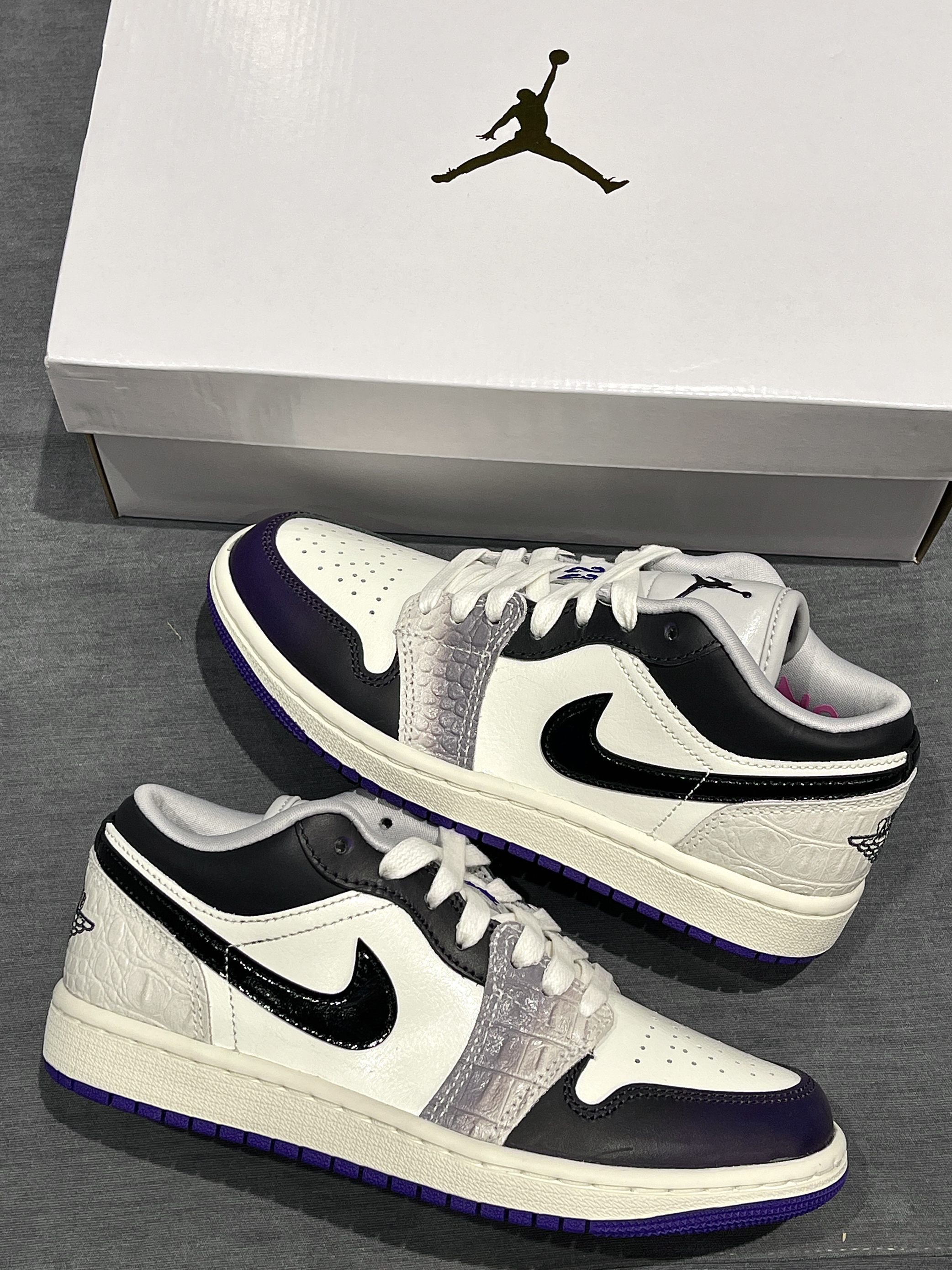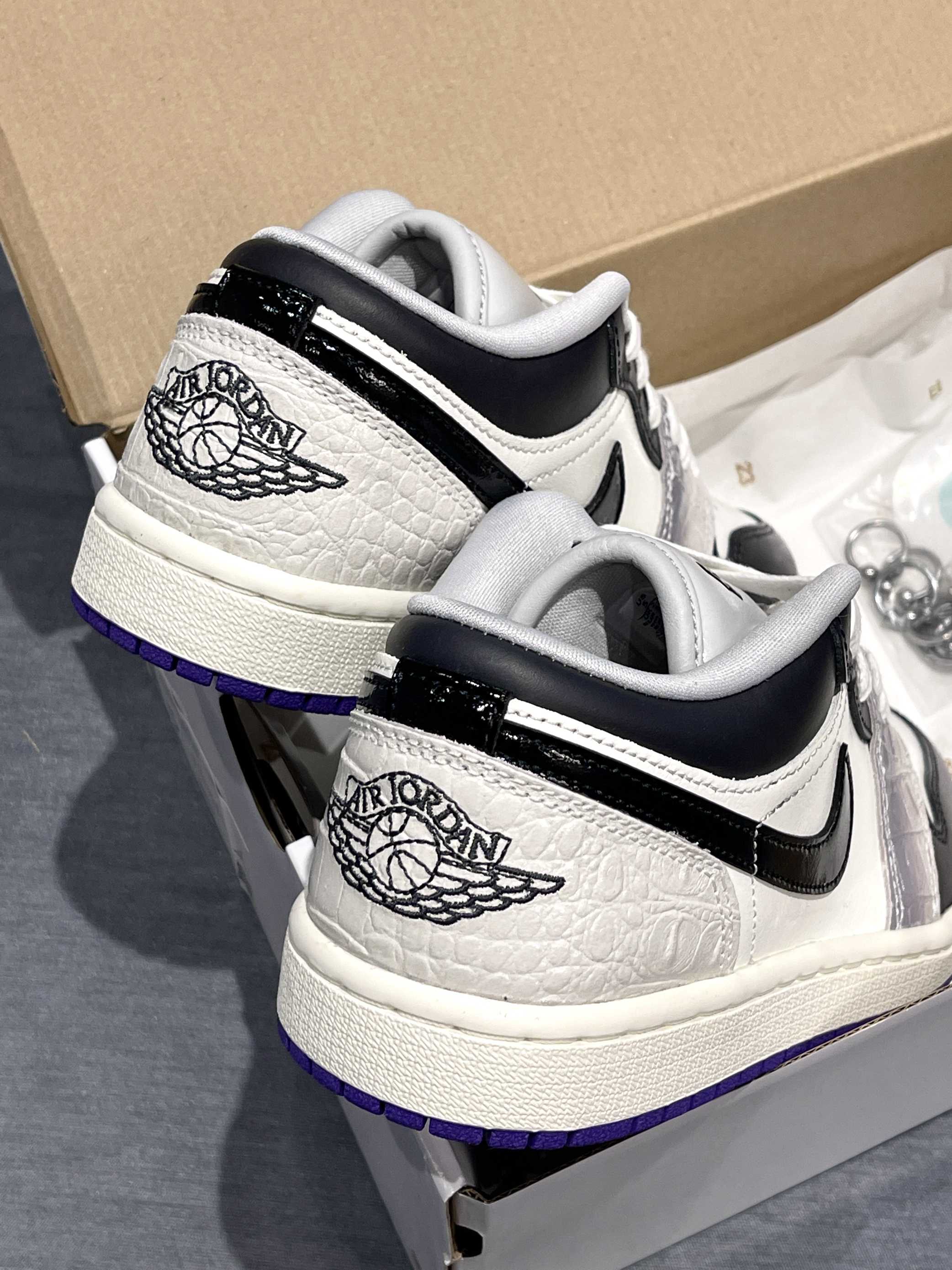 aj1low调色盘又发力了嗷,这次确实用点心思! Jordan|Air Jordan 1 Low SE 低帮 复古篮球鞋“白黑紫”,经典复古低帮aj1low鞋型,皮革类似鳄鱼皮的感觉🐊,整体小众又高级!搭配上附赠配饰,个性满满~😍