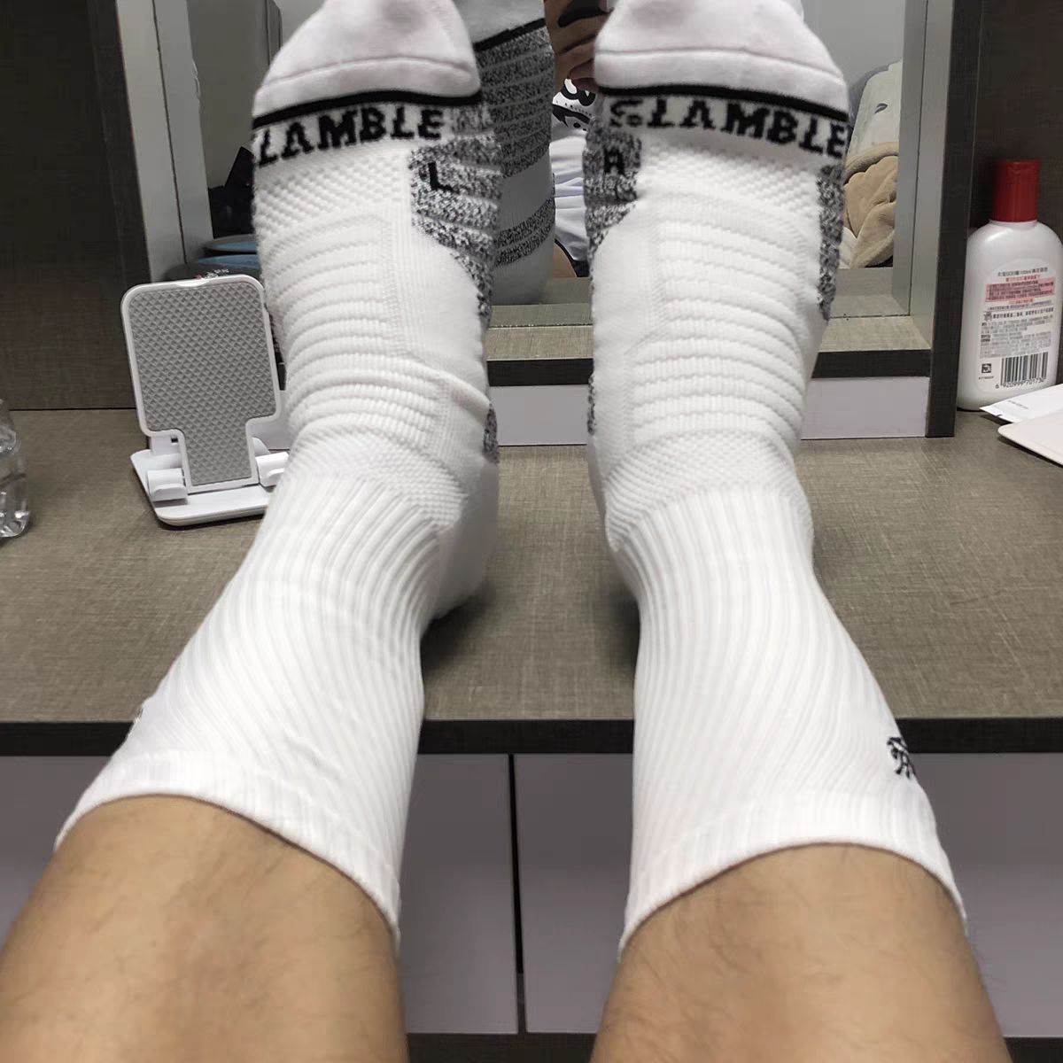 🔥🔥众所周知,买了好看的鞋子,如果不配一双好看的袜子等于白买!而配鞋子最百搭最实用的就是长白袜!无论是运动风,休闲风,都能轻松驾驭。 质感非常好,加上篮球袜的防滑纹理穿起来很合脚。 ❤️❤️独特的logo也是非常有设计感,恰到好处,潮流感十足!