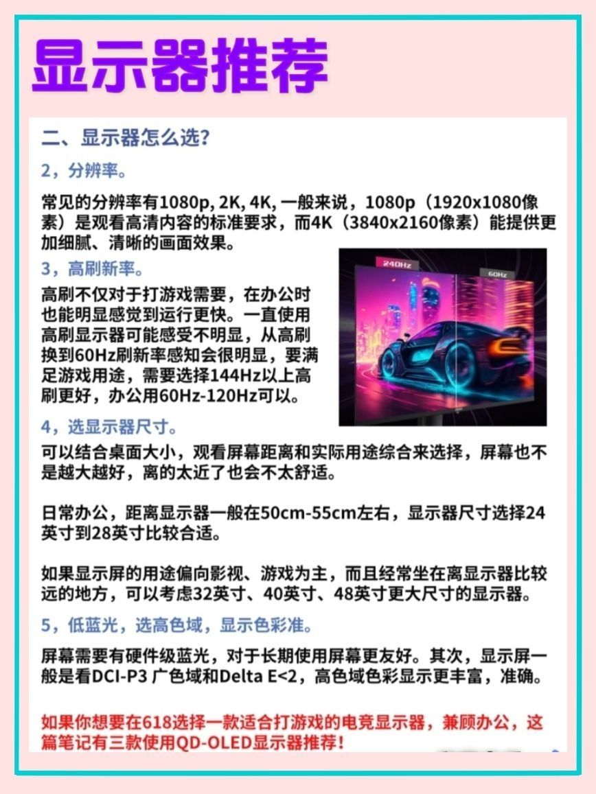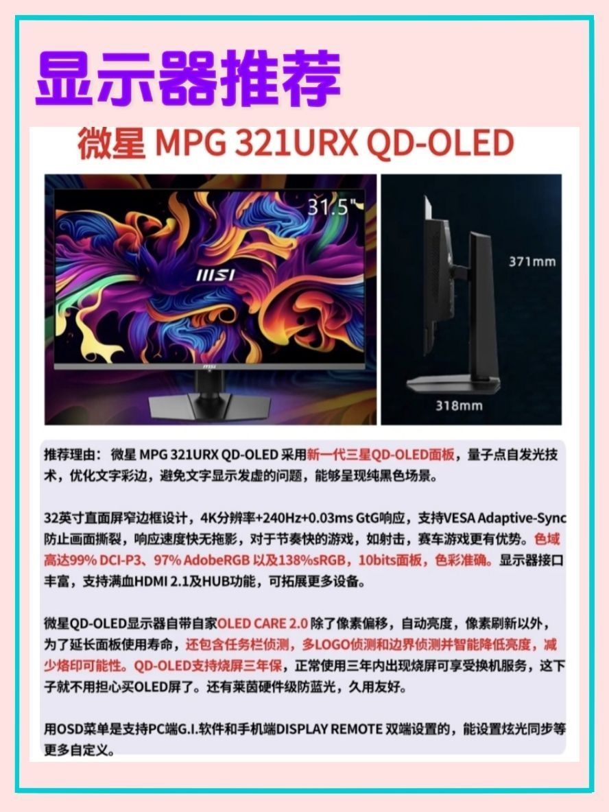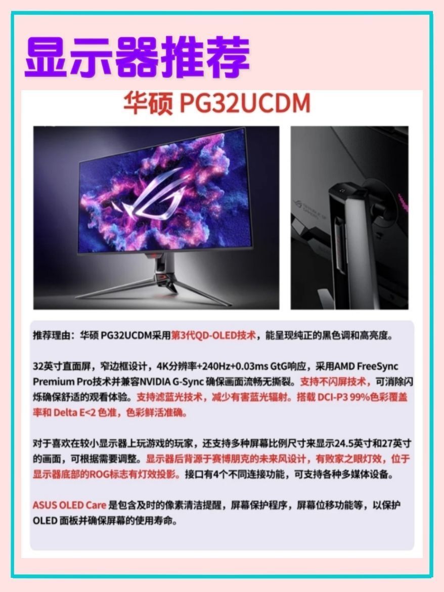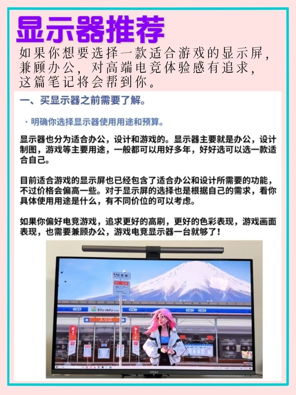 如果你想要选择一款适合打游戏的显示器,兼顾办公,并且对于高端电竞体验感有追求,可以看这篇笔记,会分享怎么选以及游戏显示器推荐。 买显示器之前需要了解。 显示器怎么选? 显示器推荐! 3款4K显示器推荐! 微星MPG 321URX QD-OLED 采用新一代三星 QD-OLED面板,能够呈现纯黑色场景。32英寸直 面屏,4K分辨率+240Hz+0.03ms GtG响应,支持 VESA Adapti...