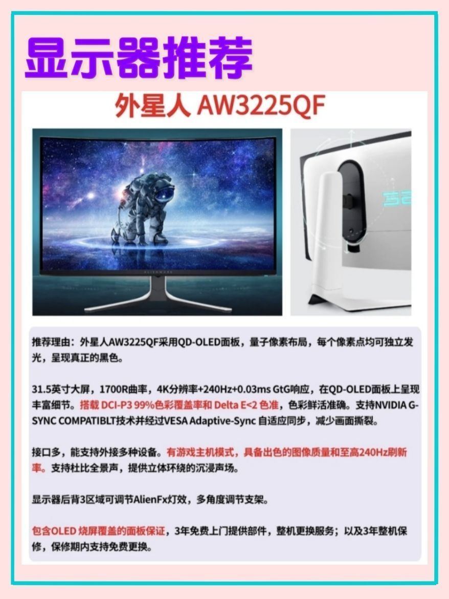 本篇笔记关联了Alienware/外星人 AW3225QF 31.5英寸 240Hz 4K 显示器 全屏光影同步 视觉增强黑科技 黑白色、Asus/华硕 ROG PG32UCDP 超神32pro 32英寸 240Hz 4K 显示器 HDR400 双模切换 黑色等商品,为用户提供真实的使用体验和购买参考。