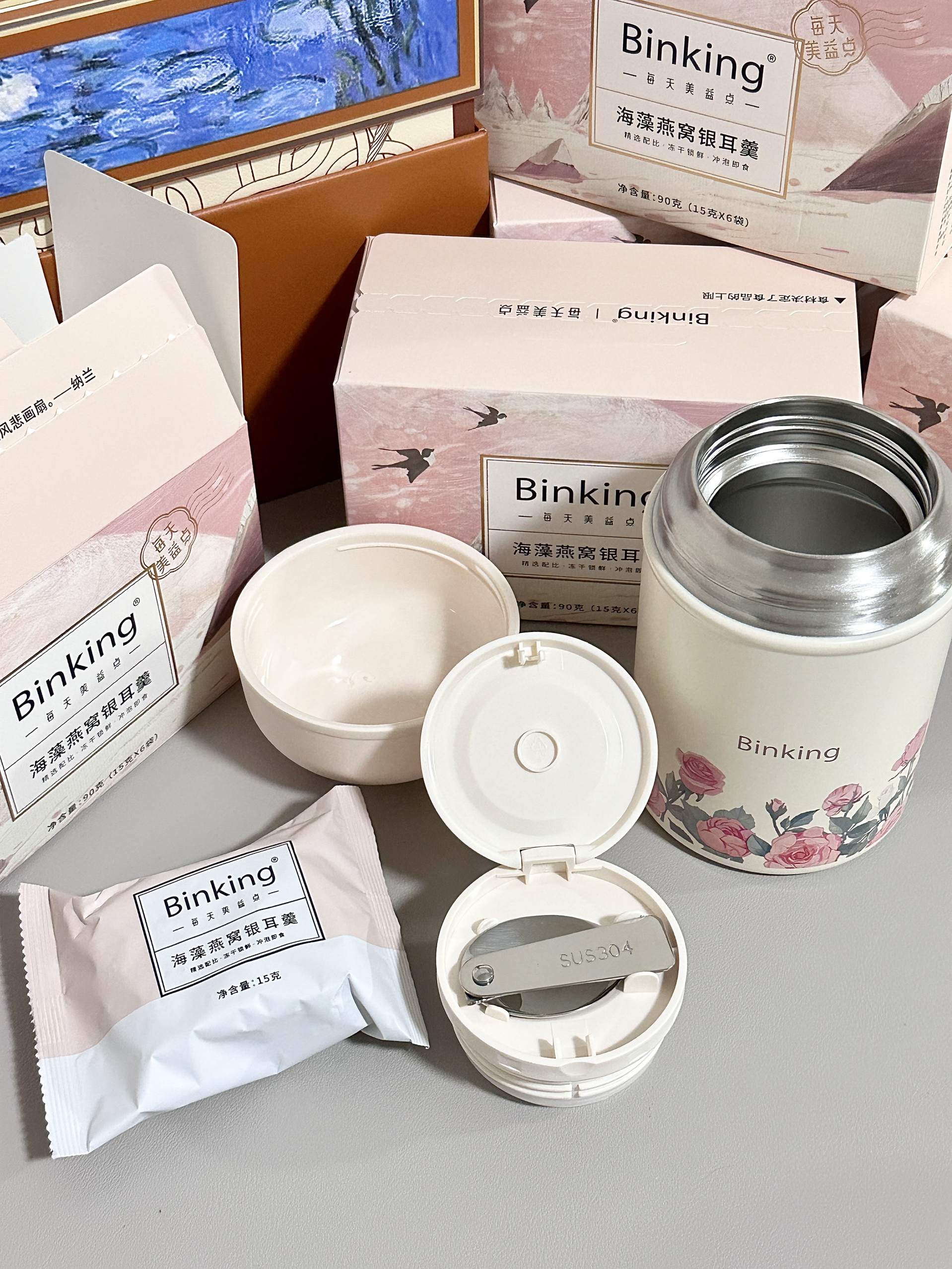 BinKing你是懂俺们女孩子的 是海藻燕窝银耳羹限定礼盒哎 礼盒包装仪式感一下拉满 还附赠了一个焖烧杯 直接用热水冲泡我感觉很方便 配料表hin干净 口感很细腻 每袋都是独立包装 随身携带也好方便 这次七夕不知道送什么礼物的直接抄作业!!