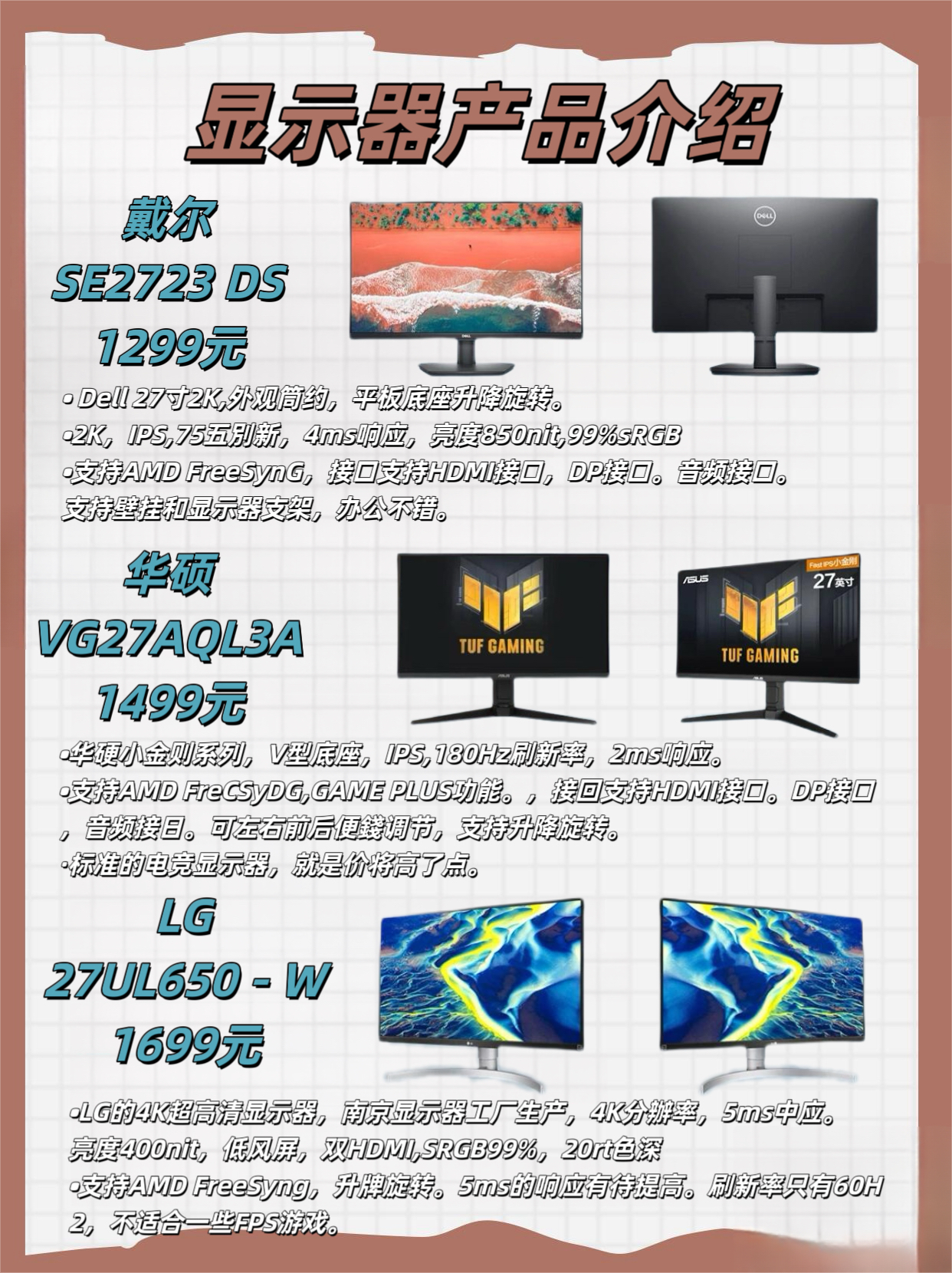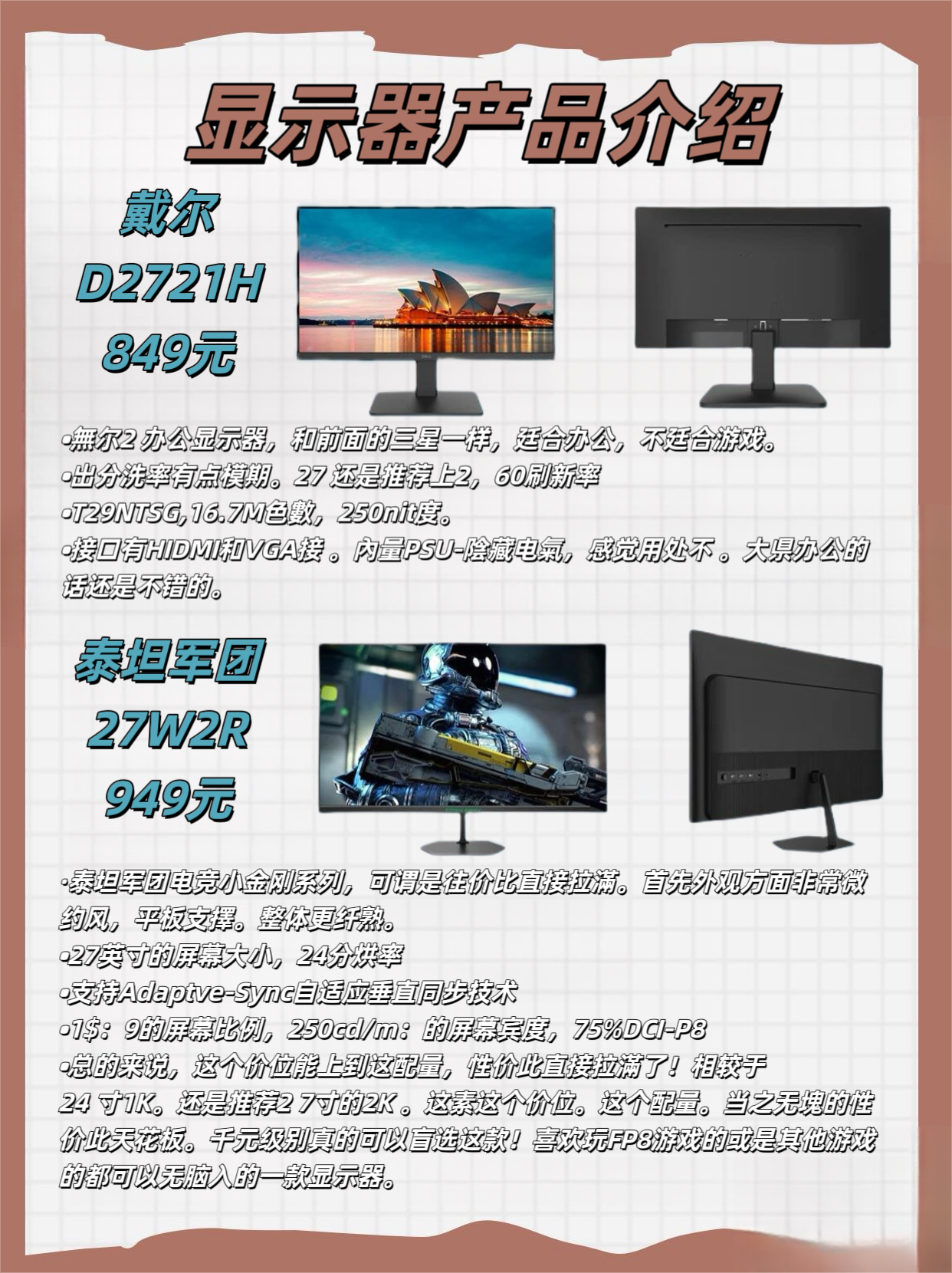 本篇笔记关联了Dell/戴尔 D2721H 27英寸1080P广视角显示器 D2721H、TITAN ARMY/泰坦军团 P28H2V 28英寸 144Hz 4K 显示器 广色域 智能分屏 黑色、Samsung/三星 S27A700NWC 27英寸 60Hz 4K 显示器 窄边框 护眼 液晶 外接 IPS屏 设计 制图 可壁挂 屏幕 直屏 分屏 黑色等商品,为用户提供真实的使用体验和购买参考。