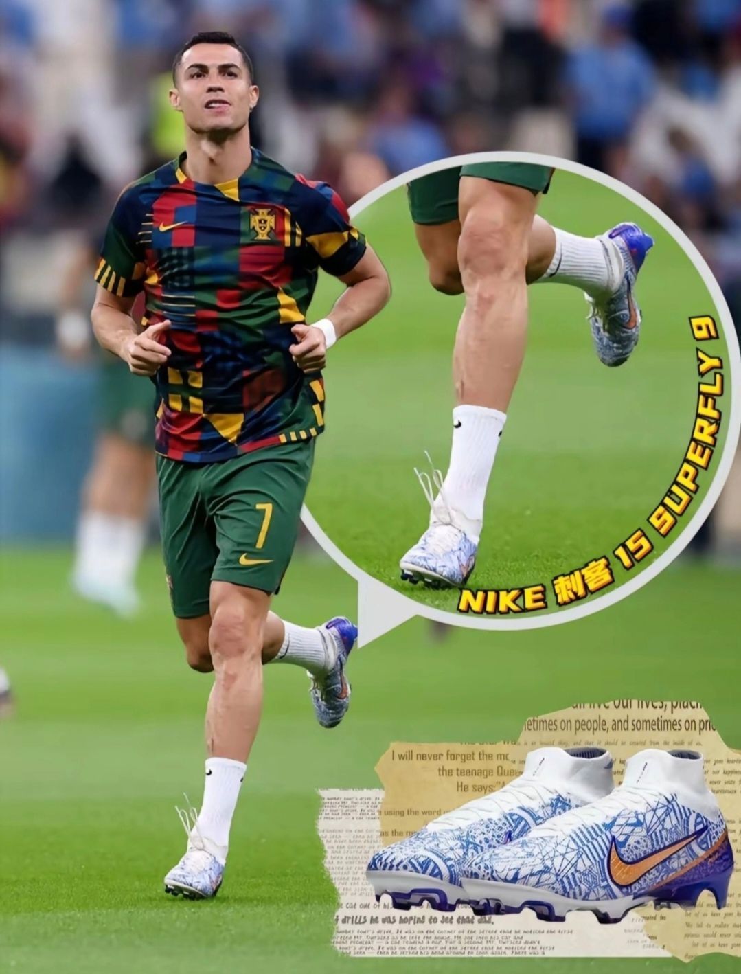 C罗:作为耐克的顶级代言人,C罗在卡塔尔世界杯上穿着的是Nike Zoom Mercurial Superfly 9 CR7。这款鞋以葡萄牙传统瓷砖花纹为灵感,鞋面采用多层复合结构的Vaporposite+,搭配SpeedCage支撑骨架和Flyknit飞织外层,不仅提升了穿着的舒适度,还增强了稳定性和控球感。底部Zoom Air气垫则提供了良好的减震和回弹效果,非常适合速度型和技术型球员。