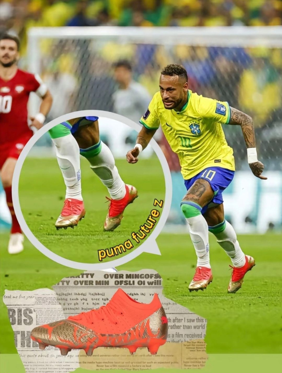 巴西球星内马尔是彪马的代言人,他在世界杯上穿着的是Future NJR Dream Chaser。这款鞋主色调为橙色,配以金色,左右脚鞋头部分的PUMA Logo以及鞋带、内衬分别以蓝色和红色装饰,后跟上的PUMA Logo还以红蓝两色渐变效果呈现。自适应FUZIONFIT+压缩区域提升了脚型适应性与舒适性,底部的不对称动态运动系统则为球员提