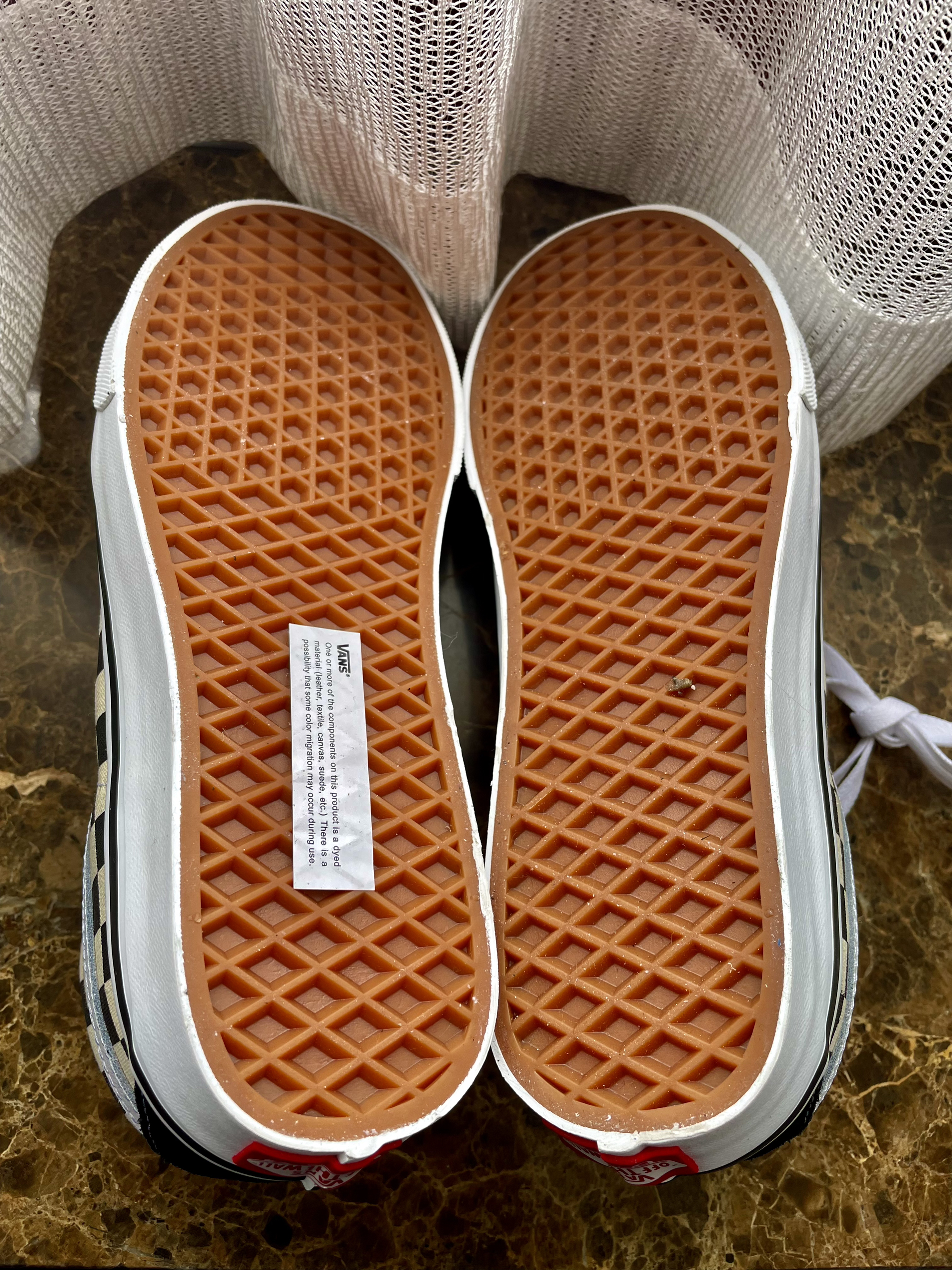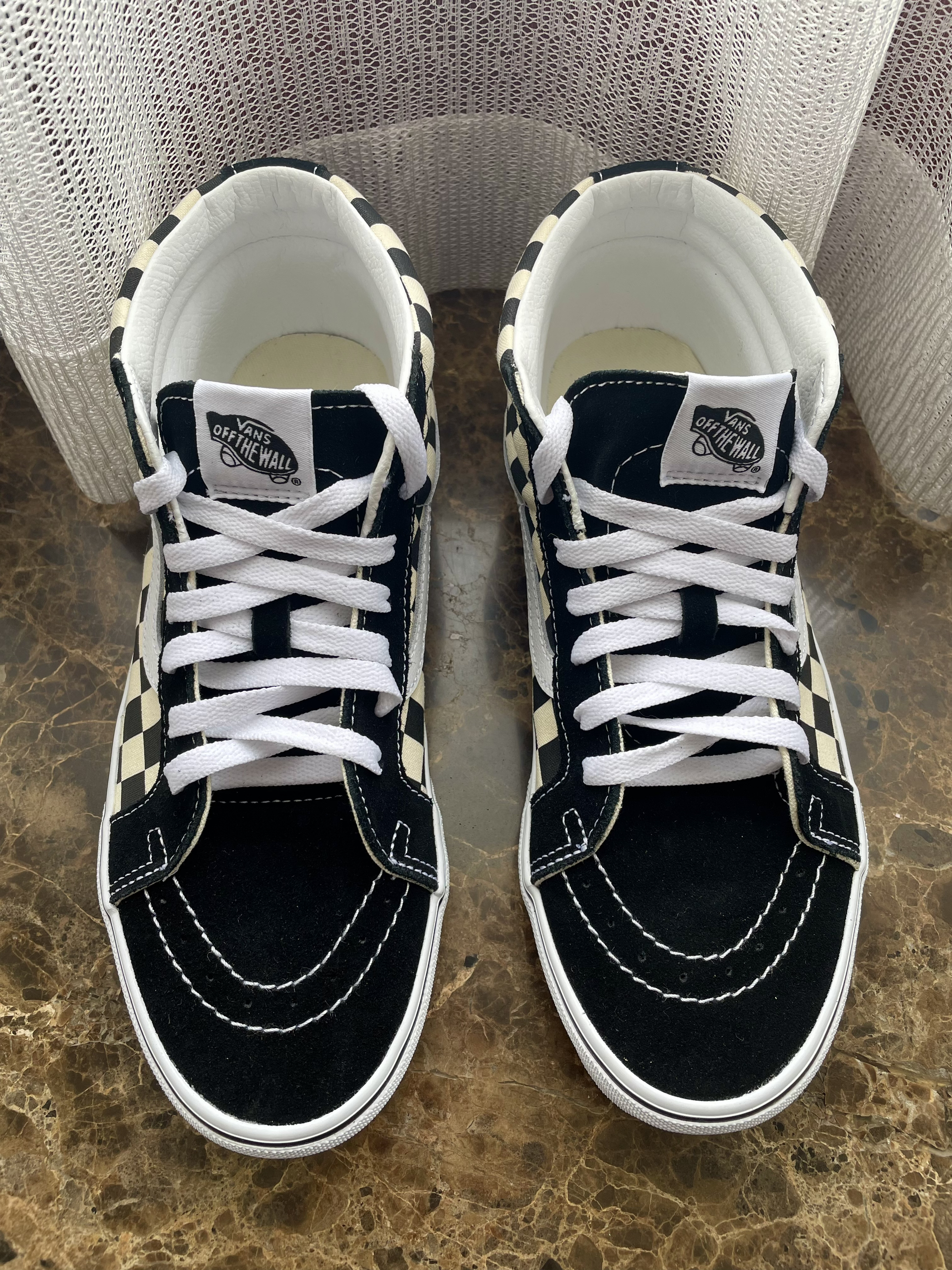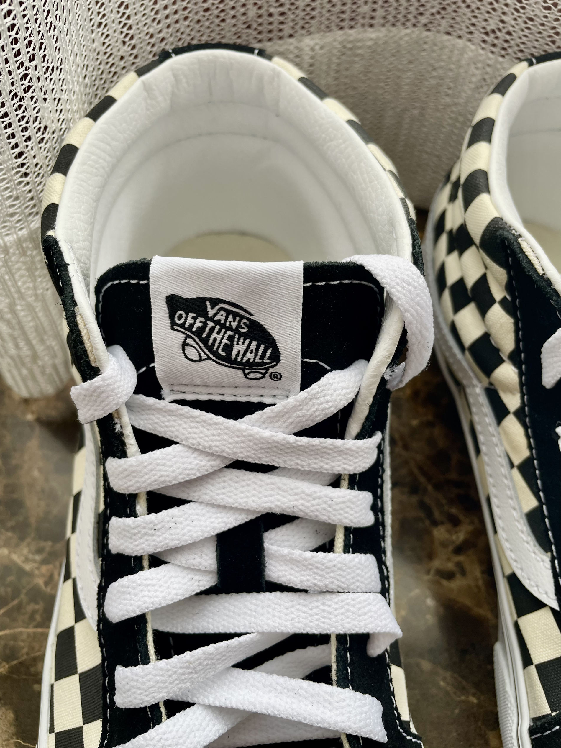 vans主力鞋型之一的ski8 中帮比高帮穿脱更容易一些。 经典的棋盘格加黑色。 上脚有点硬, 换一双鞋垫就好。