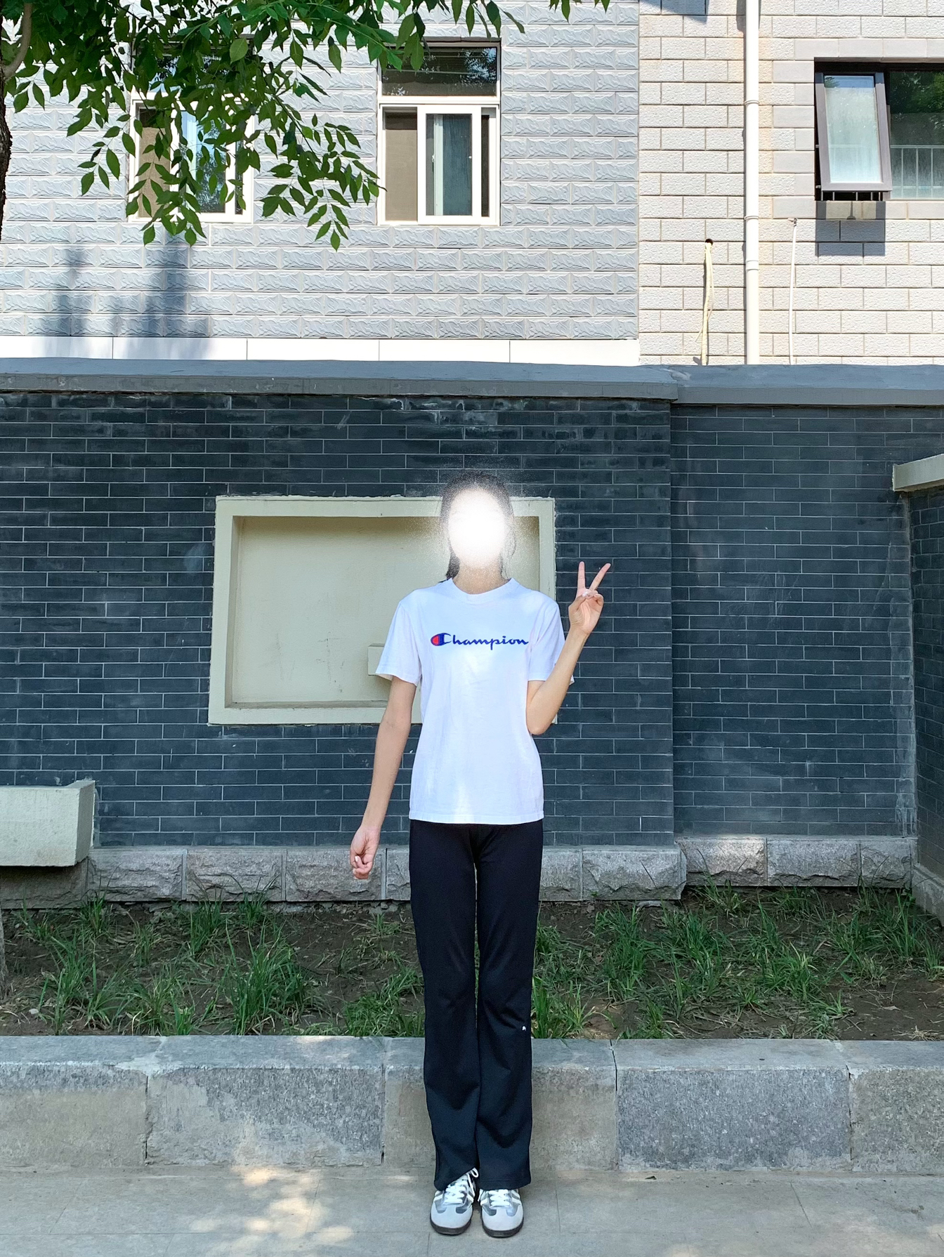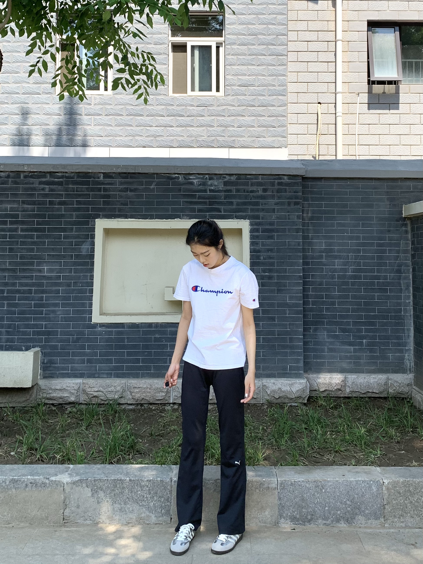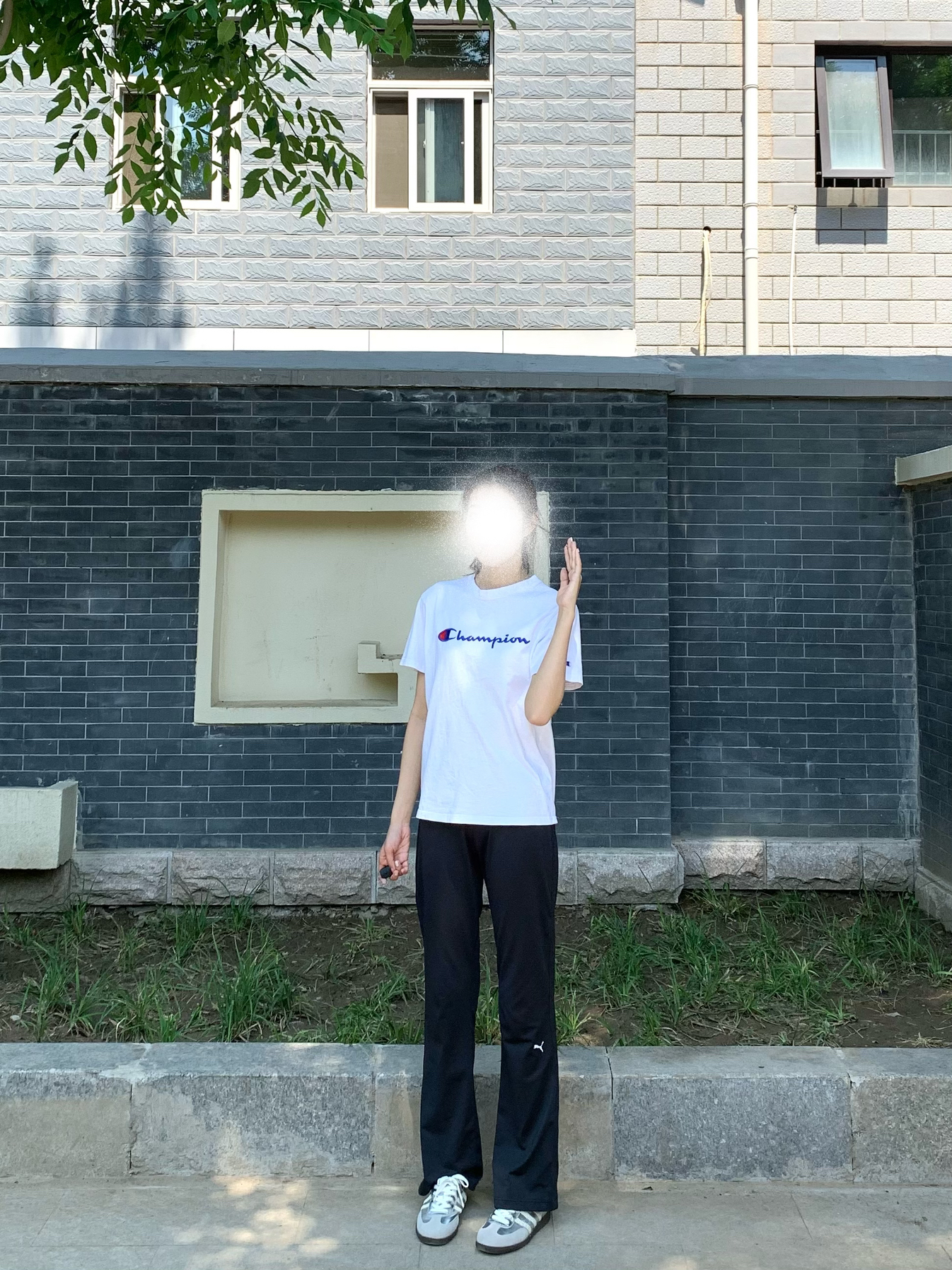hi~这里是高高的穿搭分享📸 最近超爱穿休闲运动风 👕Champion经典款 👖Puma 舒适度非常nice🥇 黑白配色很经典不会出错 裤子有点微喇的设计 真的很少见运动裤这么设计🤓 更加时尚