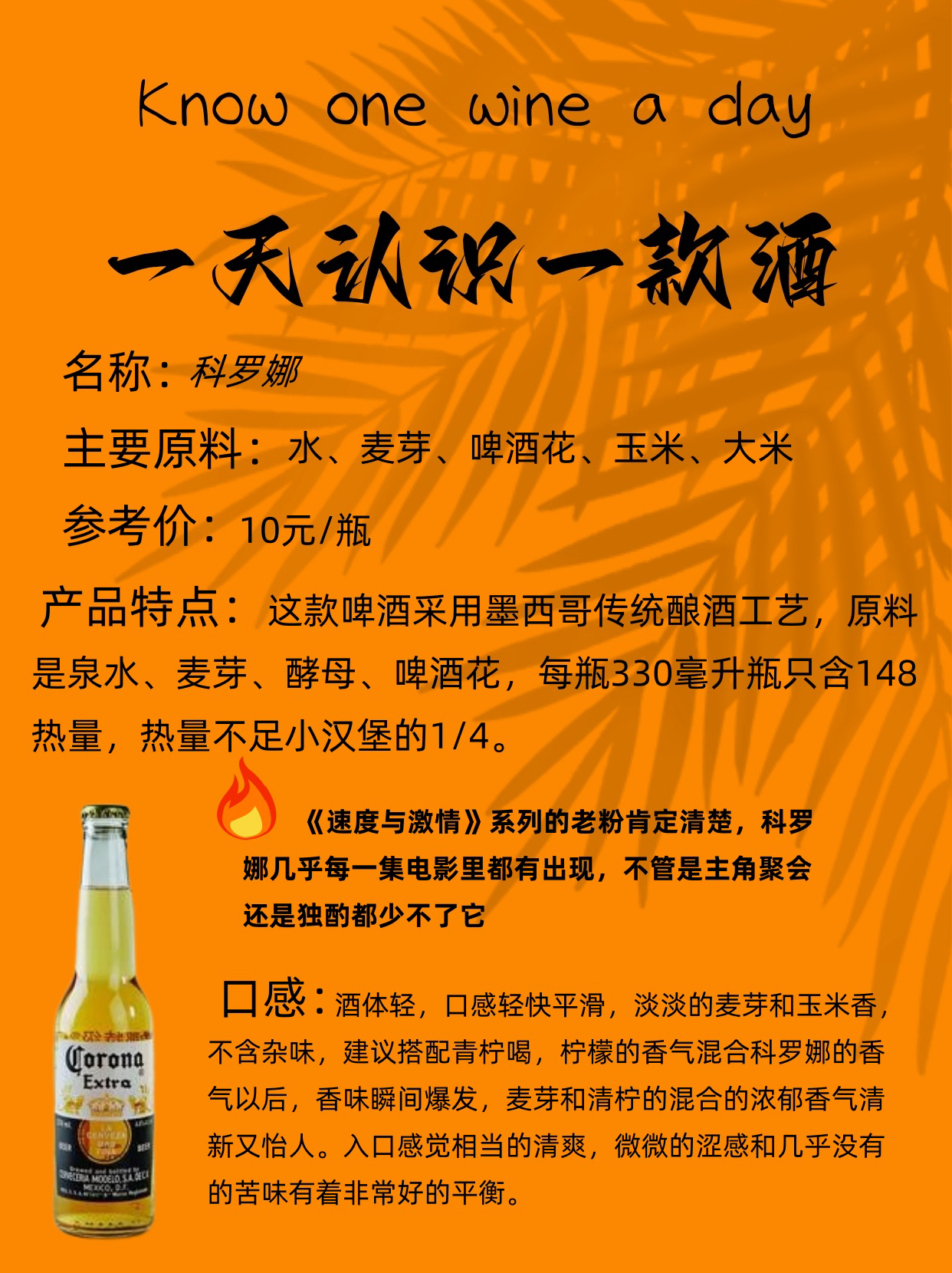 🍻科罗娜🍻 · ⭐️《速度与激情》系列的老粉肯定清楚,科罗娜几乎每一集电影里都有出现,不管是主角聚会还是独酌都少不了它~ · 产地:墨西哥🇲🇽 度数:4.5%vol🍺 容量:330ml🧊 类型:工业拉格 参考价格:10元/瓶 · 口感:酒体轻,口感轻快平滑,淡淡的麦芽和玉米香,不含杂味,建议搭配青柠喝,柠檬的香气混合科罗娜的香气以后,香味瞬间爆发,麦芽和清柠的混合的浓郁香气清新又怡人。入口感觉相当...