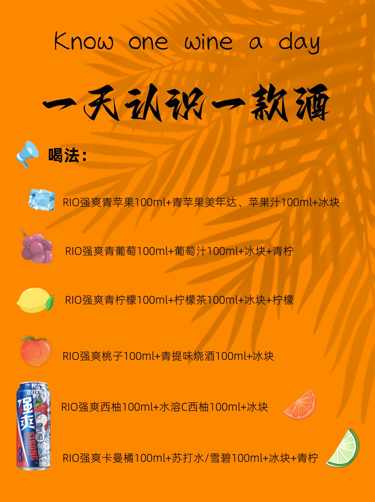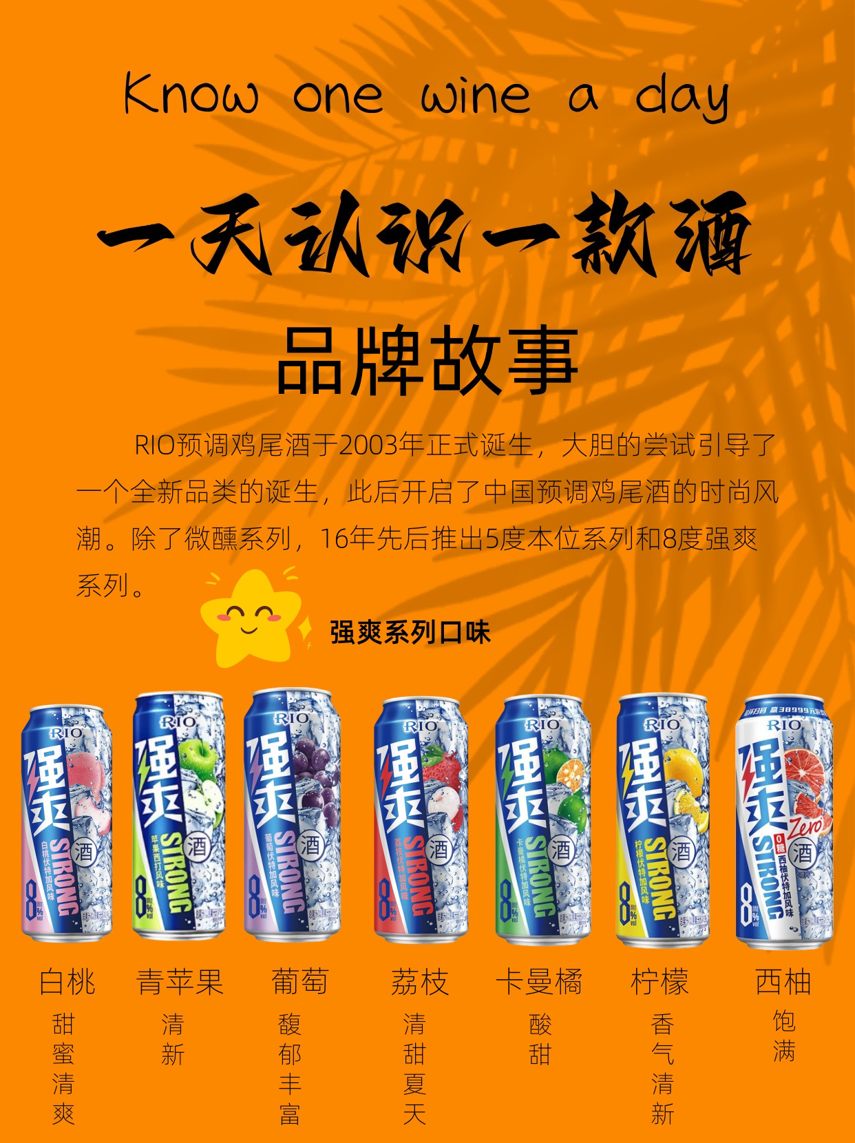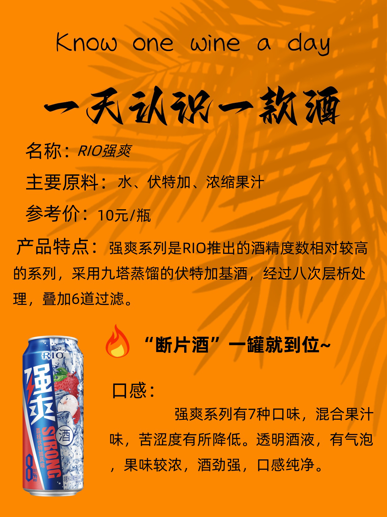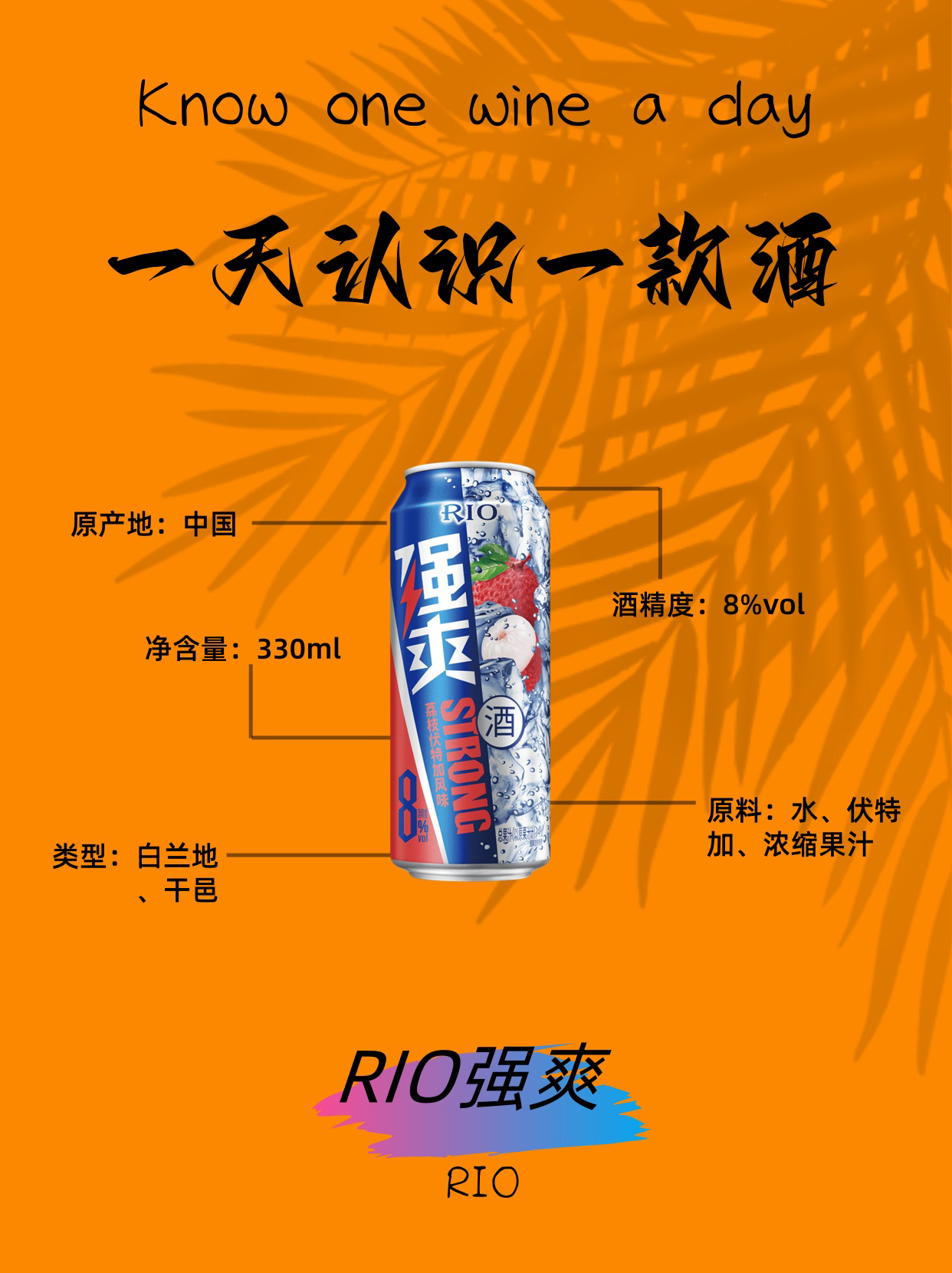 🍻RIO强爽🍻 · ⭐️“断片酒”一罐就到位” · 产地:中国🇨🇳 度数:8%vol🍺 容量:330ml🧊 类型:白兰地、干邑 参考价格:10元/罐 · 口感:强爽系列有7种口味,混合果汁味,苦涩度有所降低。透明酒液,有气泡,果味较浓,酒劲强,口感纯净。 · 🎖️🎖️-品牌故事- RIO预调鸡尾酒于2003年正式诞生,大胆的尝试引导了一个全新品类的诞生,此后开启了中国预调鸡尾酒的时尚风潮。除了微醺...